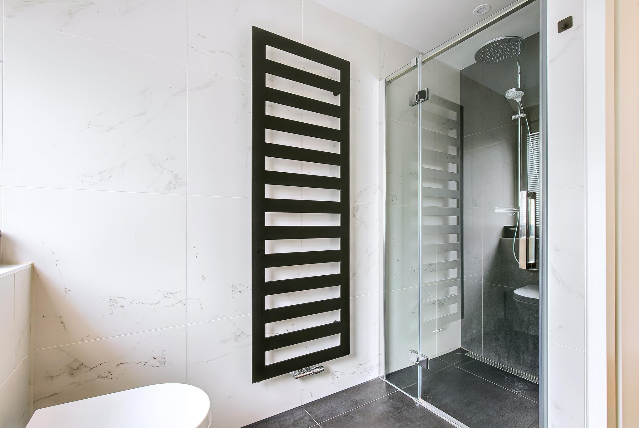 Wat direct opvalt is dat deze verdieping heerlijk licht is. De overloop is heerlijk ruim en geeft toegang tot de vierslaapkamers. Aan zowel de voor- als achterzijde beschik je over een ruime slaapkamer over de gehele breedte van de woning. Het is mogelijk om deze slaapkamers op de te delen in twee slaapkamers. Ook bevindt zich hier de tweede badkamer welke is voorzien van dezelfde fraaie tegels, inloopdouche, zwevend toilet, dubbele wastafel met meubel en design radiator. Het plafond is voorzien van sfeervolle inbouwspots. Op de overloop bevindt zich het luik met de vlizotrap naar de bergzolder.