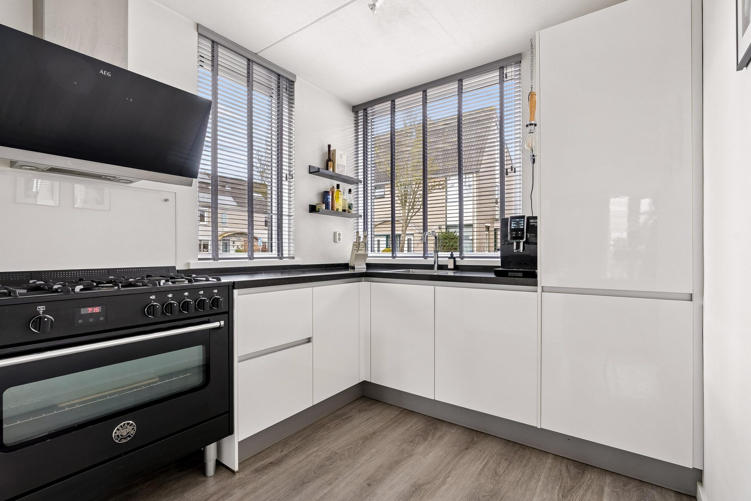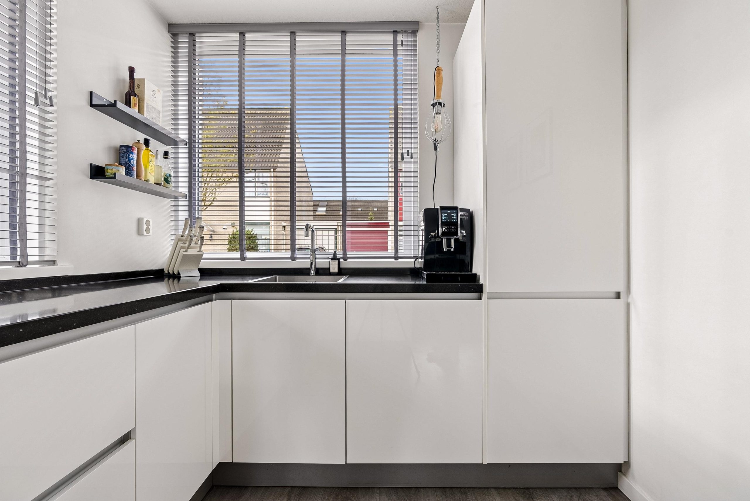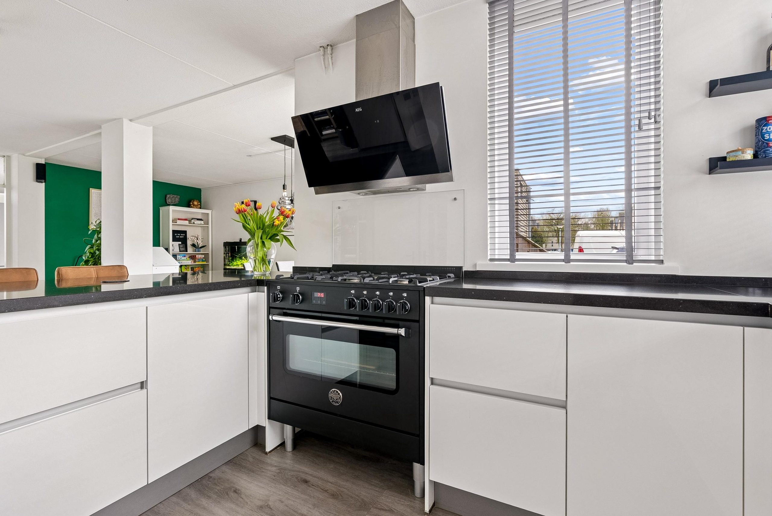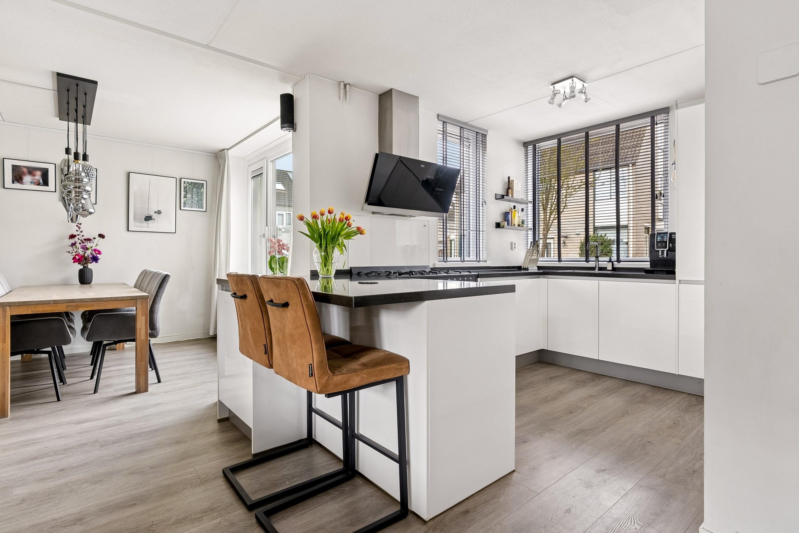 Aan de voorzijde bevindt zich de moderne U-vormige keuken (vernieuwd in 2020) in hoogglans witte uitvoering. De keuken is voorzien van diverse inbouwapparatuur, waaronder een koelkast, oven, vaatwasser, 5-pits gasfornuis en afzuigkap. Dankzij de praktische indeling beschik je over veel werk- en bergruimte. De gezellige baropstelling maakt het de perfecte plek voor een borrel of gezellig ontbijtje.