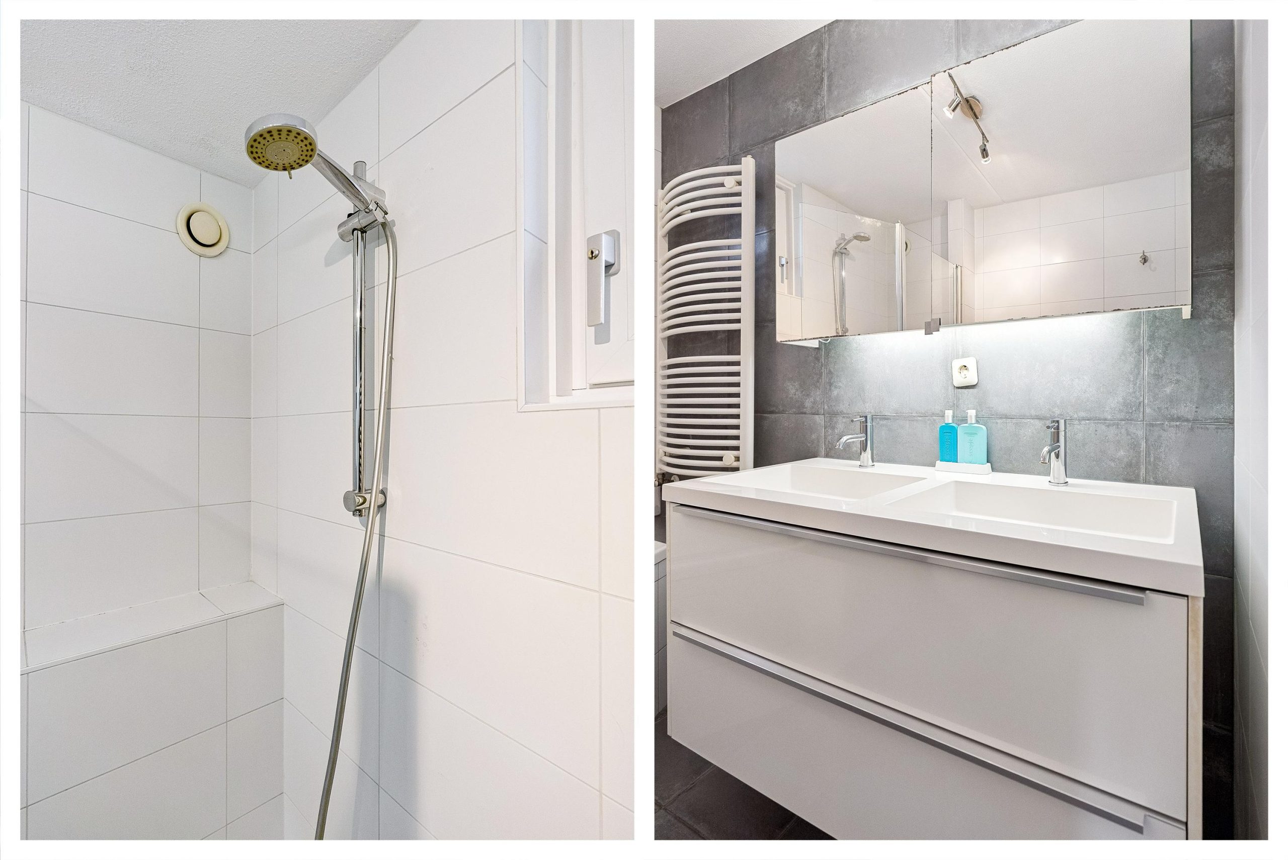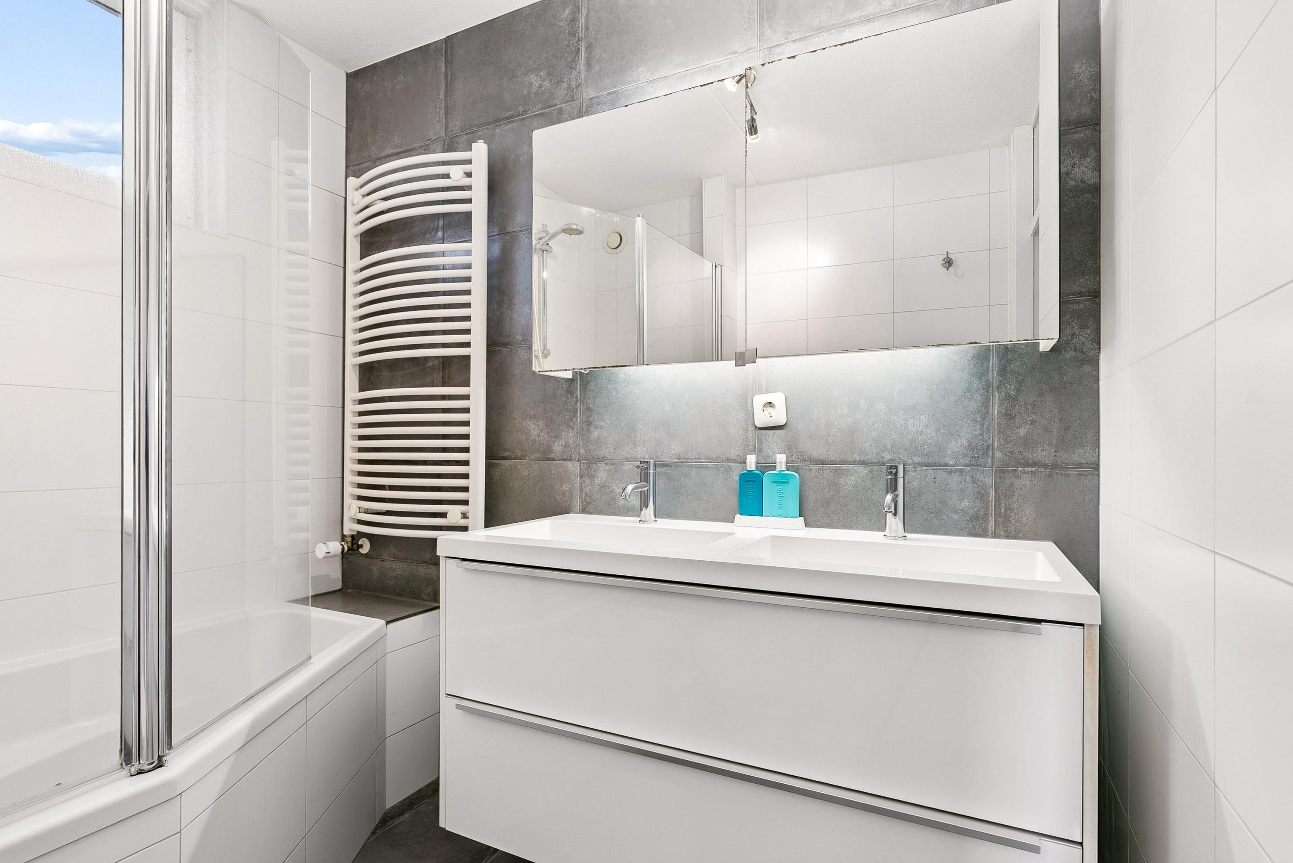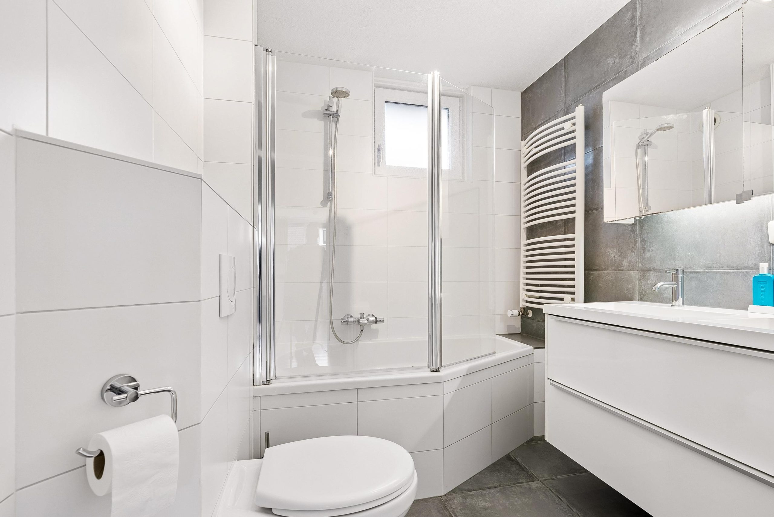 De badkamer is netjes afgewerkt in een lichte, neutrale kleurstelling en voorzien van een toilet, dubbele wastafel met meubel, design handdoekradiator en een douche-/badcombinatie.