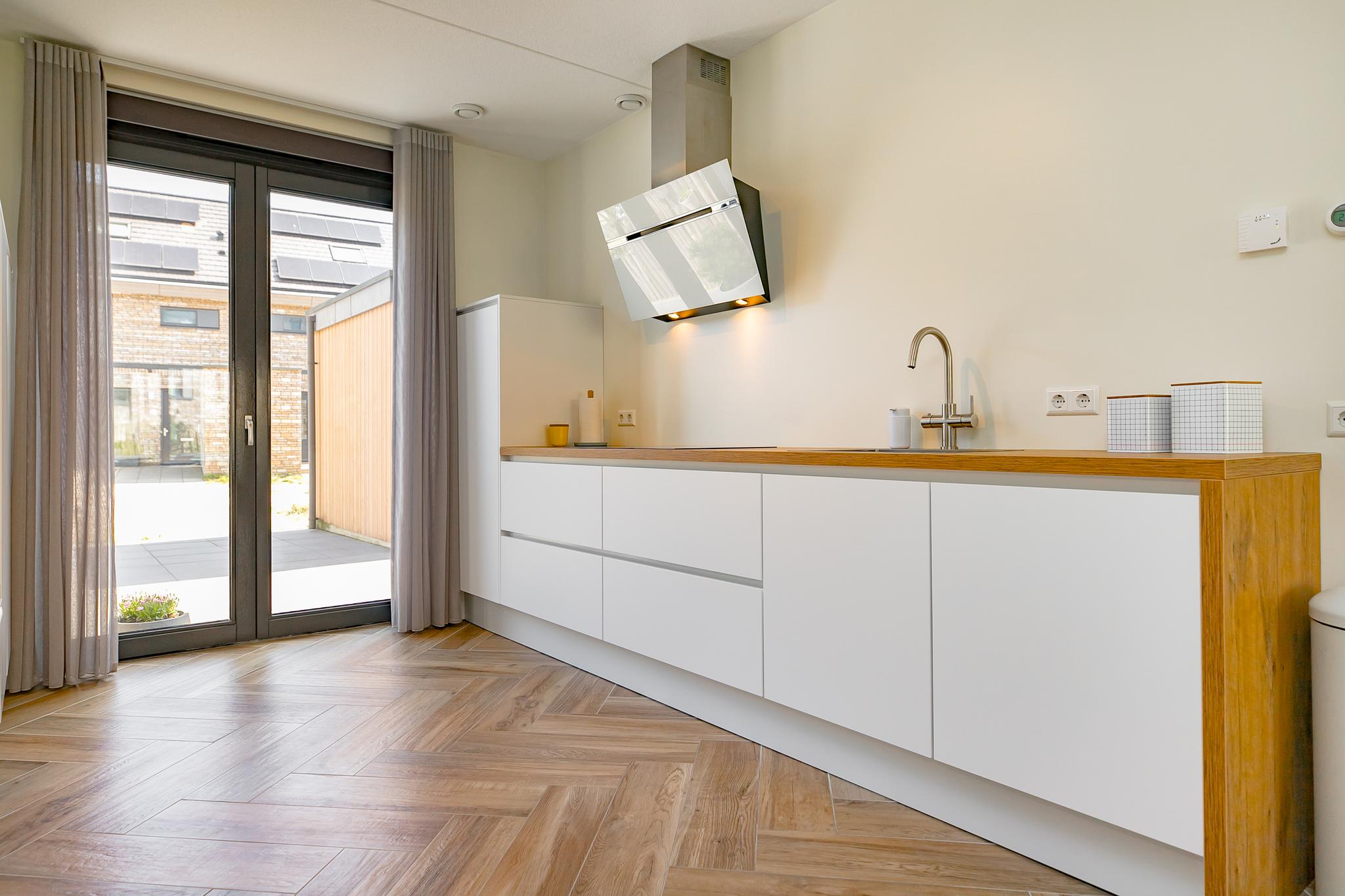 Entree met ruime hal, met plek voor de garderobe, separaat toilet en toegang tot de woonkamer. De gehele beneden verdieping is voorzien van comfortabele vloerverwarming en afgewerkt met keramisch parket in visgraat gelegd. De keuken is gesitueerd aan de voorzijde met een ontzettend leuk zitplekje midden in de keukenopstelling. Dit geeft een speels effect in het geheel. De luxe keuken is voorzien van kwalitatief goede apparatuur denk aan een inbouw vaatwasser, koelkast en vriezer (separaat ingebouwd), oven, 5 pits inductie kookplaat en afzuigkap. Alle apparatuur is van het merk Bosch. Daarnaast is er een kokend waterkraan aanwezig van het merk Floww. Het voordeel van de Floww kraan is dat deze weinig ruimte in beslag neemt in de keukenkast waardoor je meer plek overhoudt om het een en ander op te bergen. Het raam in de keuken betreft een draai-kiep deur, dit was een extra optie vanuit de nieuwbouw.