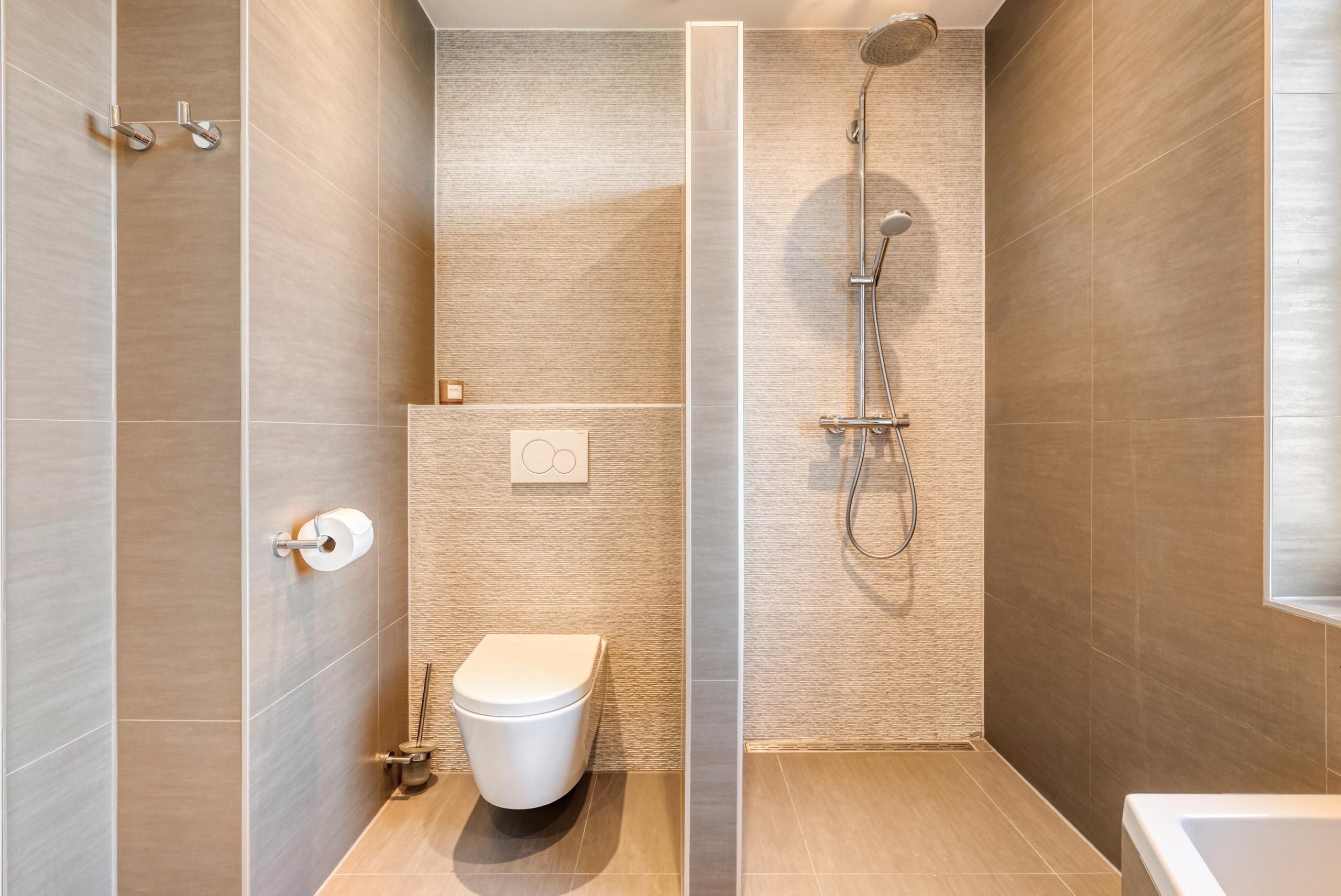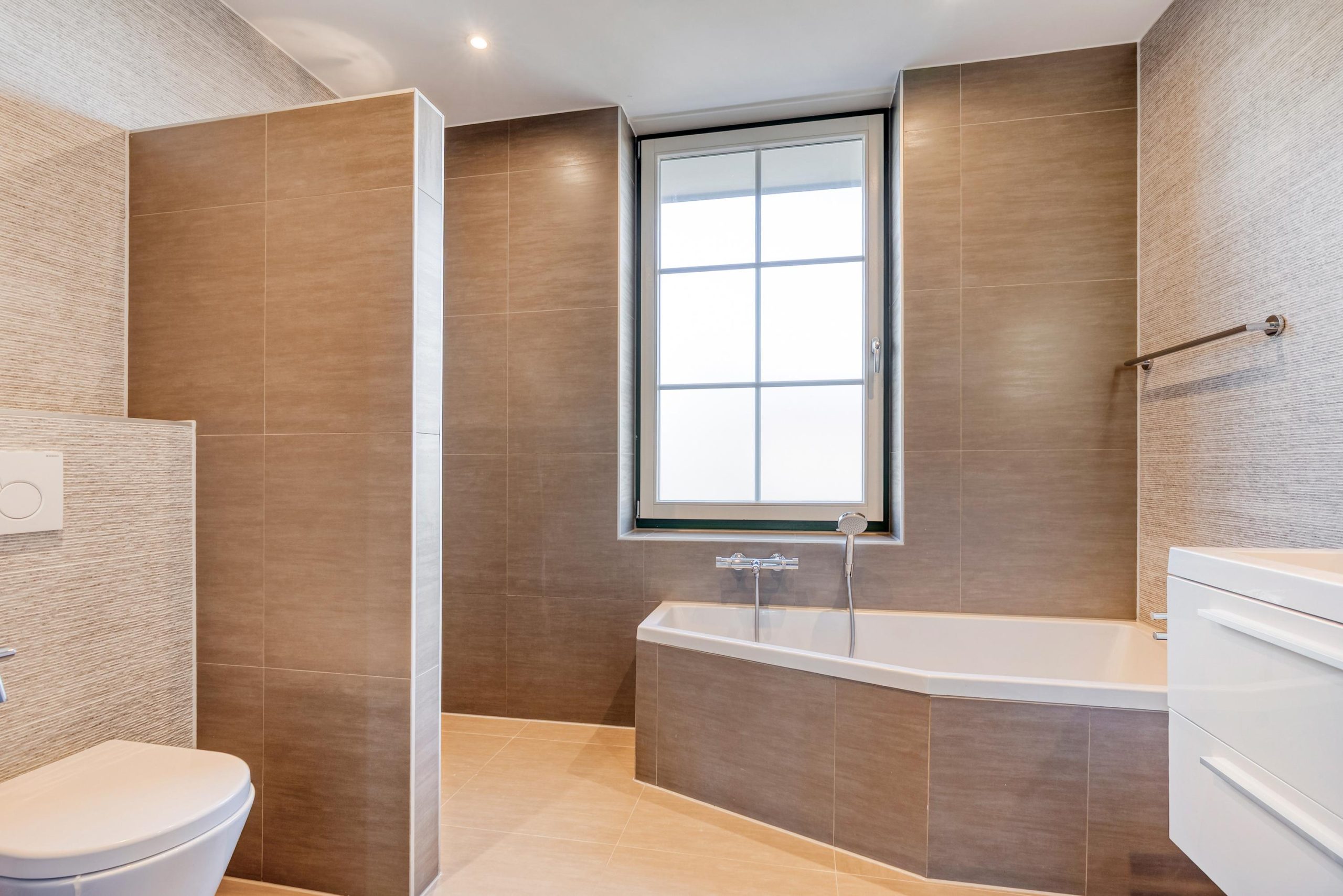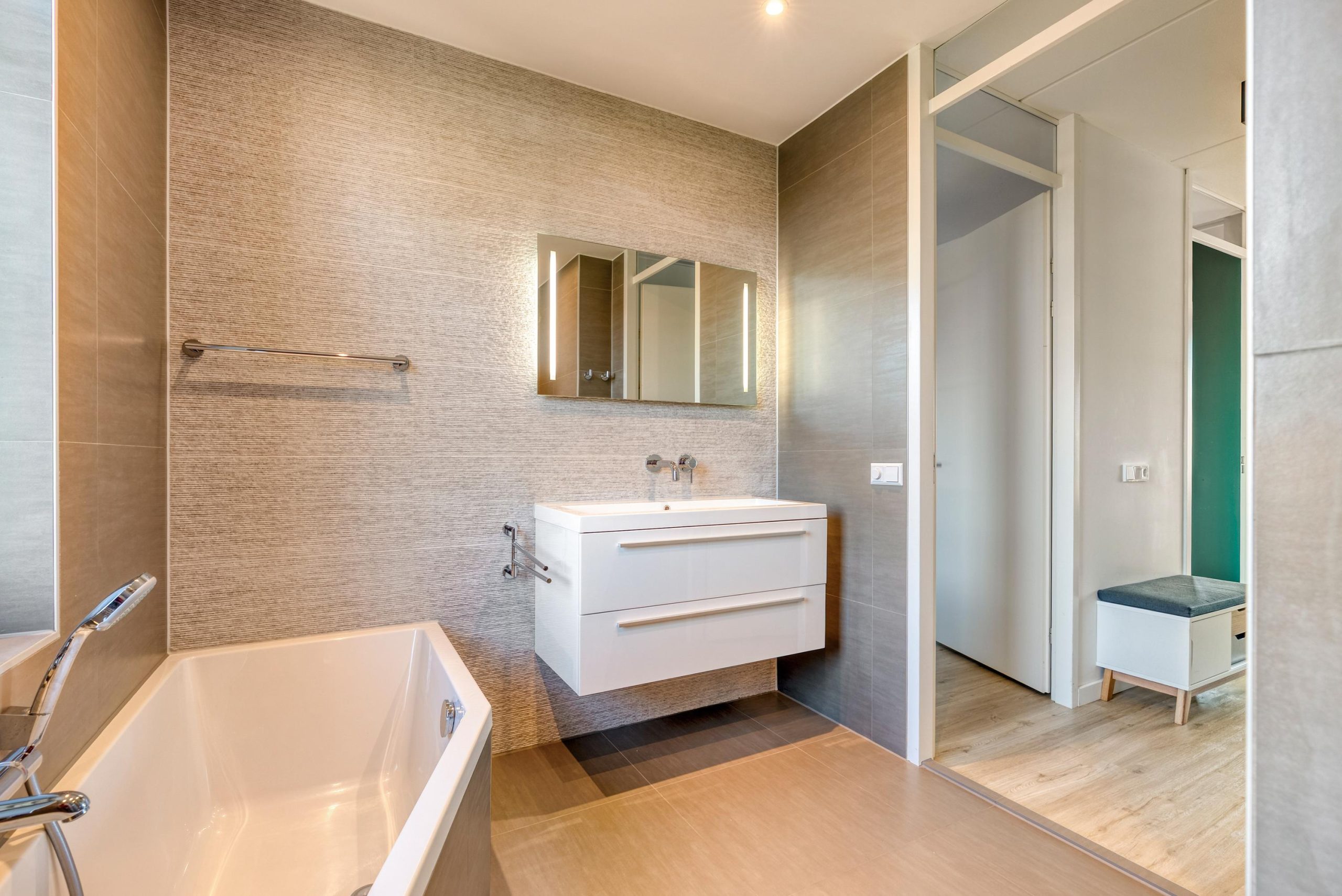 Overloop met toegang tot de drie slaapkamers en de moderne badkamer. Aan de achterzijde heb je de master bedroom en de tweede slaapkamer. Aan de voorzijde ligt de derde slaapkamer en de badkamer. De badkamer is modern en voorzien van toilet, wastafel met meubel, inloopdouche en ligbad. Het plafond in de badkamer is keurig strak gestuct en voorzien van sfeervolle inbouwspots