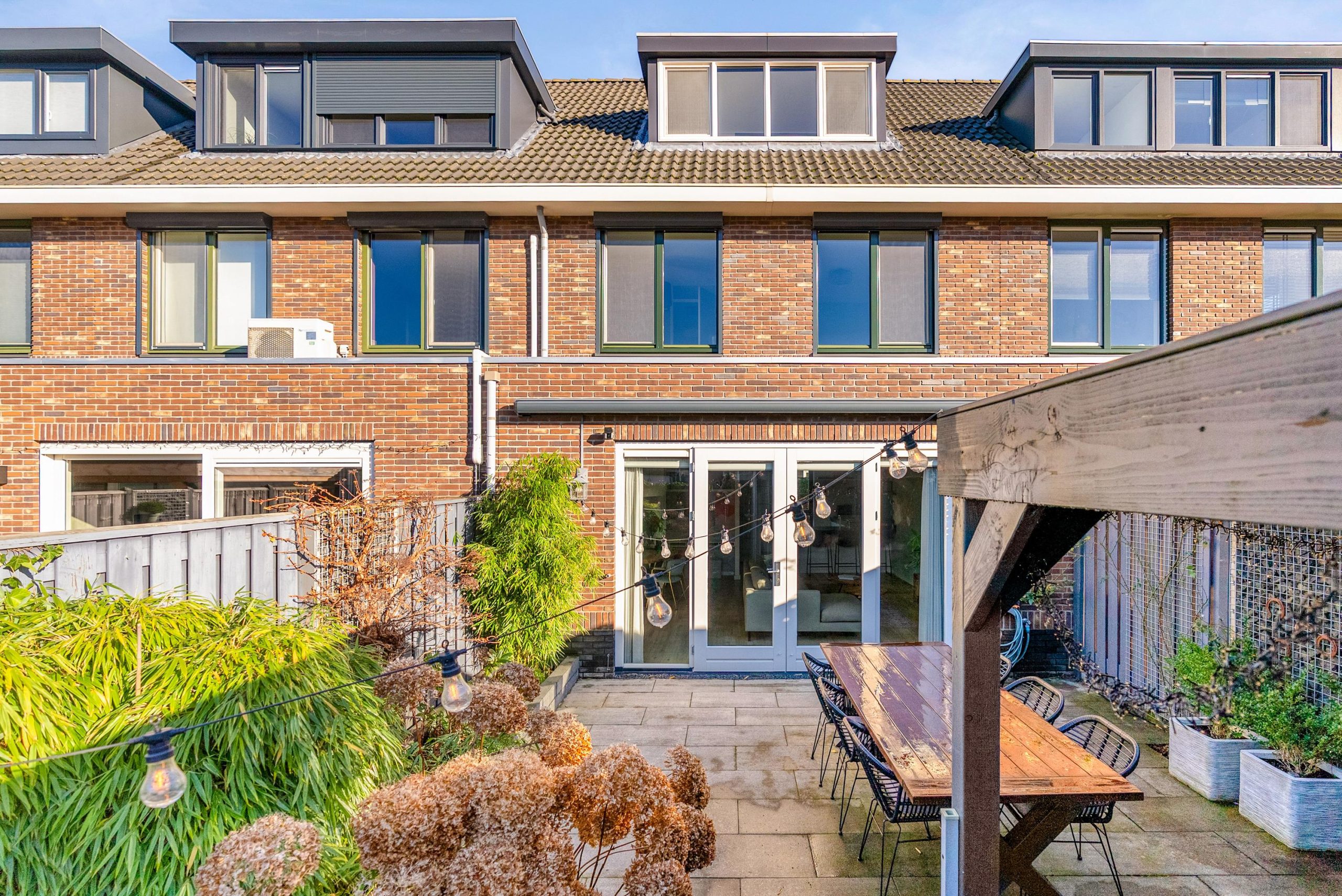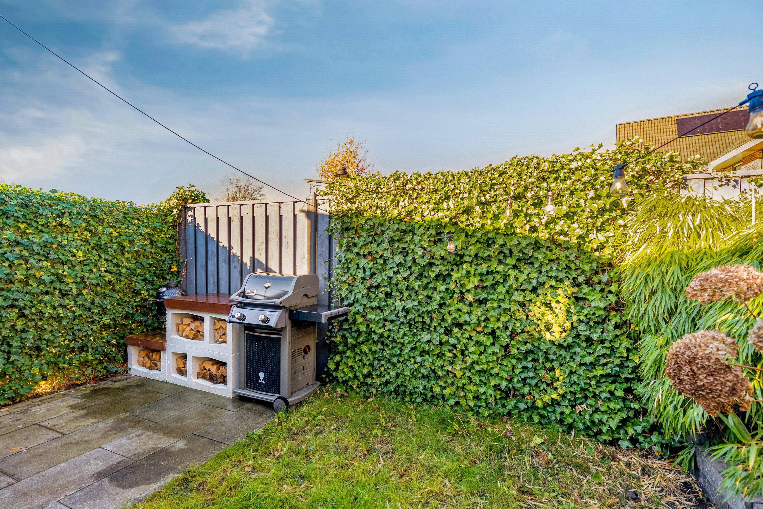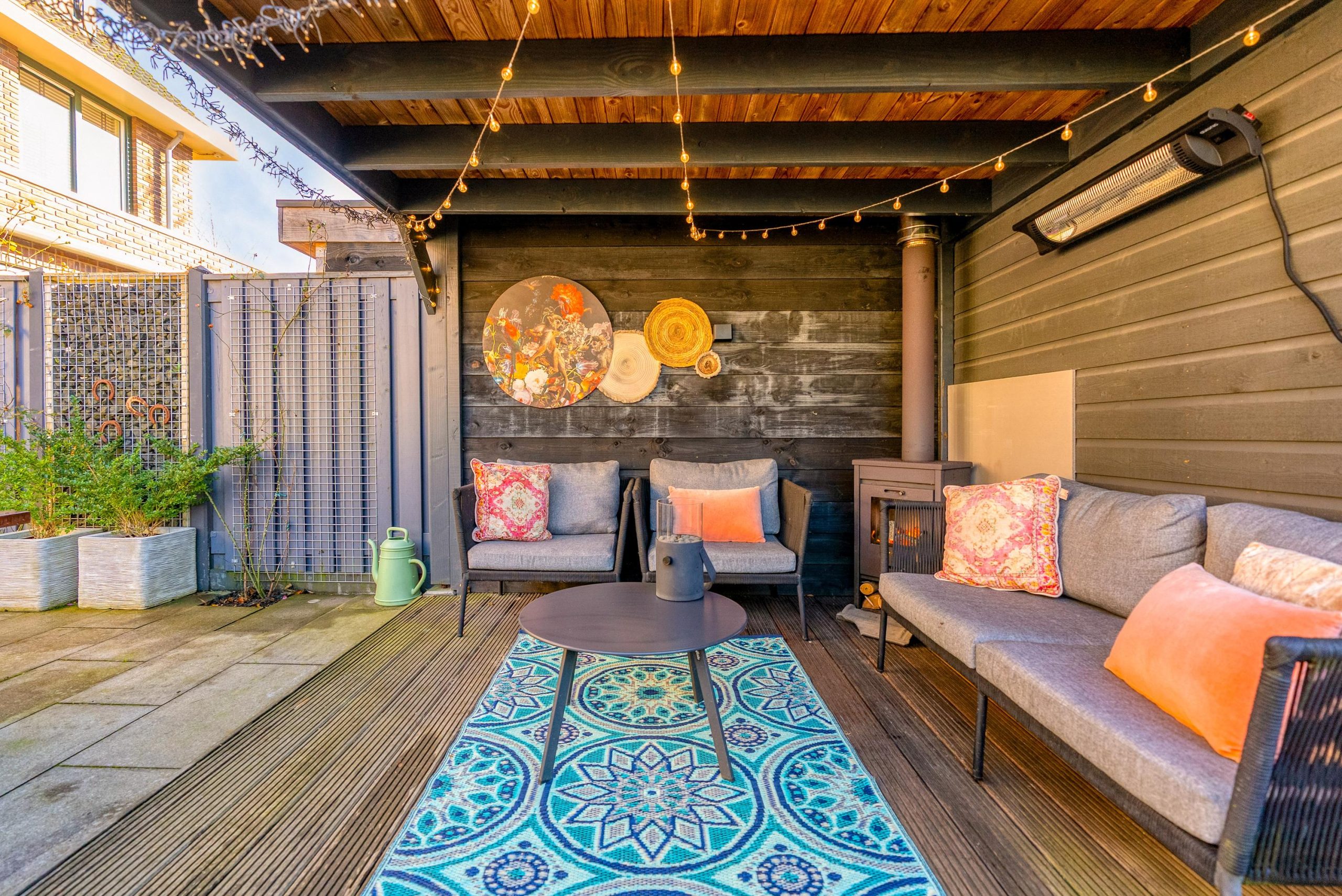 Middels de openslaande deuren kom je in de prachtig aangelegde tuin. De overkapping achterin de tuin is een fijne plek om vroeg zomer tot laat in het najaar heerlijk nog te zitten met de openhaard aan. Ook op warme dagen is dit een fijne plek die schaduw biedt. De tuin is namelijk gelegen op het zonnige zuidwesten waardoor je het merendeel van de dag kan genieten van de zon in je tuin. Een tuin is niet compleet zonder berging, deze is gelegen achterin de tuin en tevens beschik je over een achterom.
