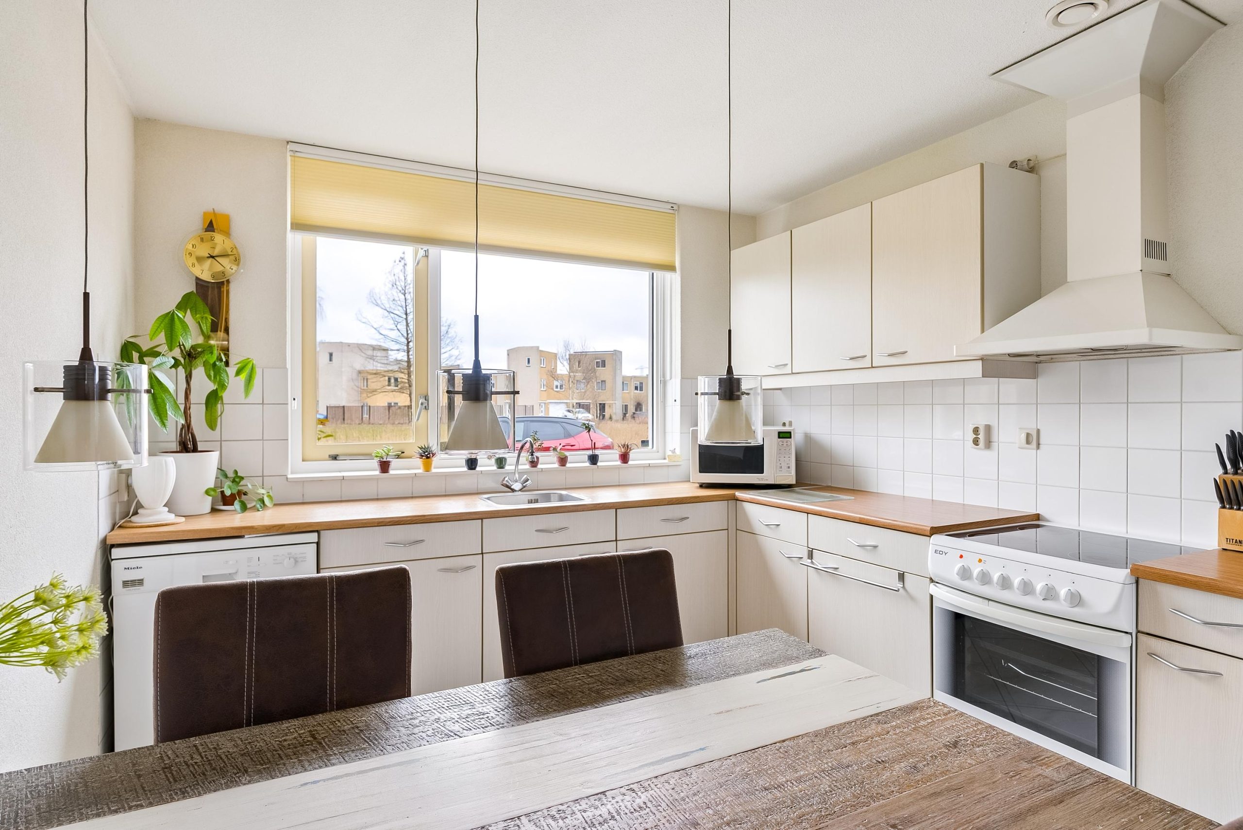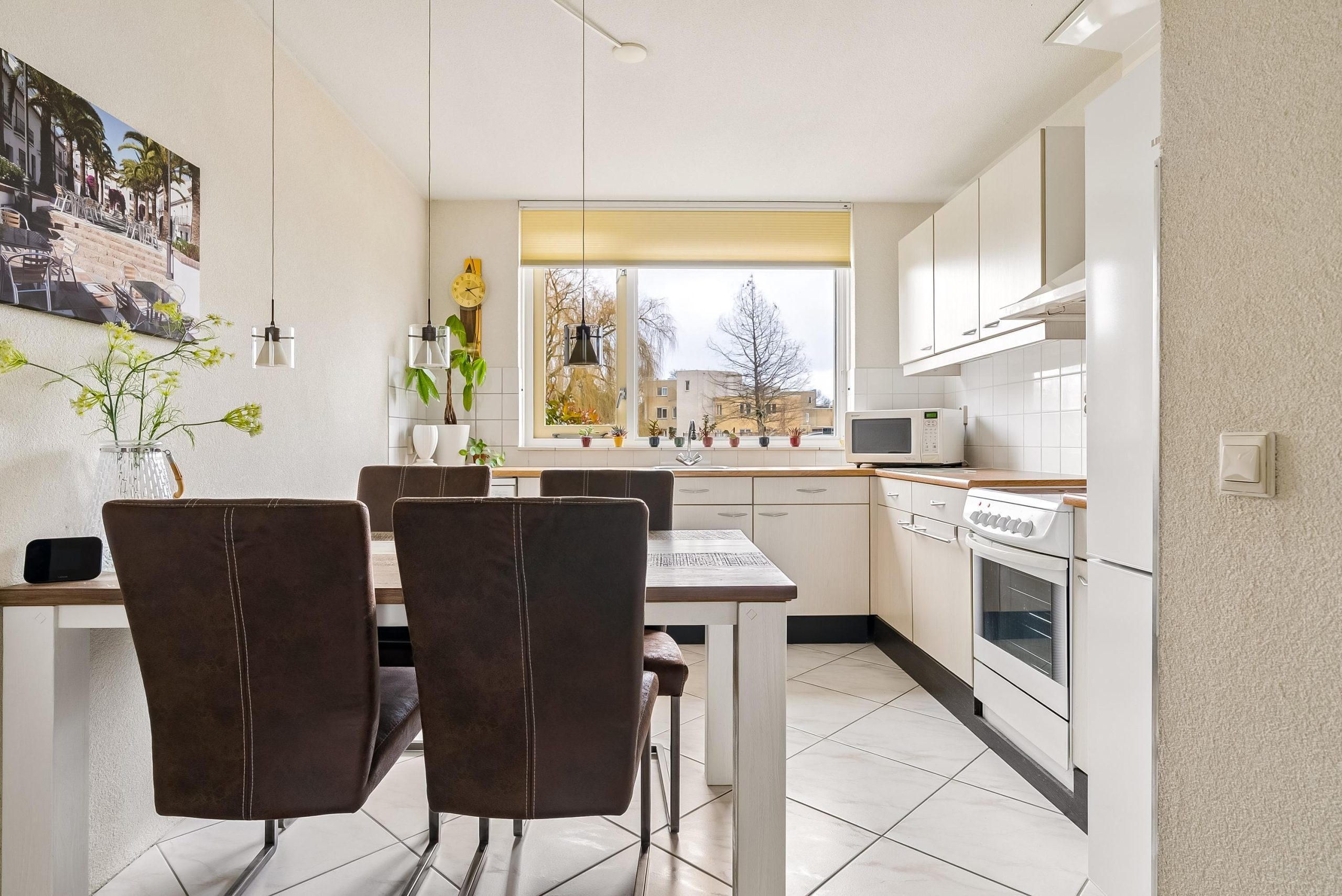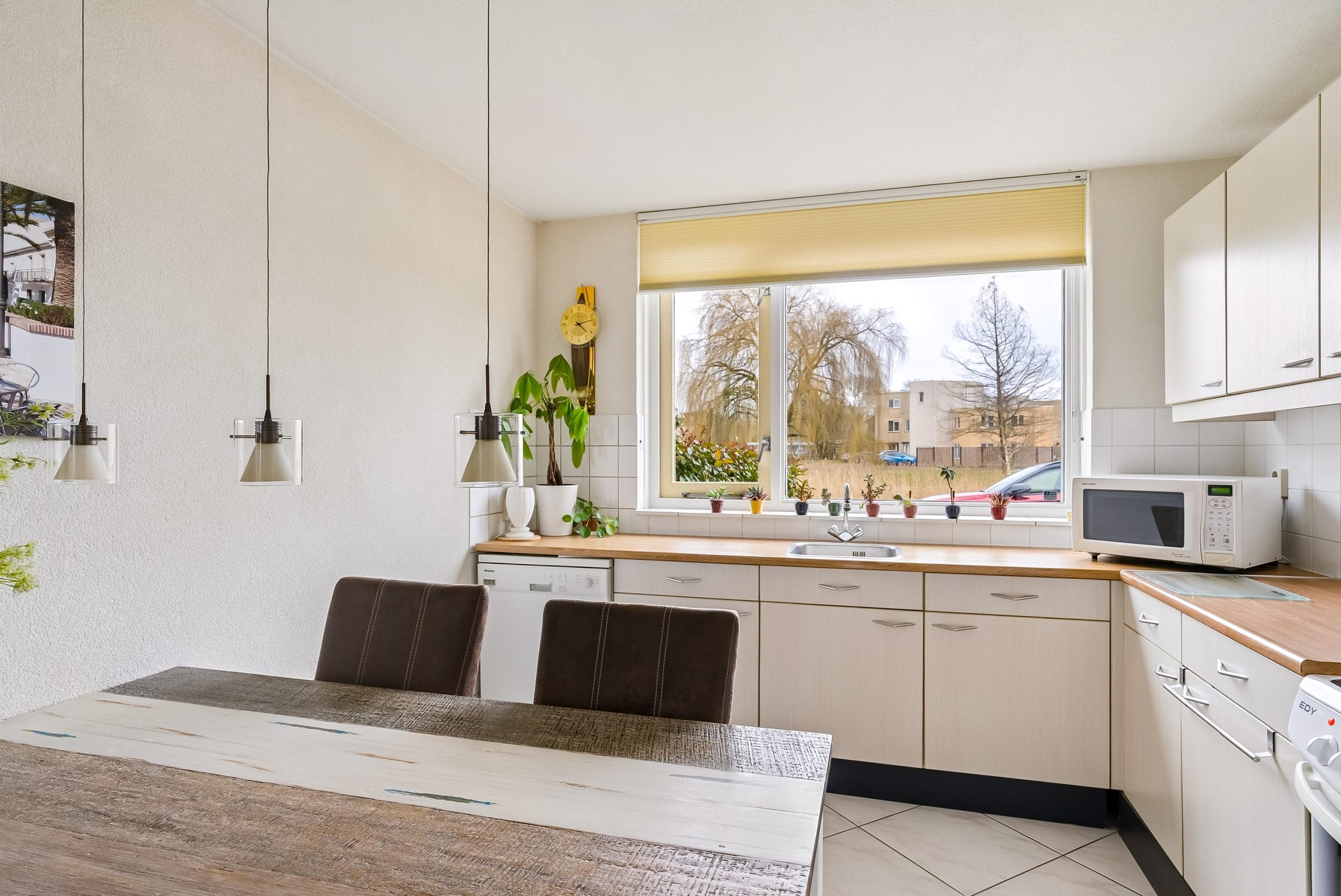 Aan de voorzijde is de keuken gelegen met verschillende losse apparatuur welke achter zal blijven in de woning. Vanuit de keuken kijk je heerlijk weg naar buiten richting het groen en het water. Dit is het unieke aan de woning dat je niet direct naar je buren kijkt. In de keuken is ruimte genoeg voor een ruime eettafel.