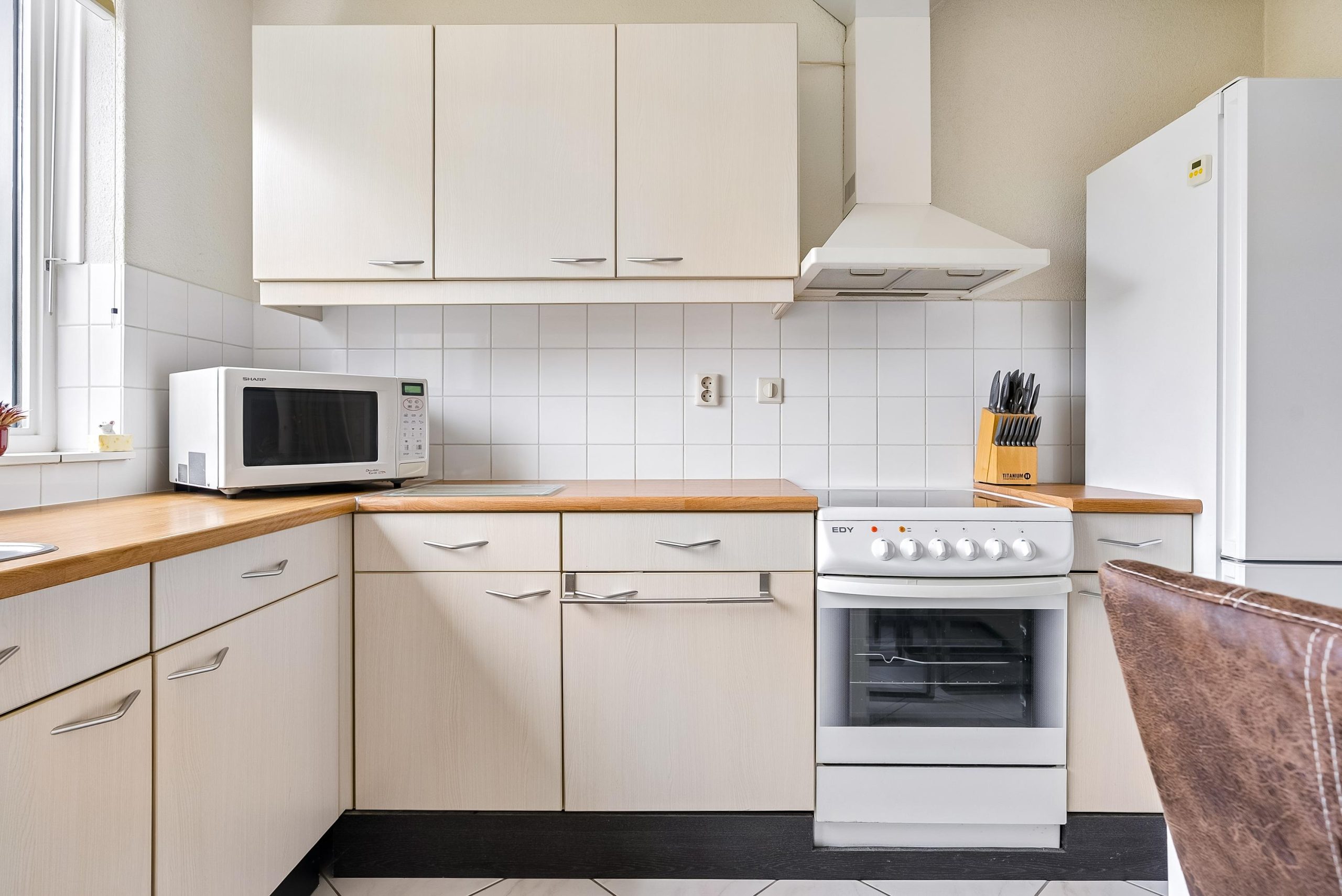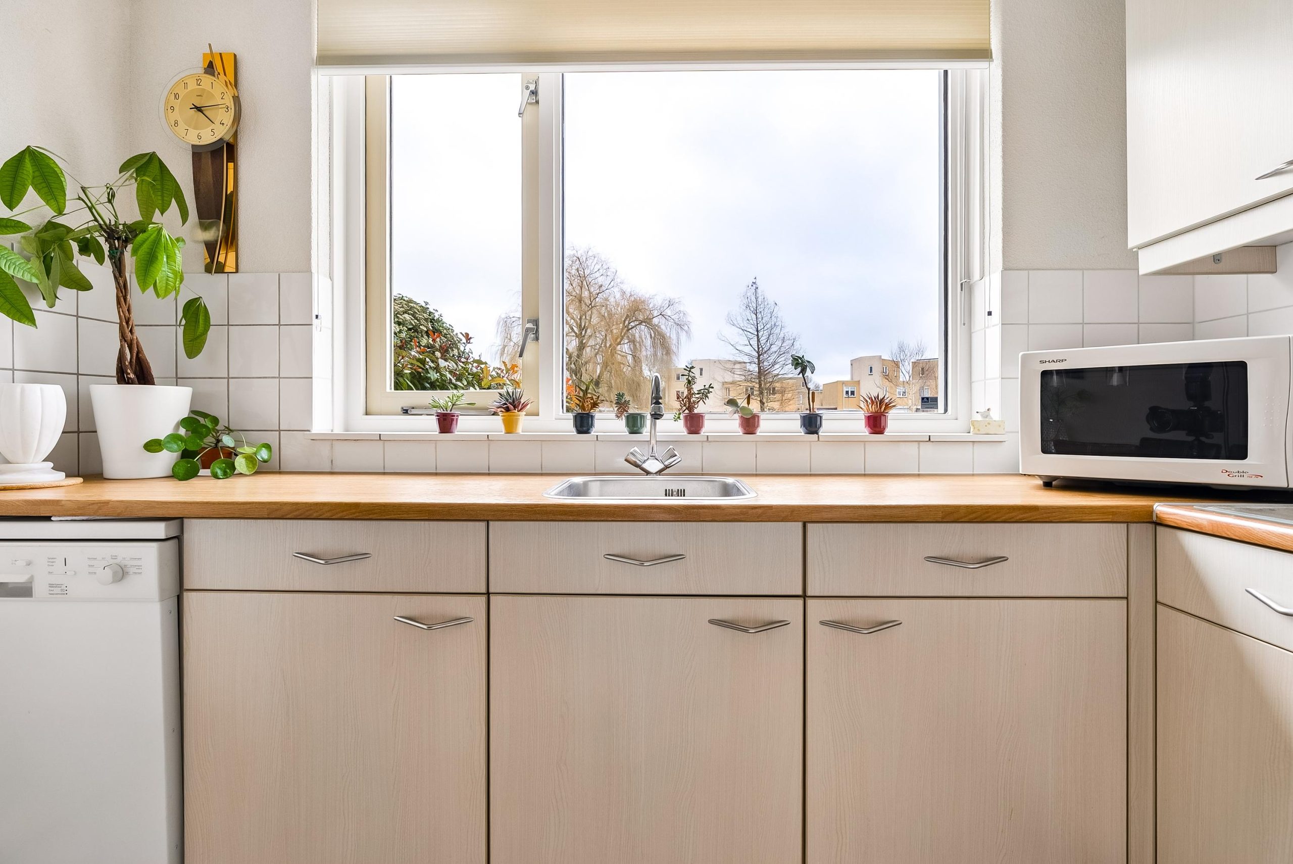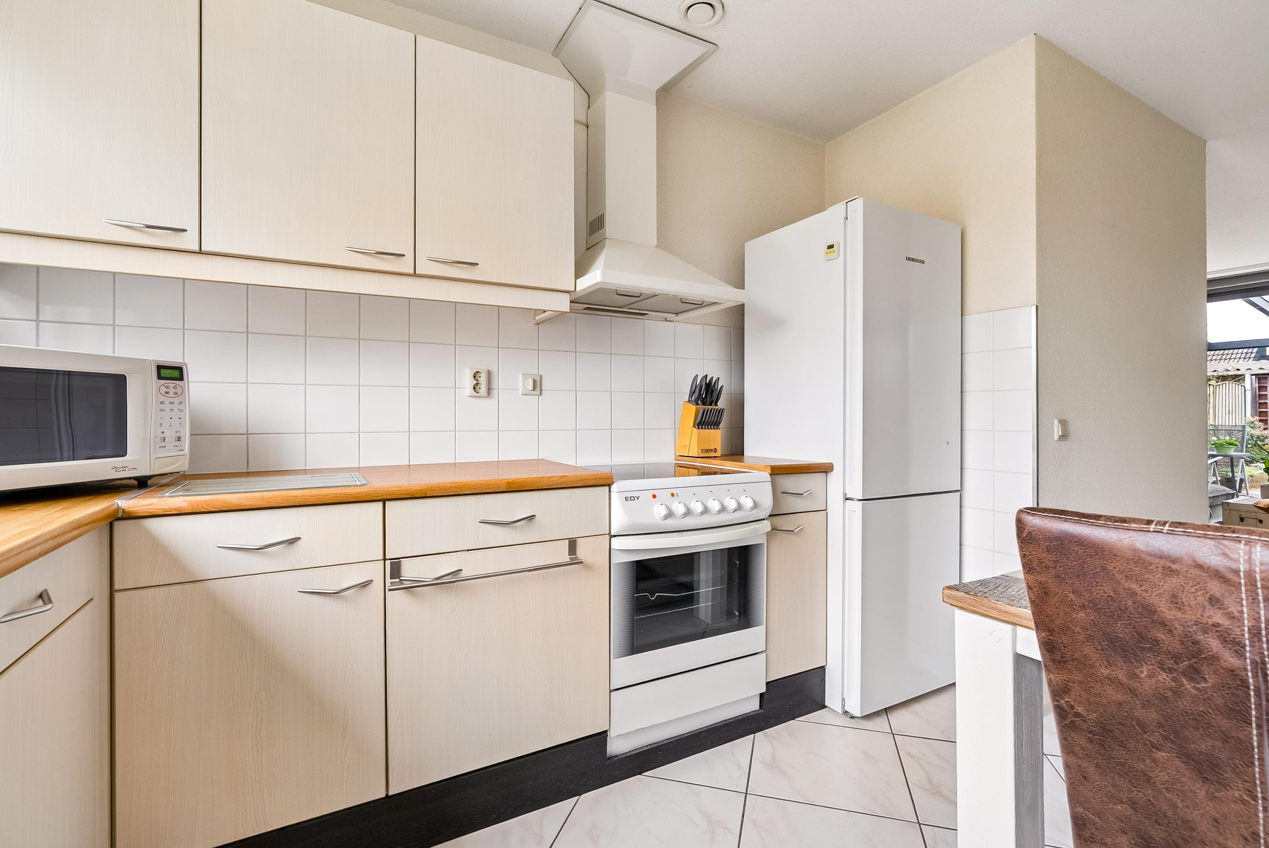 Aan de voorzijde is de keuken gelegen met verschillende losse apparatuur welke achter zal blijven in de woning. Vanuit de keuken kijk je heerlijk weg naar buiten richting het groen en het water. Dit is het unieke aan de woning dat je niet direct naar je buren kijkt. In de keuken is ruimte genoeg voor een ruime eettafel.