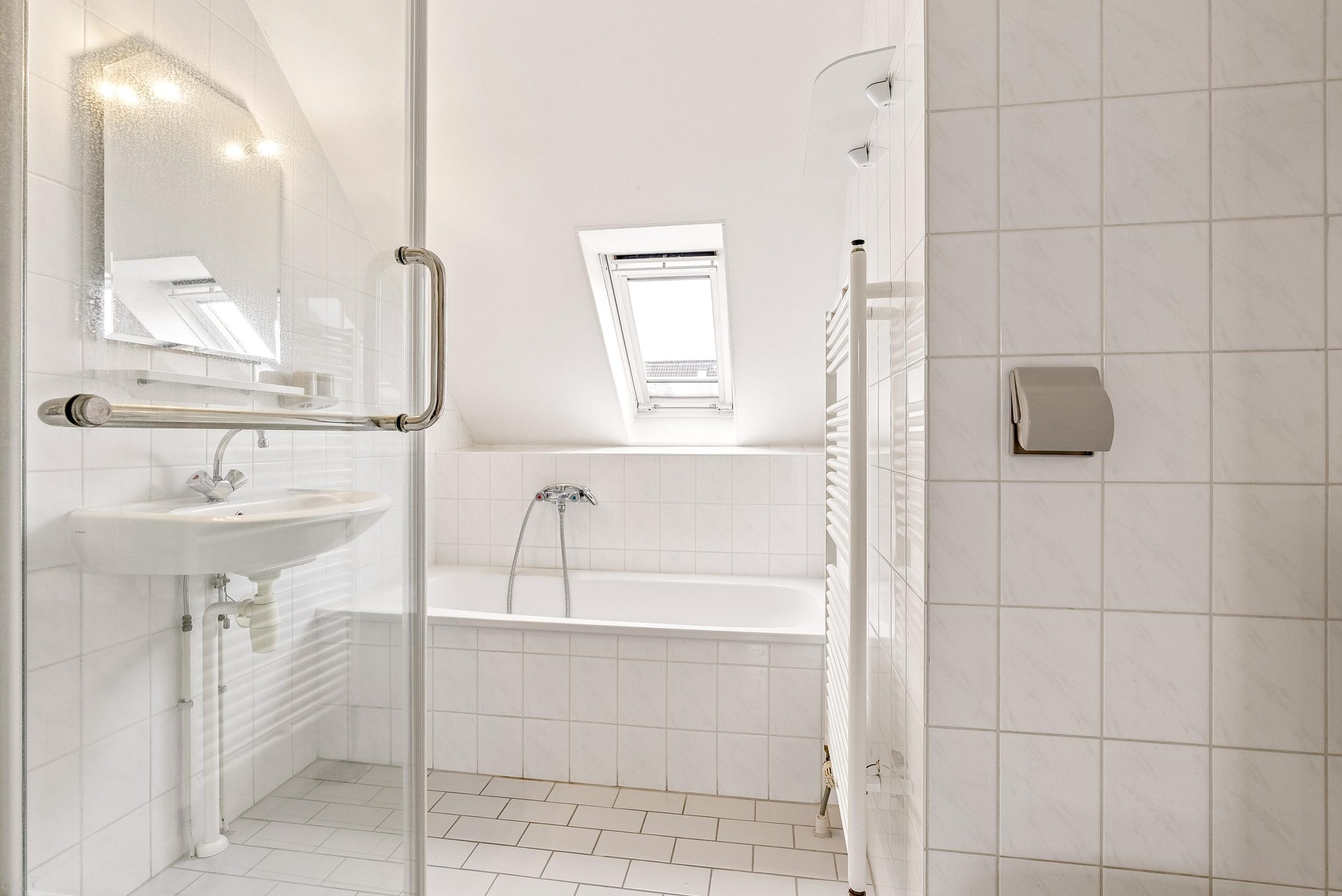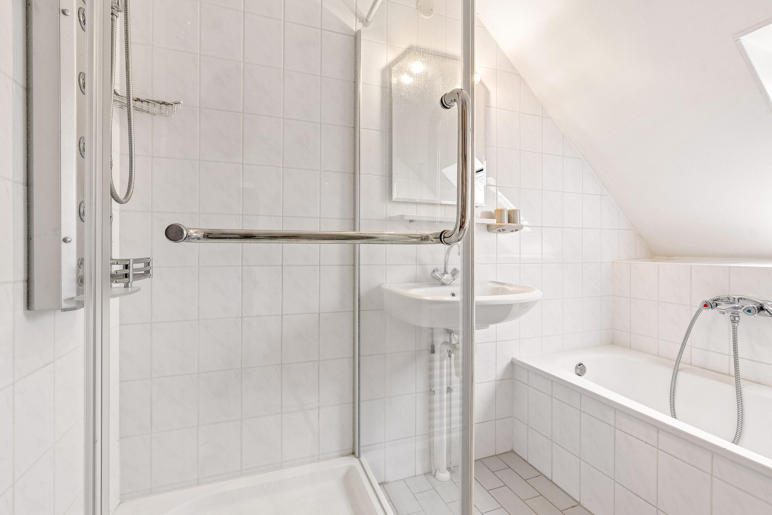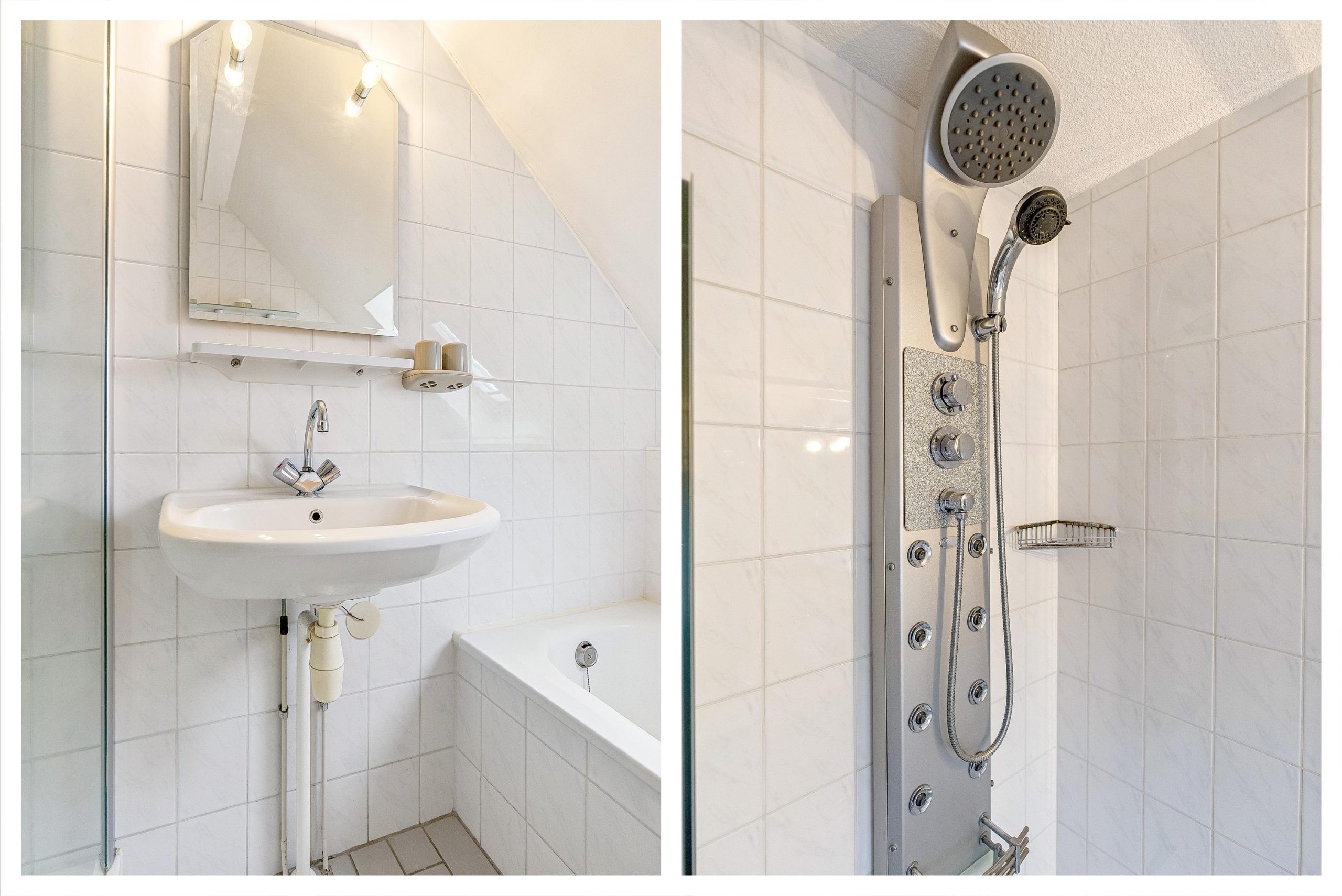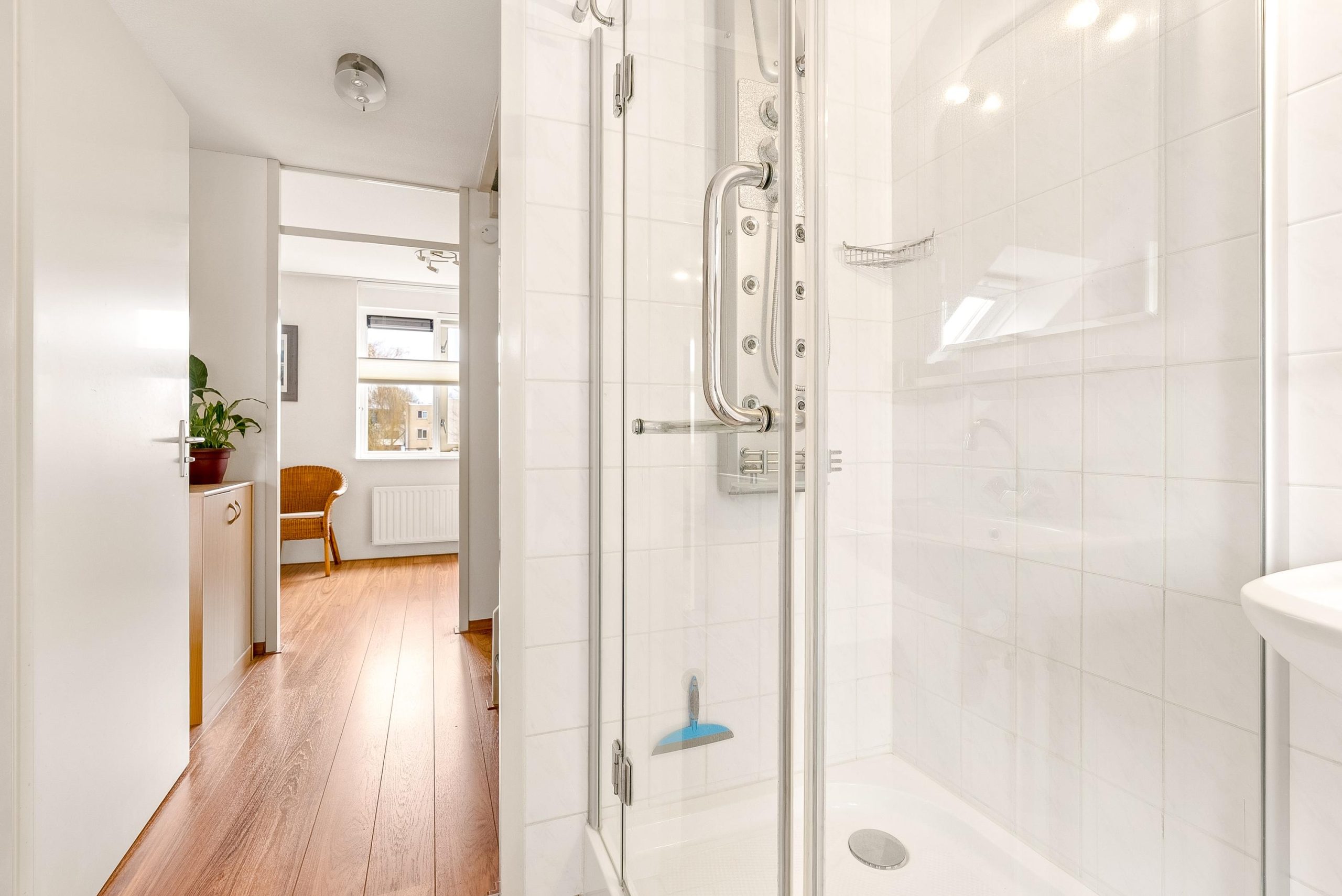De complete badkamer is netjes en voorzien van tweede toilet, ligbad, wastafel en douchecabine. Zowel de vloer als de wanden zijn netjes betegeld in een lichte kleurstelling.