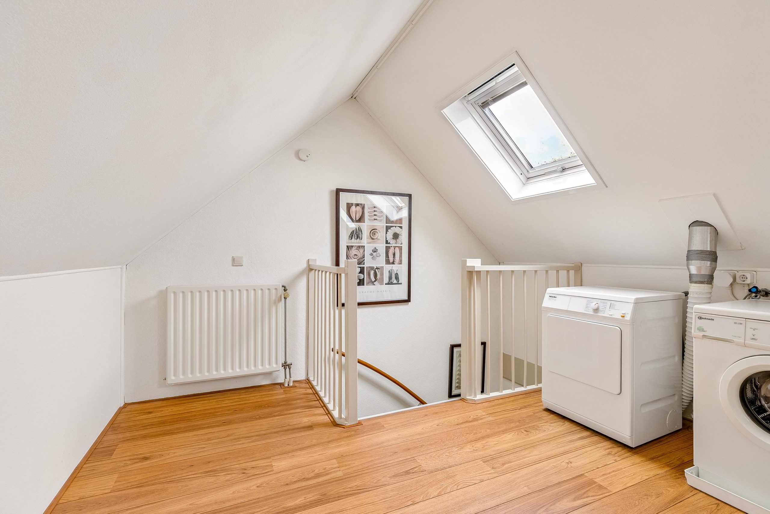 Via de vaste trap kom je op de zolderverdieping. Deze is uitstekend geschikt als derde slaapkamer. Door middel van het plaatsen van een dakkapel kun je de ruimte eenvoudig vergroten. Je vindt hier tevens de opstelling voor je wasmachine en droger en de mechanische ventilatie unit; deze is jaarlijks netjes onderhouden.