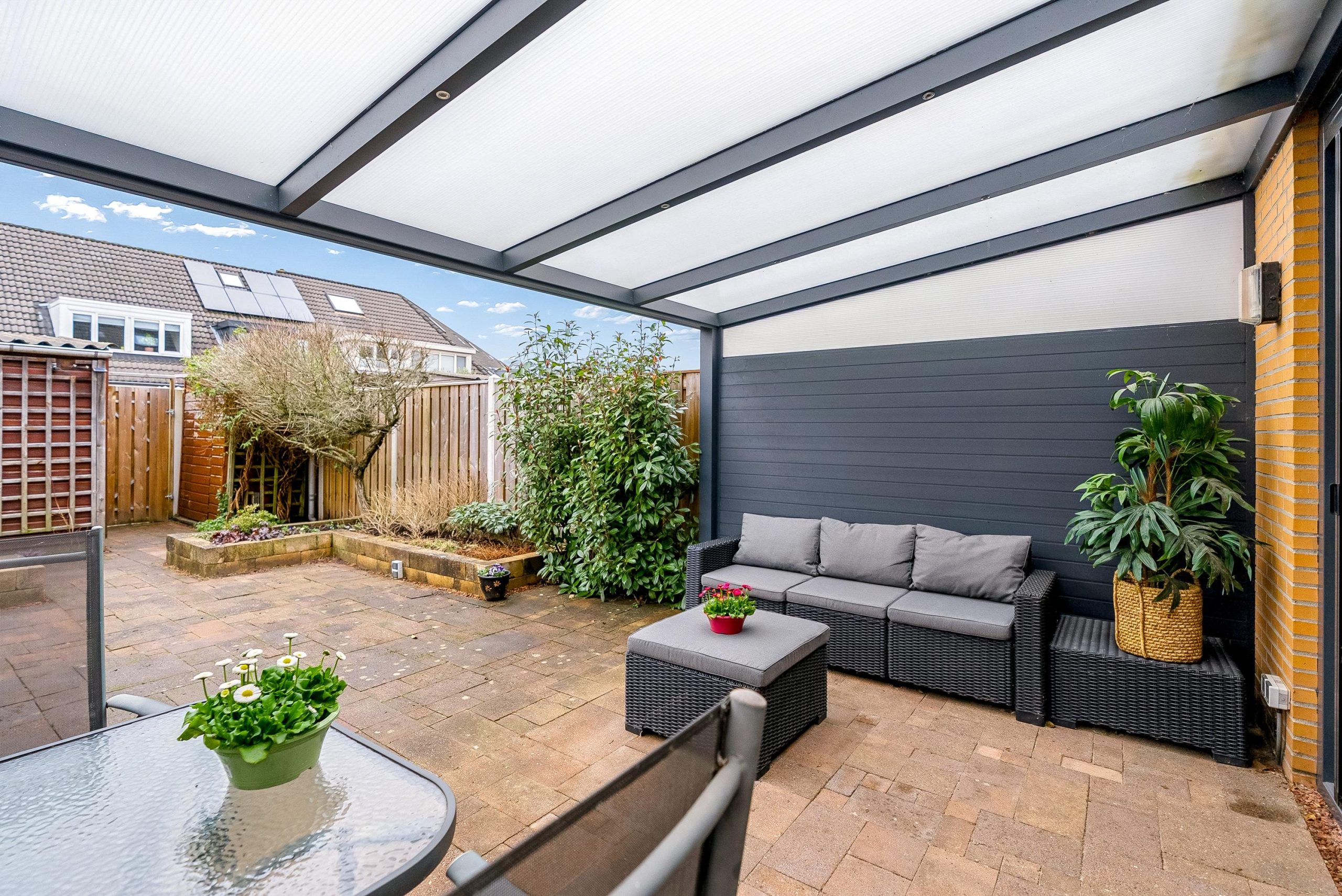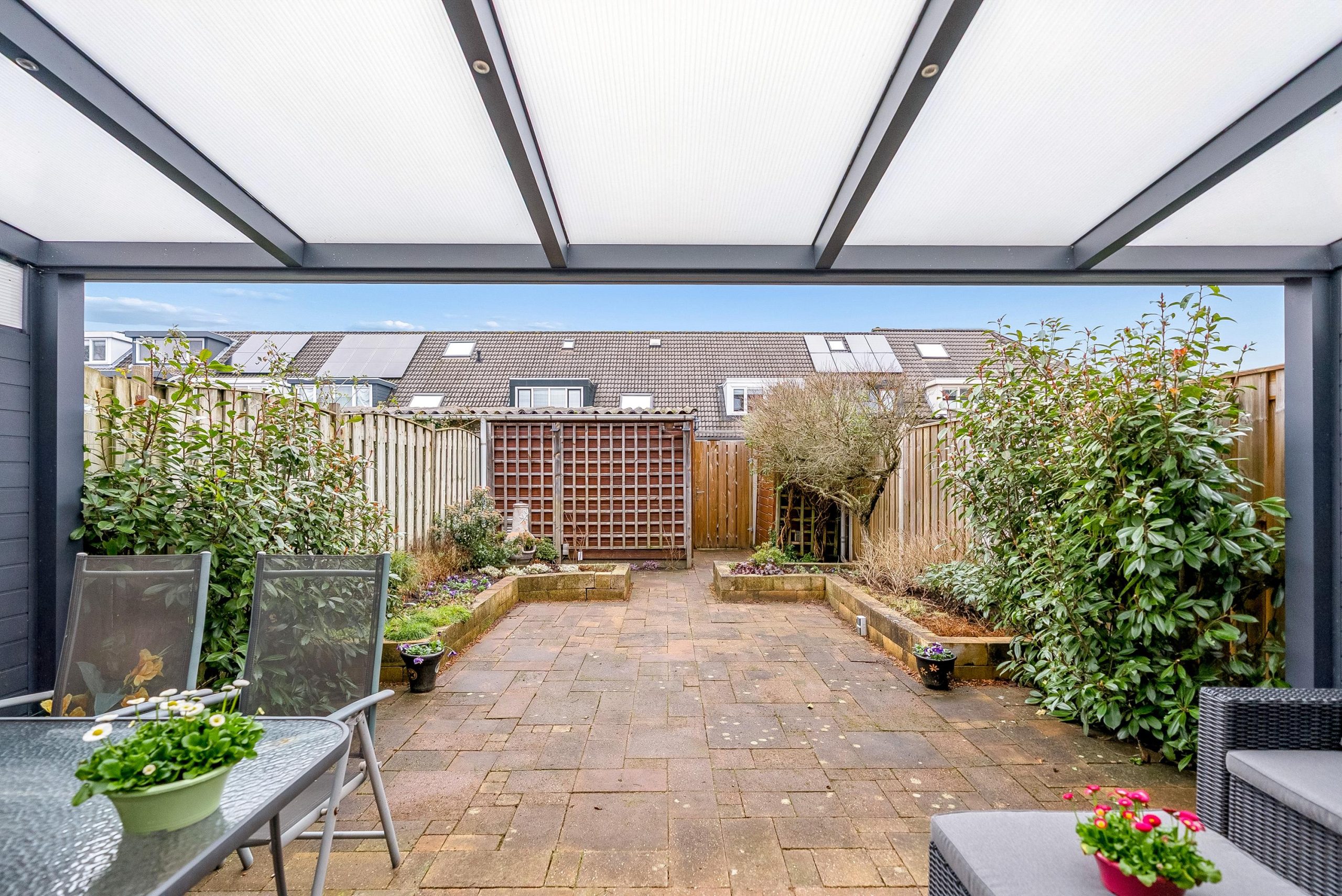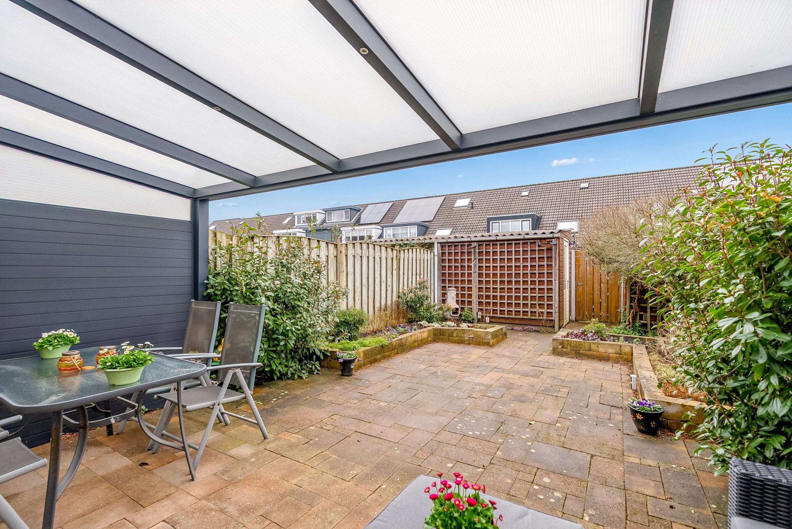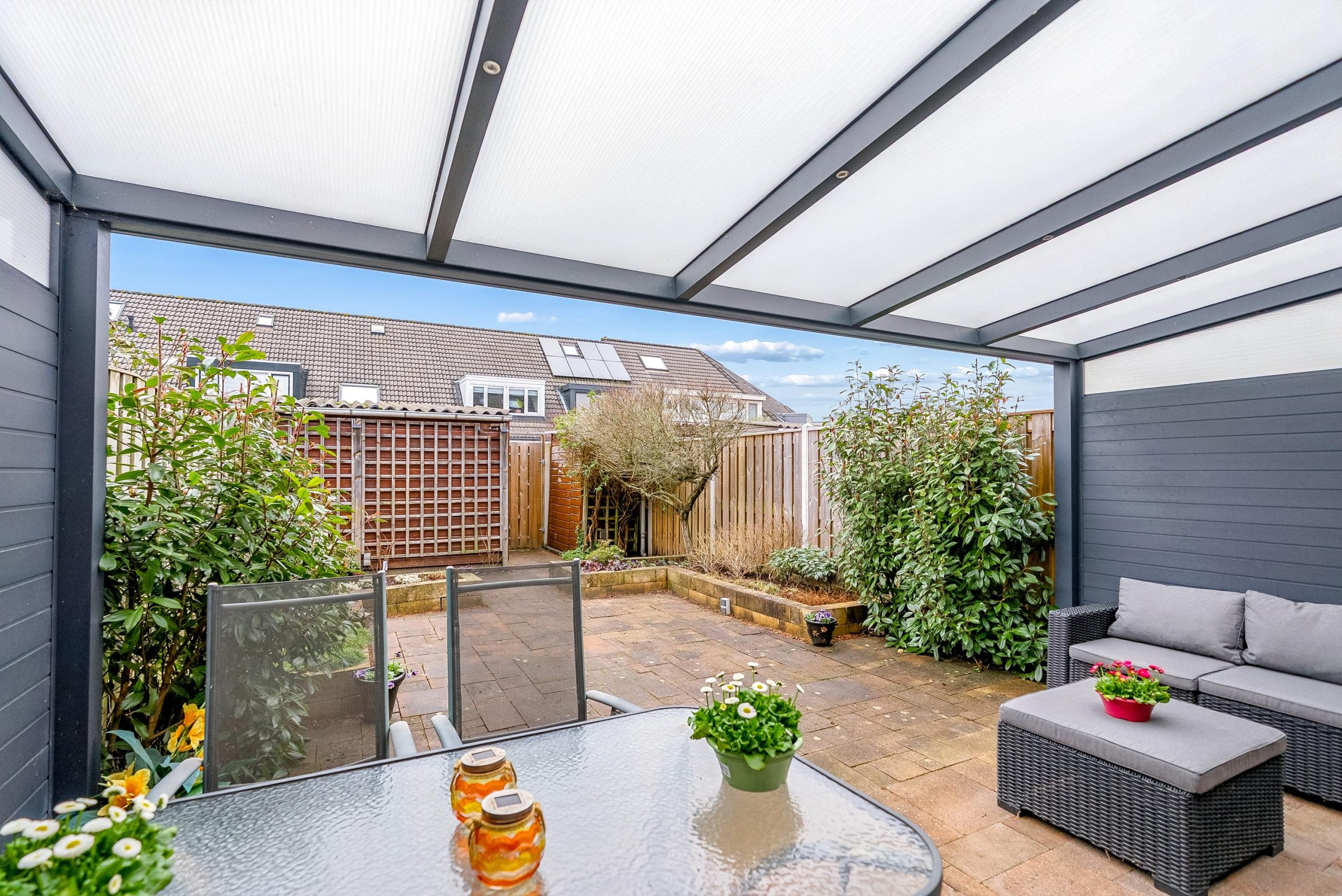 In 2023 is de overkapping aan de achterzijde geplaatst, compleet met sfeervolle inbouwspots. Dit vormt een prachtig verlengstuk van de woning en maakt het mogelijk om ook op minder zonnige dagen heerlijk buiten te zitten en te genieten met familie en vrienden.