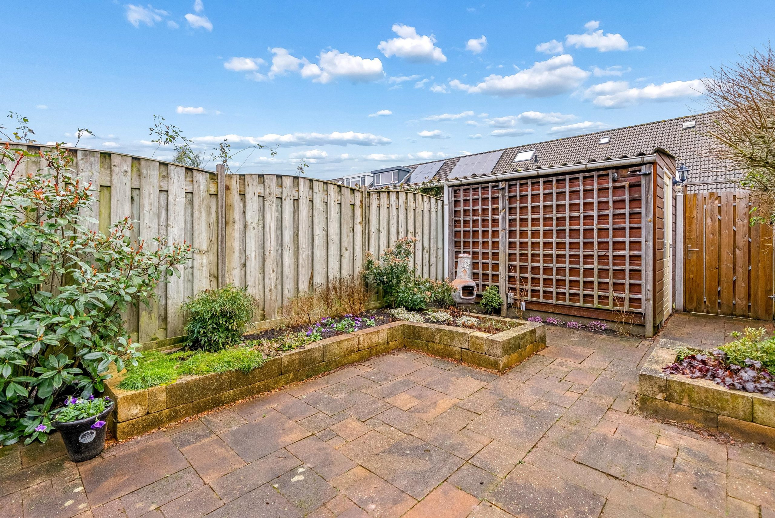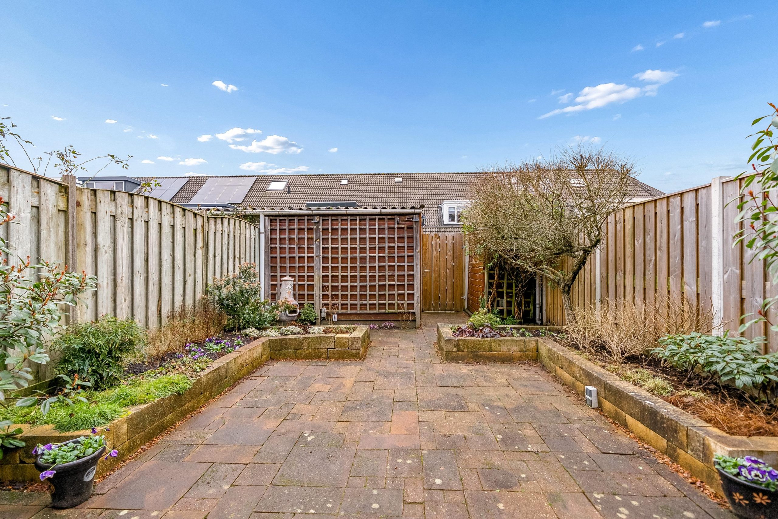 De achtertuin is maar liefst 12 meter diep en gelegen op het noordwesten. Dankzij deze royale diepte is er altijd wel een plekje in de zon of juist in de schaduw te vinden. Achterin de tuin bevindt zich de berging en een handige achterom.