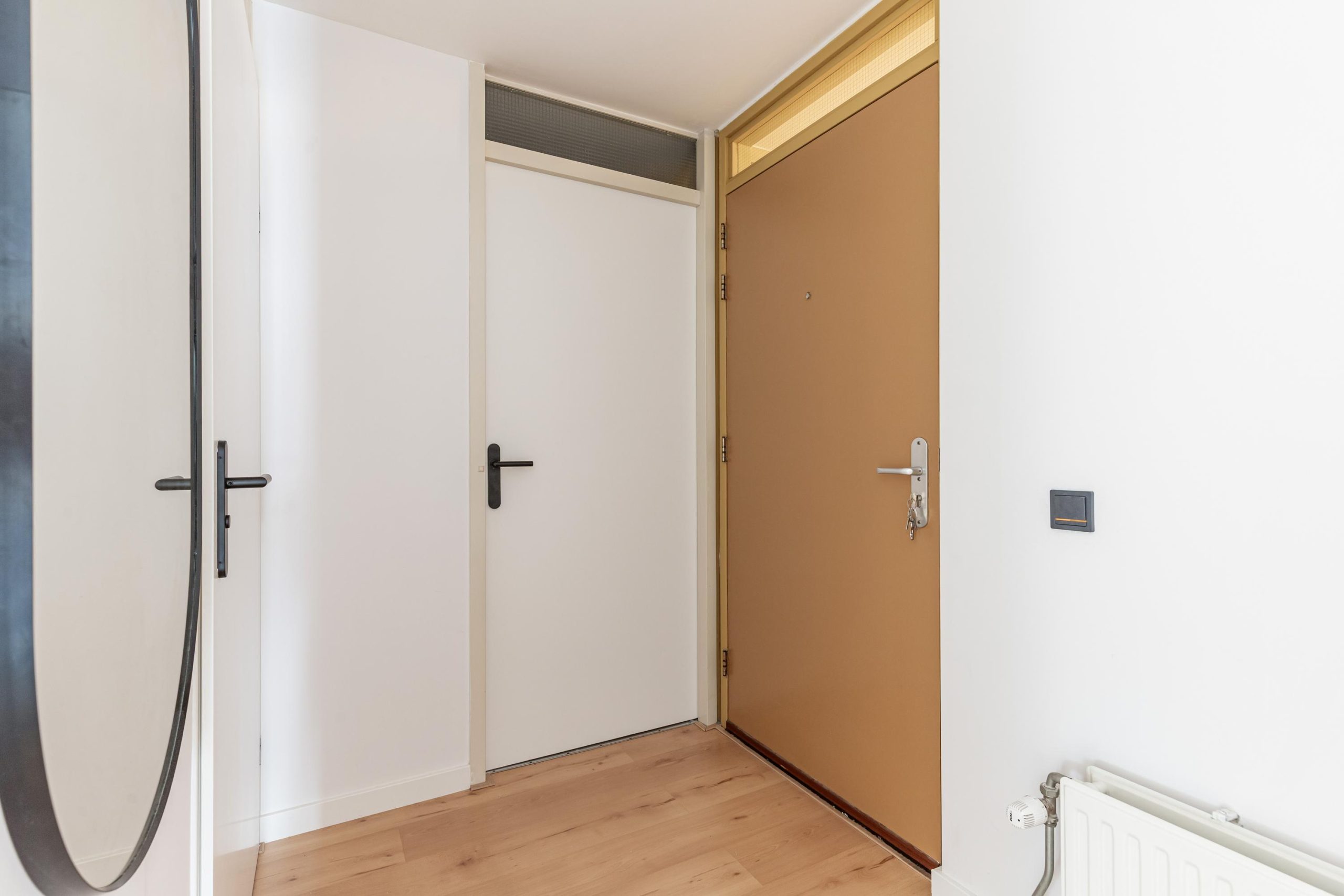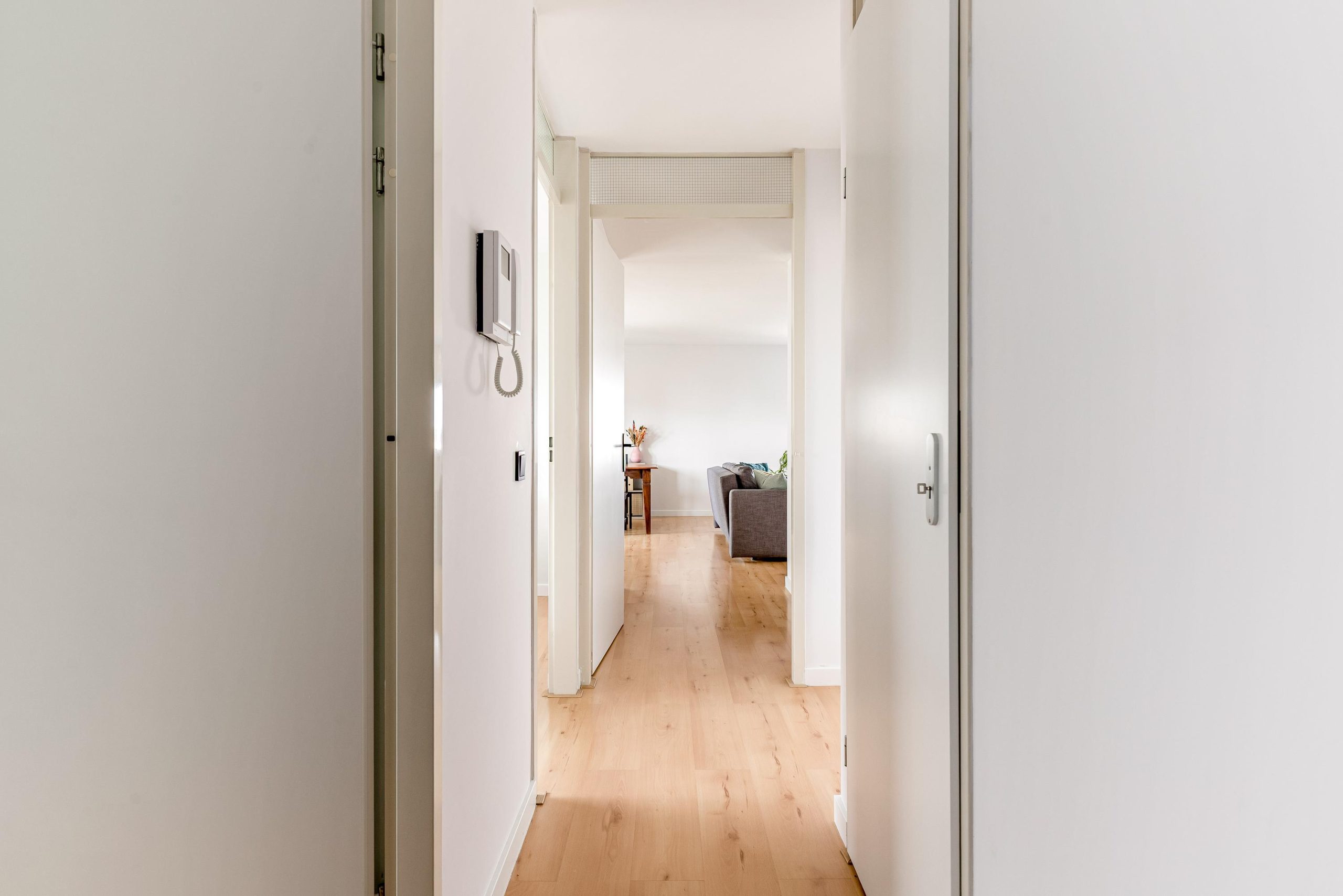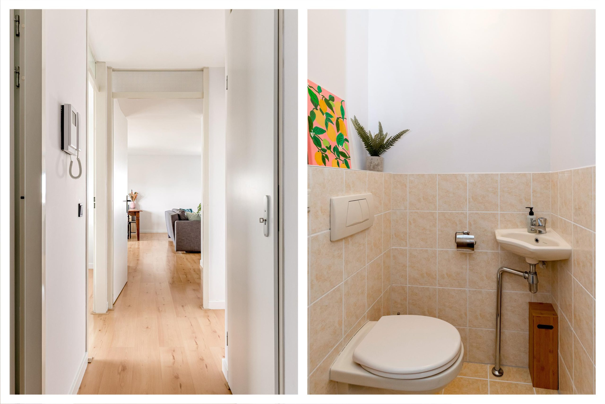 Met de lift of trap bereik je de zesde verdieping. Entree, hal met direct rechts de bergruimte met wasmachine aansluiting, ook ideaal voor je garderobe. Via de gang zijn alle vertrekken van de woning te bereiken. Je beschikt over een separaat toilet, welke keurig is betegeld. Aan de linkerkant heb je twee ruime slaapkamers. De nette badkamer is voorzien van ligbad, wastafel met meubel en radiator. Het toilet is separaat.