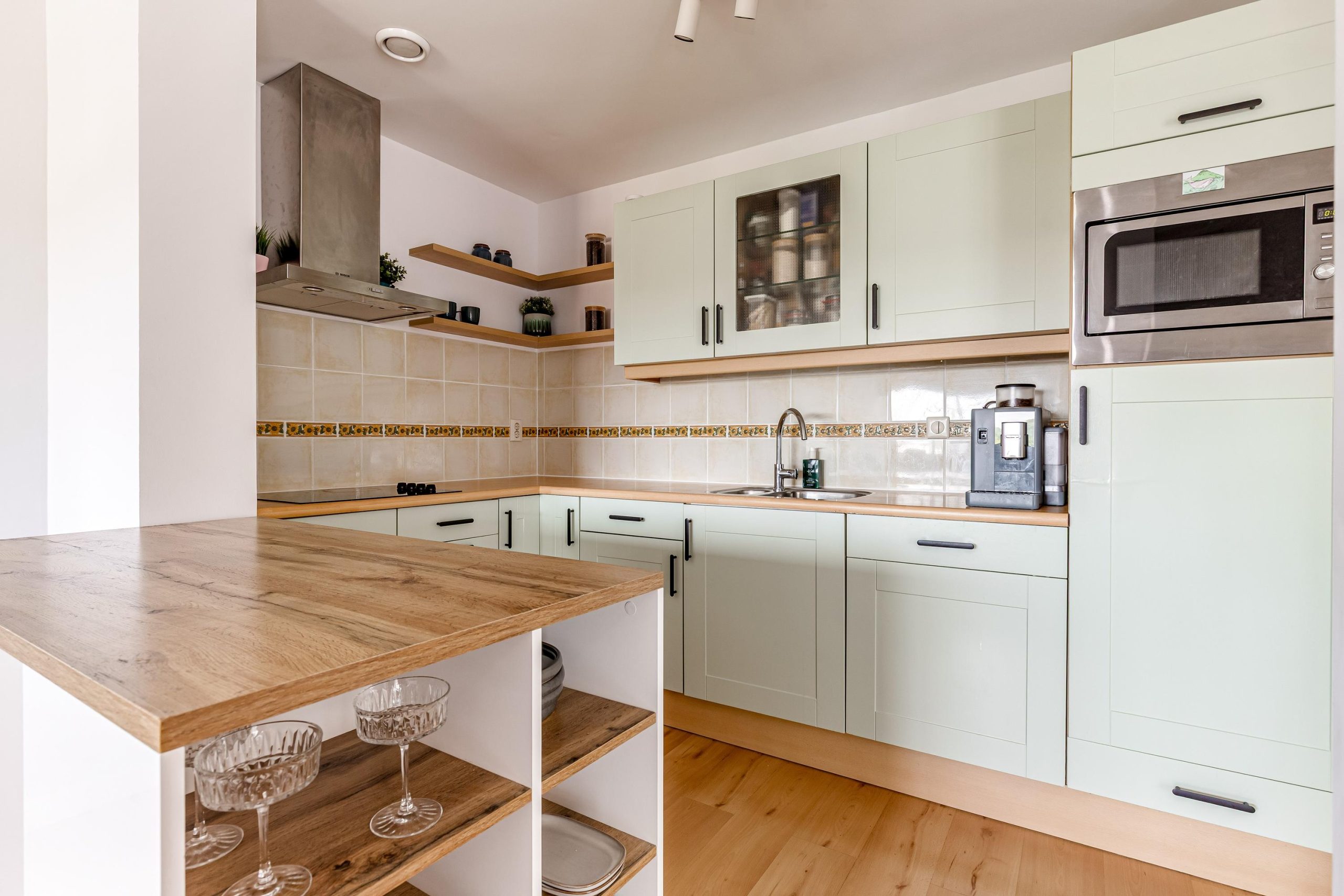 De ruime woonkamer met open keuken is heerlijk licht door de vele raampartijen. De keuken is voorzien van verschillende inbouwapparatuur te weten: vaatwasser, magnetron, koelkast, inductie kookplaat en afzuiging. De inductiekookplaat (Pelgrim) is vernieuwd in 2020 en afzuiging is van Bosch en vernieuwd in 2023.