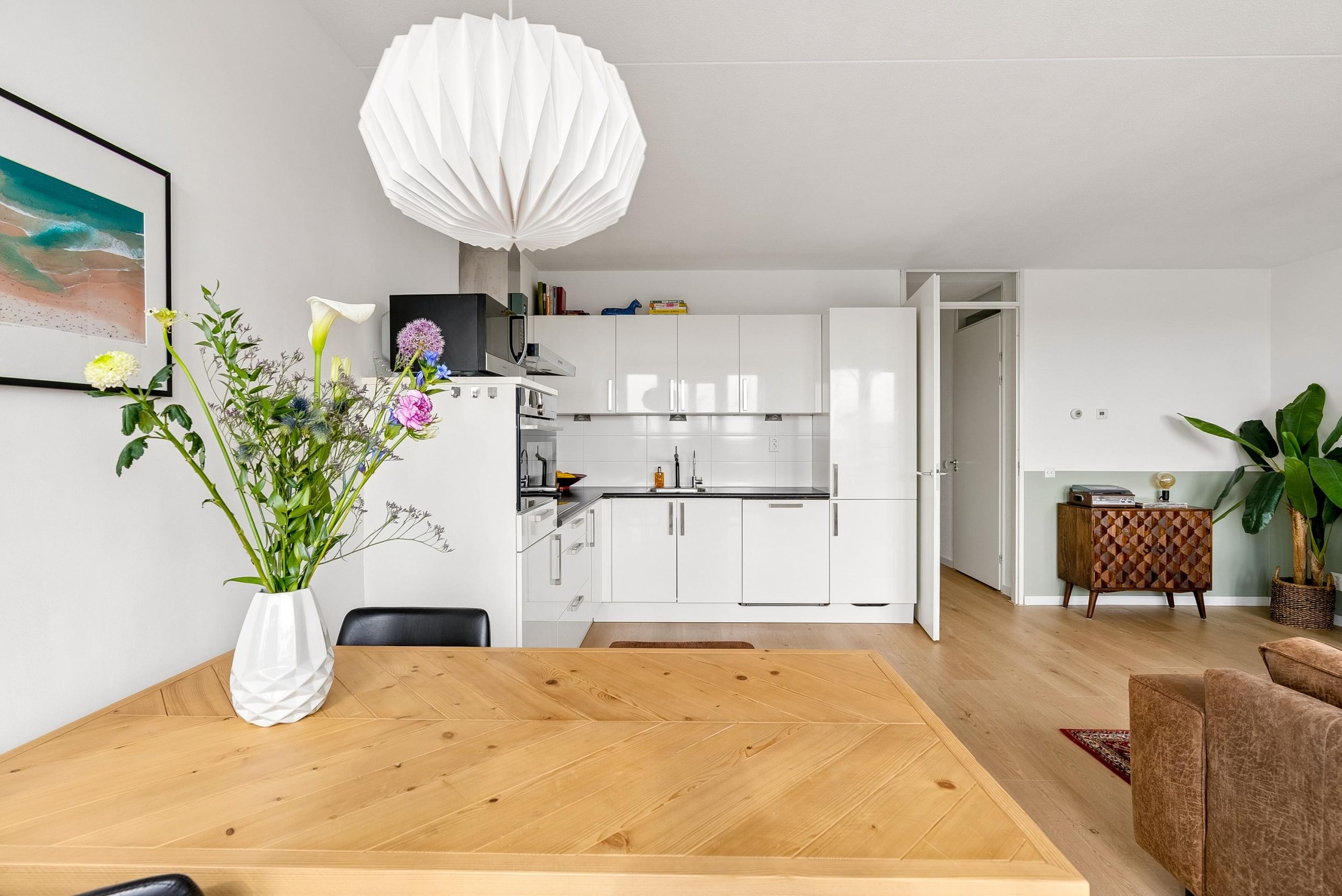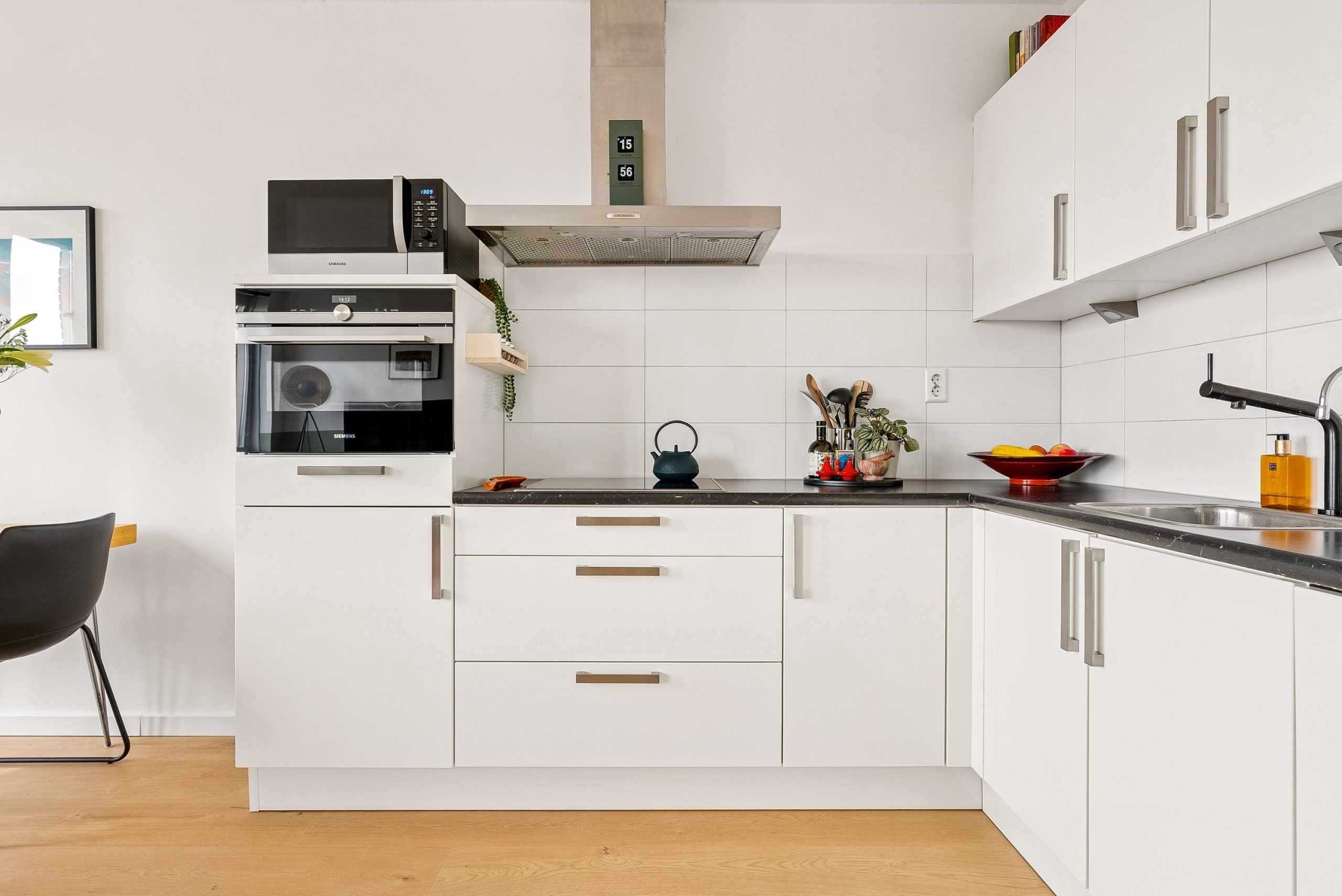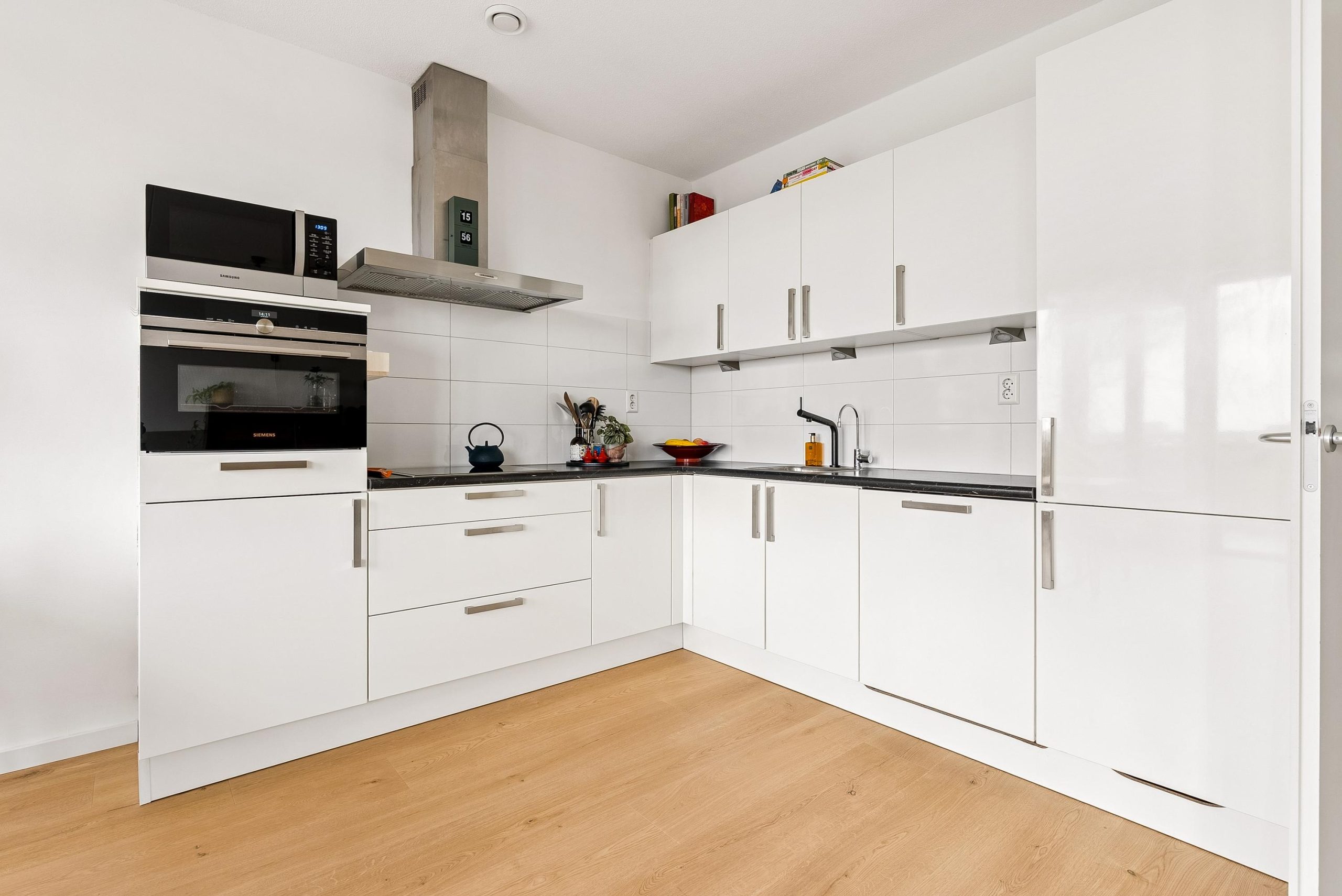 De moderne open keuken is voorzien van diverse inbouwapparatuur, waaronder een koel-/vriescombinatie, combi-magnetron, vaatwasser en inductiekookplaat met afzuigkap. Daarnaast biedt de keuken voldoende werk- en opbergruimte.
