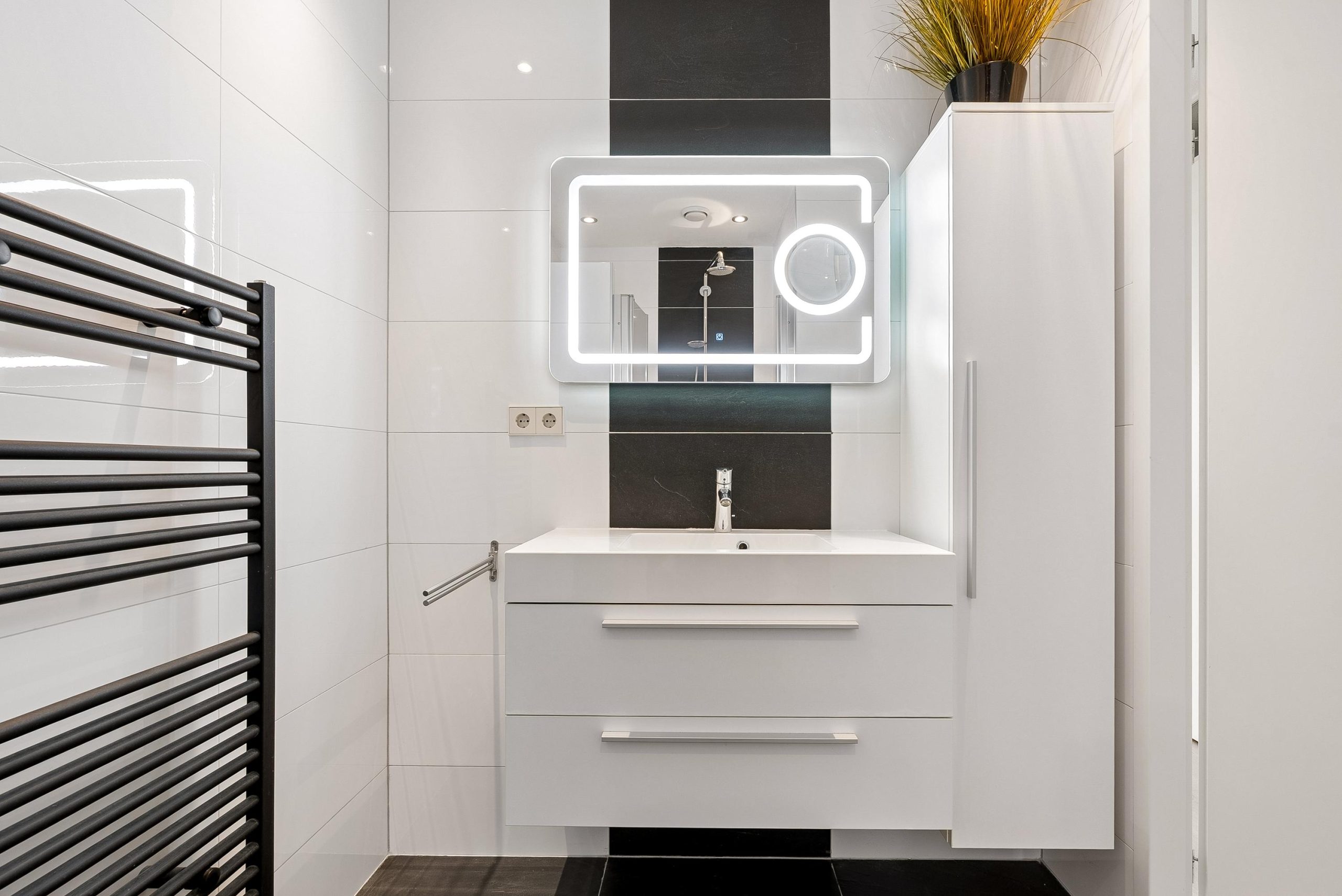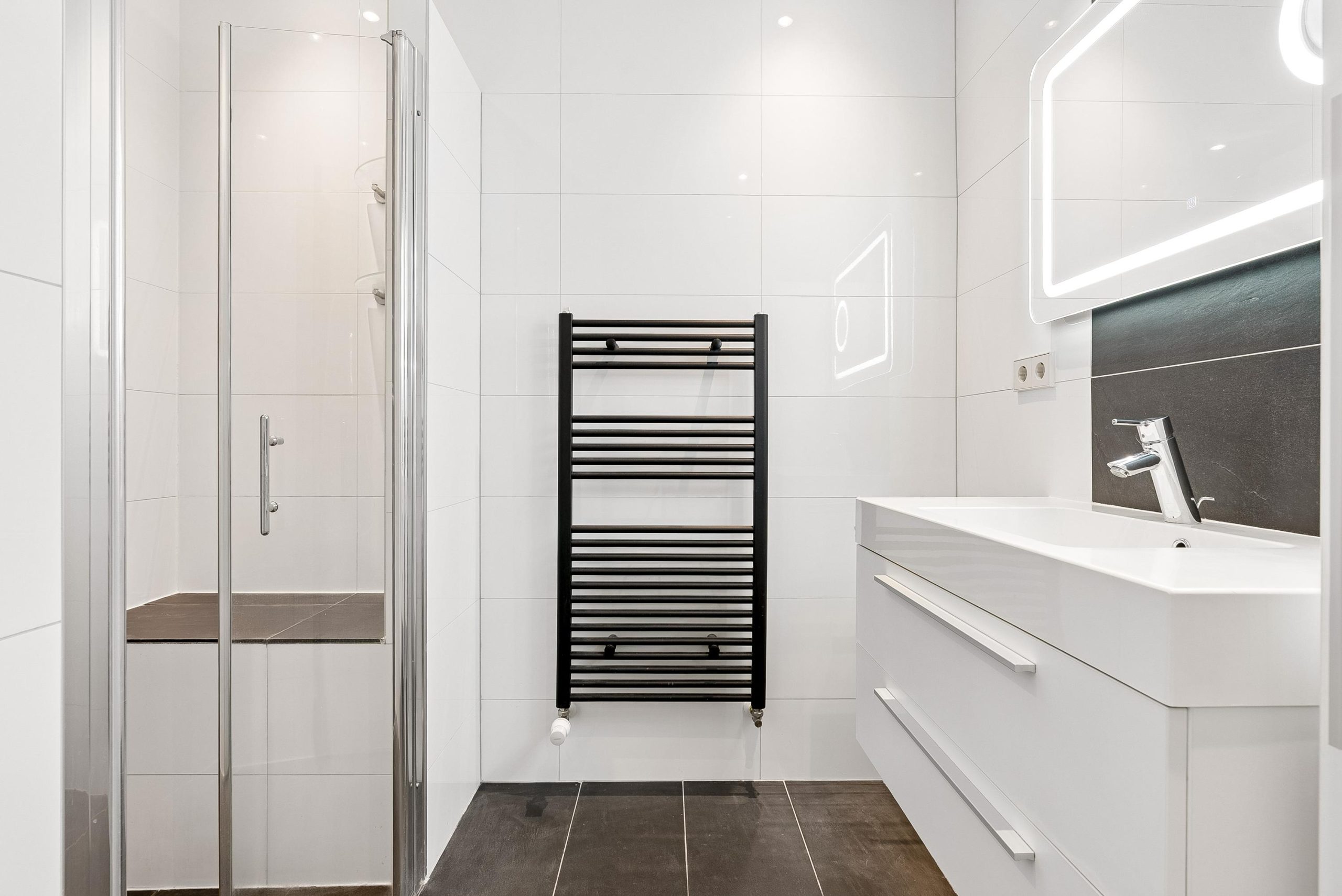 Via de gang bereik je de twee slaapkamers, het separate toilet, de badkamer en het washok. De badkamer is modern en voorzien van een ruime inloopdouche met ingebouwd zitelement, een regen- en handdouche, een wastafel met meubel en een designradiator.