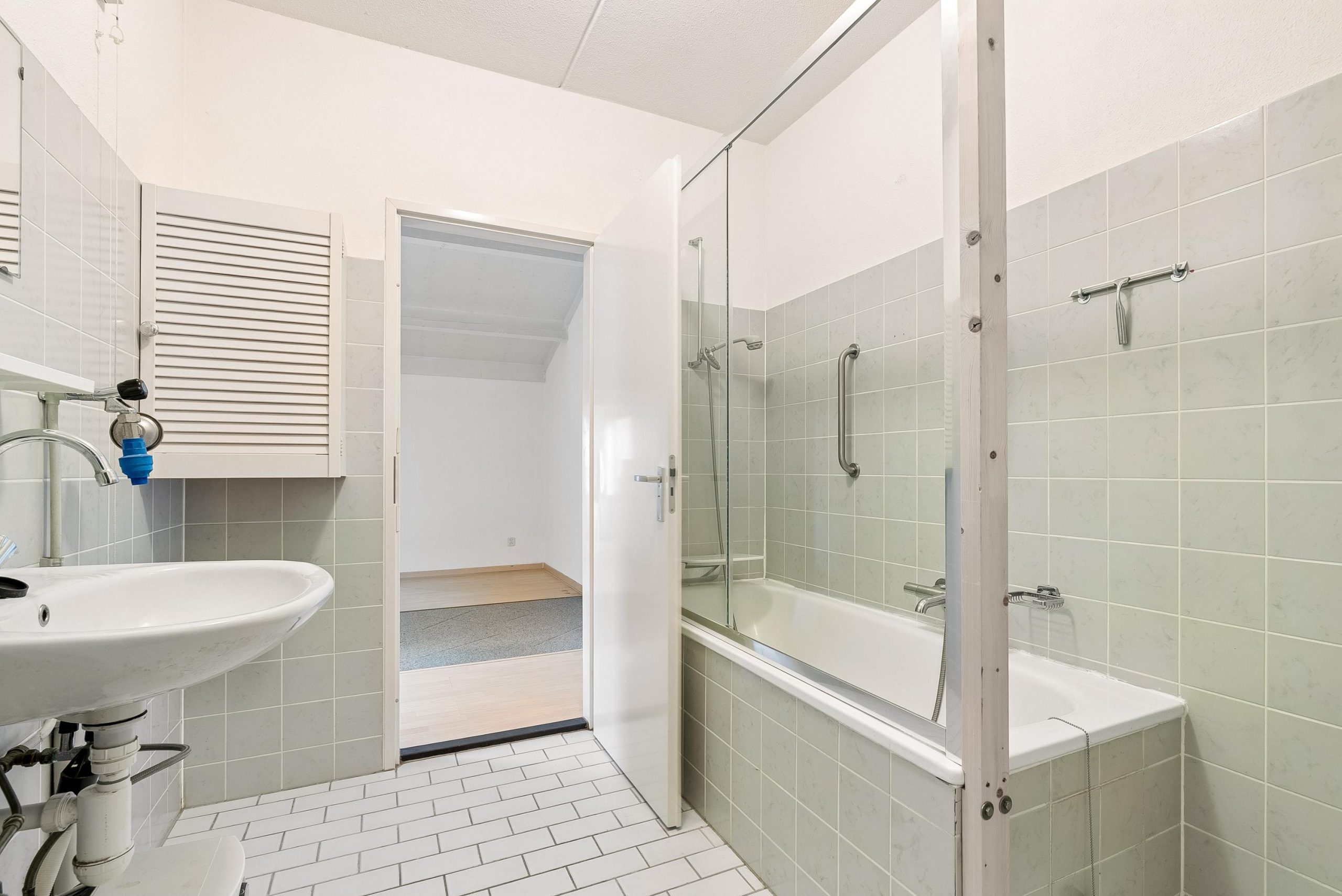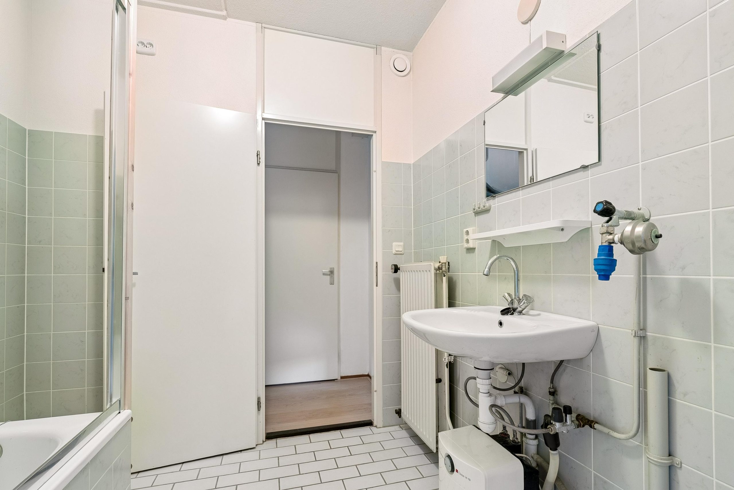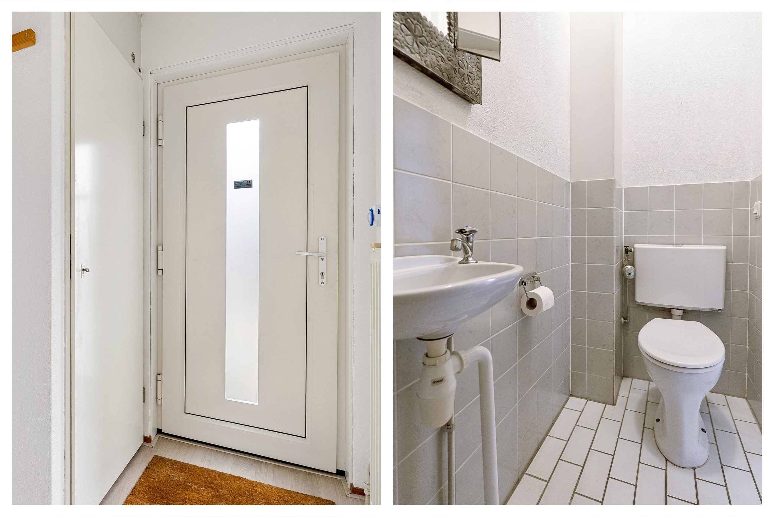 Op de begane grond bevindt zich tevens een tweede hal met het een separaat toilet en de trap naar de eerste verdieping. De badkamer op de begane grond is bereikbaar via zowel de tweede hal als de slaapkamer en beschikt over een ligbad, wastafel en een aansluiting voor de wasmachine.