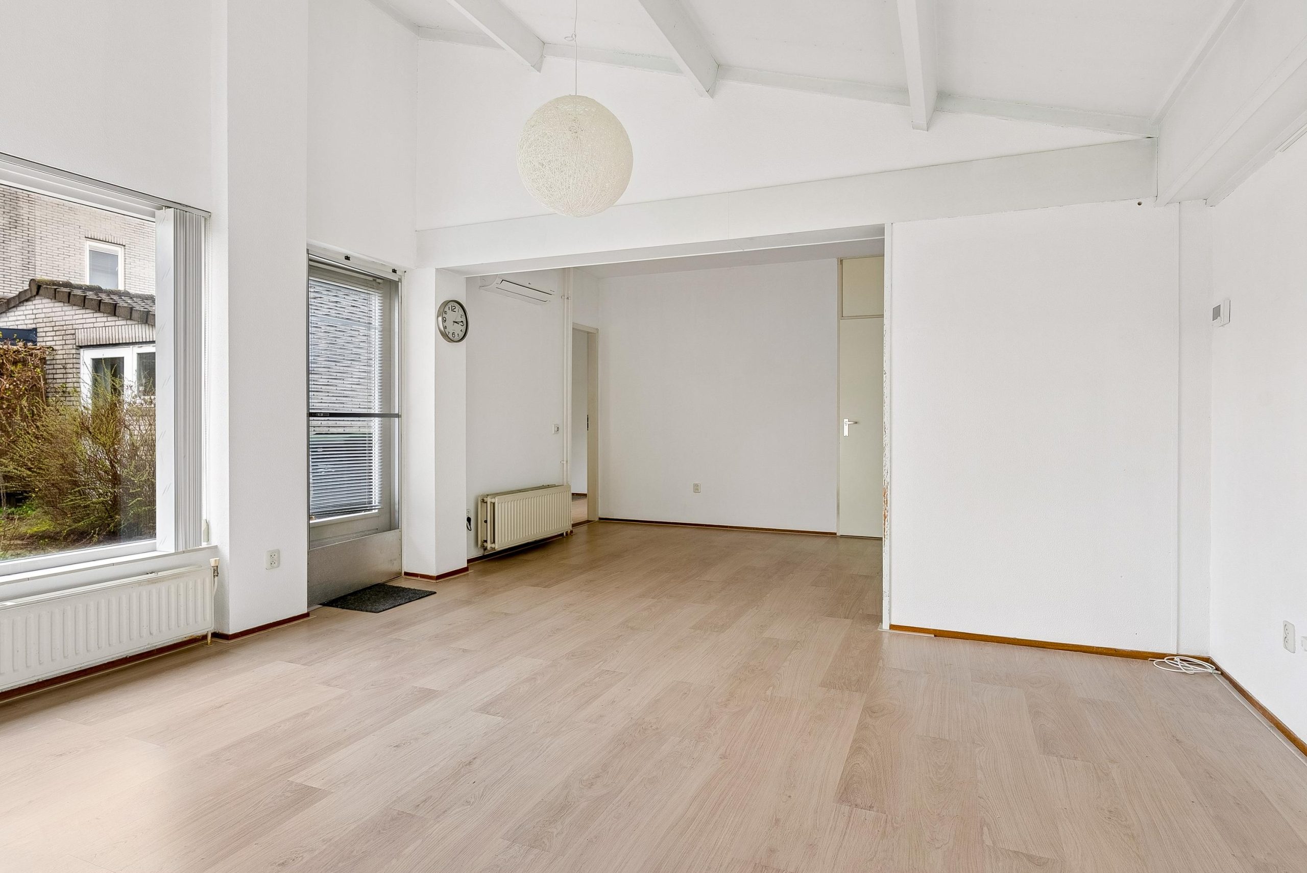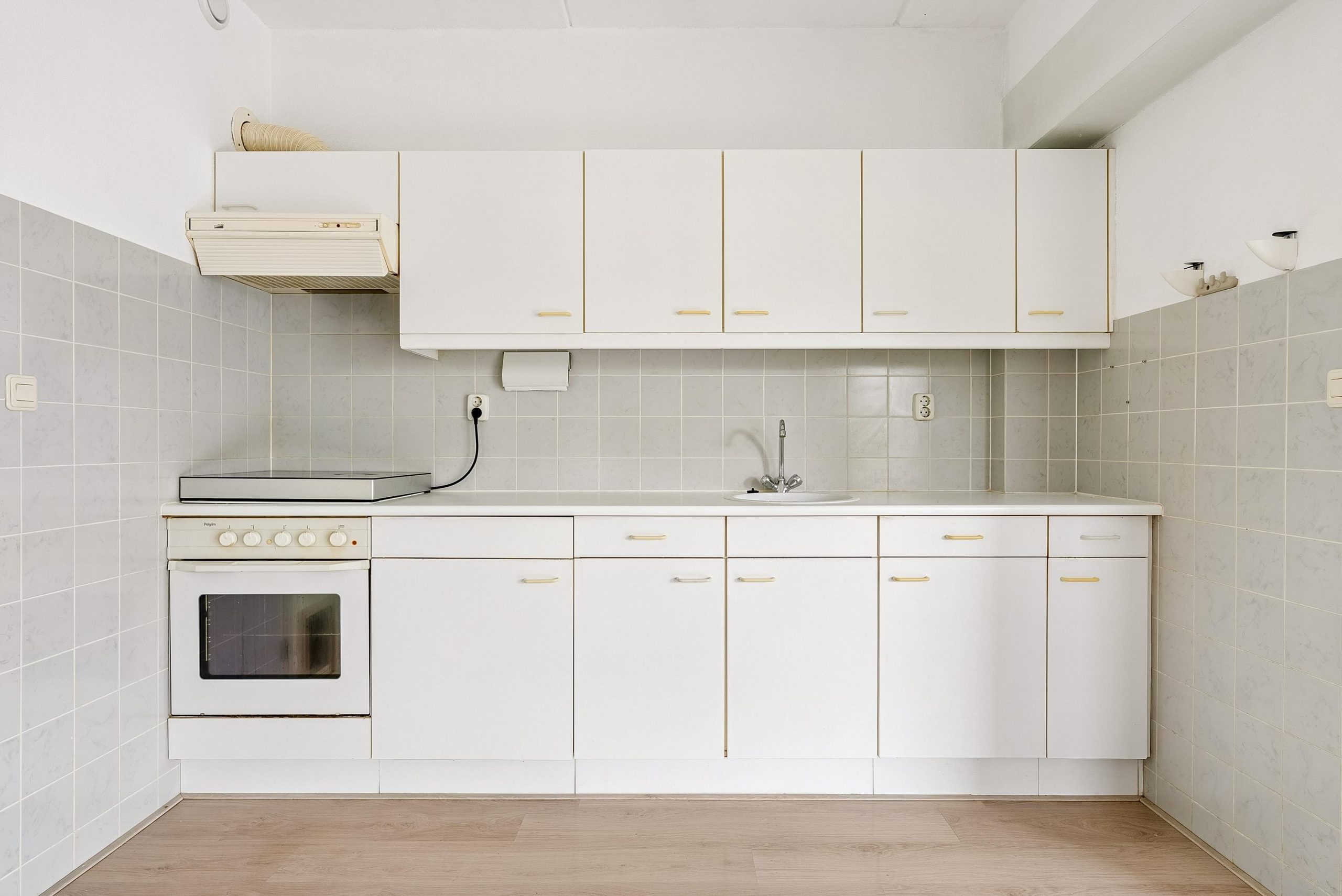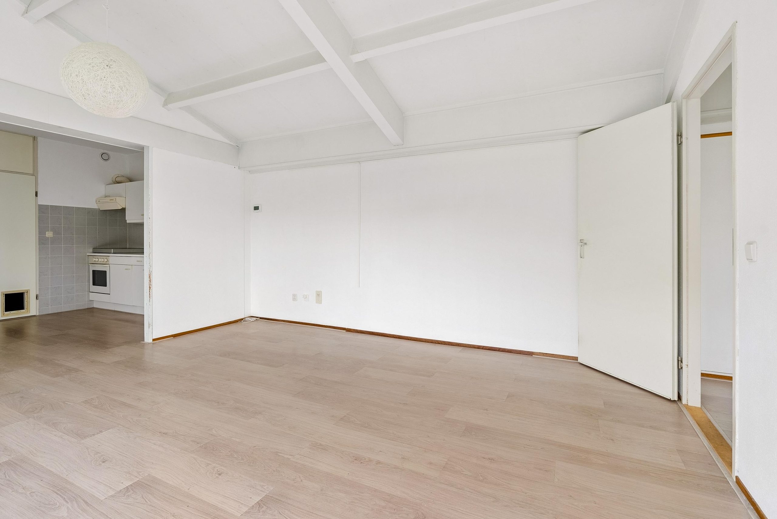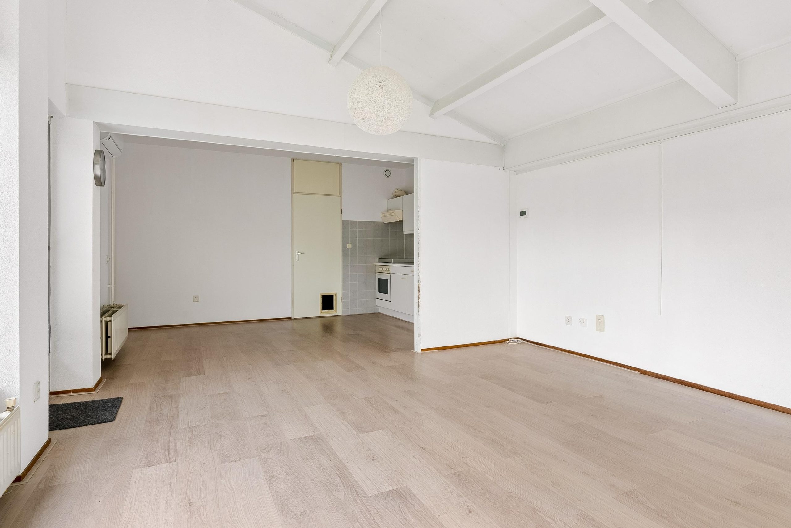 De hal leid je verder naar de ruime woonkamer met open keuken. Dankzij de grote raampartijen en het hoge plafond voelt deze ruimte licht en ruim aan. Vanuit de woonkamer heb je eveneens toegang tot de tuin. De eenvoudige keuken is voorzien van voldoende kastruimte, een oven, afzuigkap en 4-pits kookplaat.