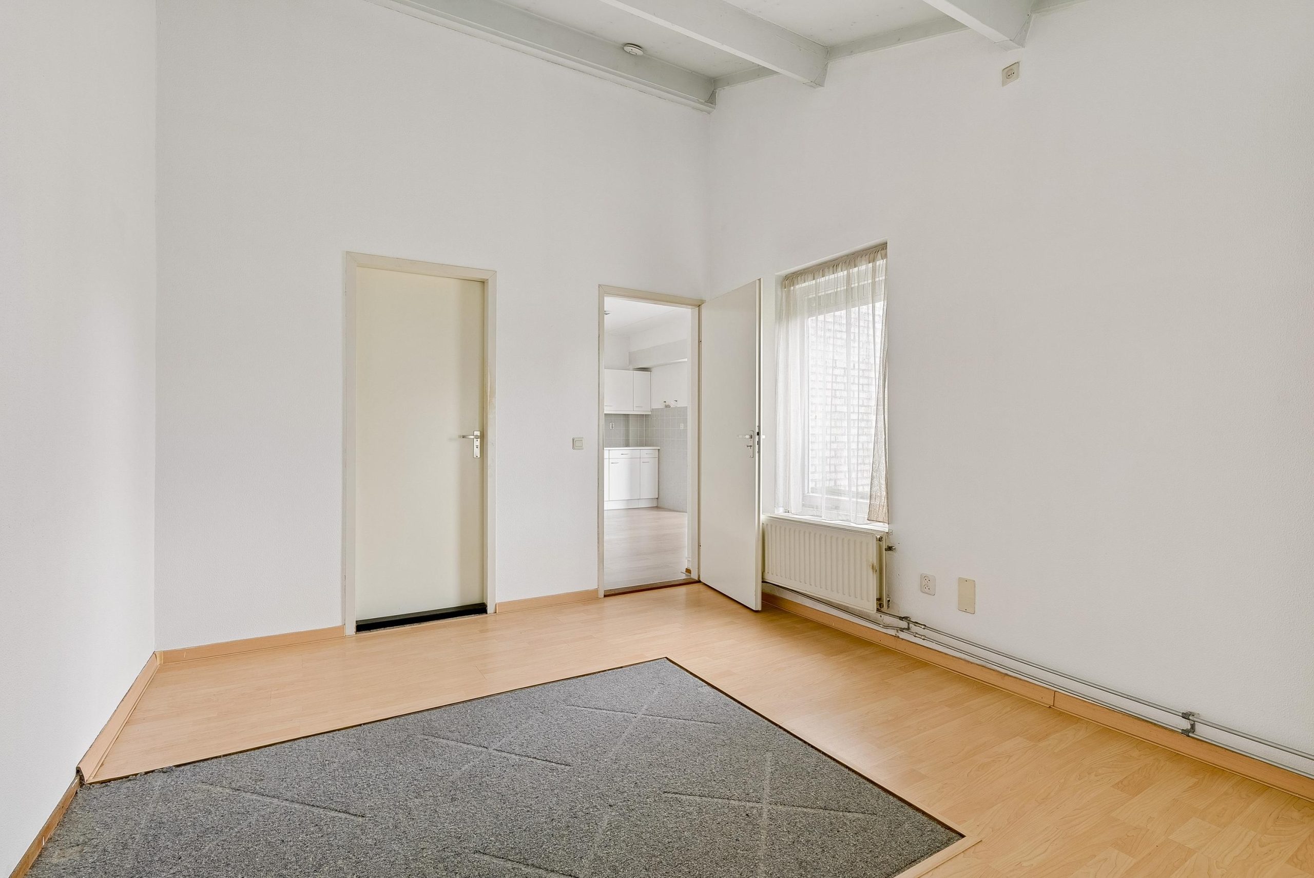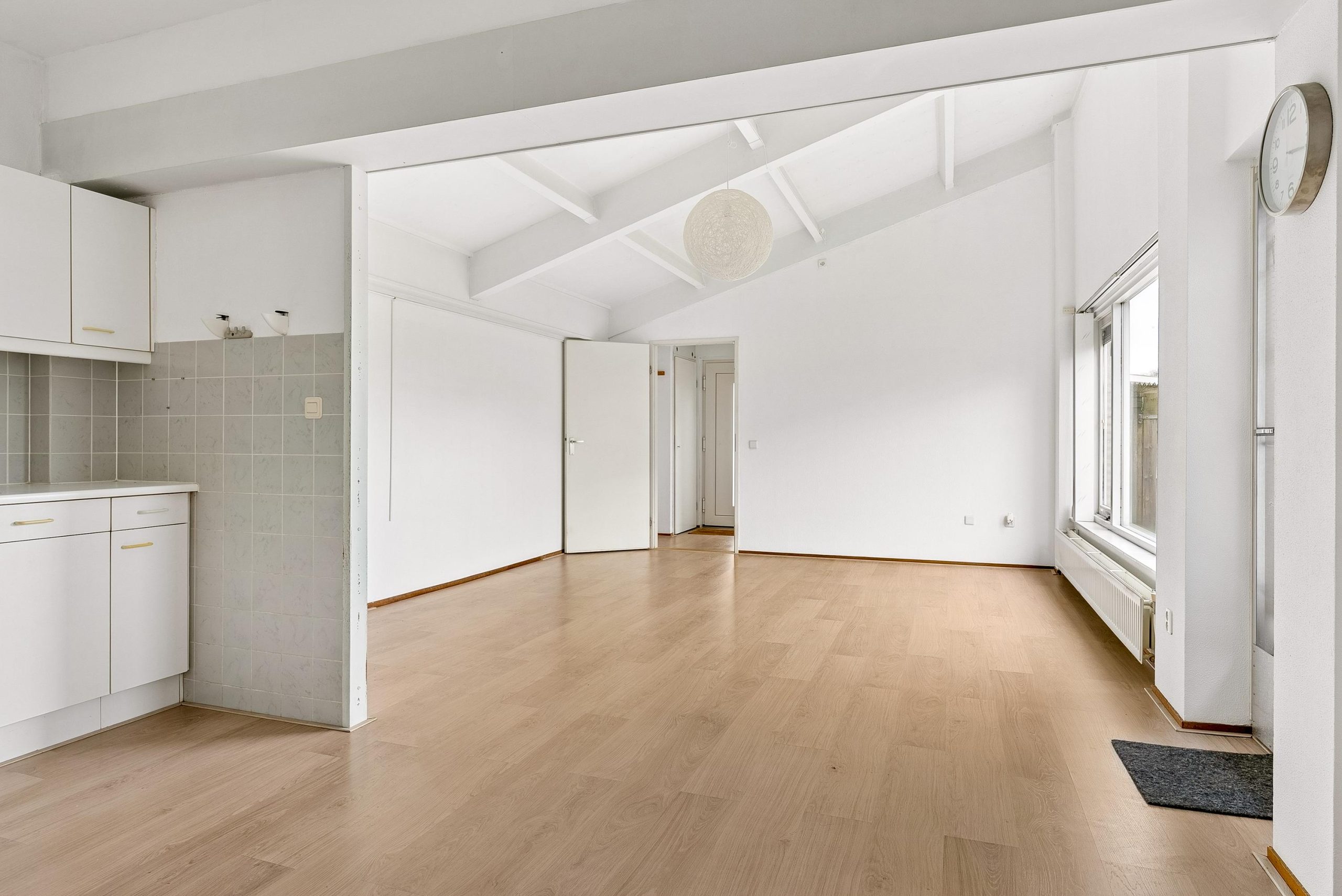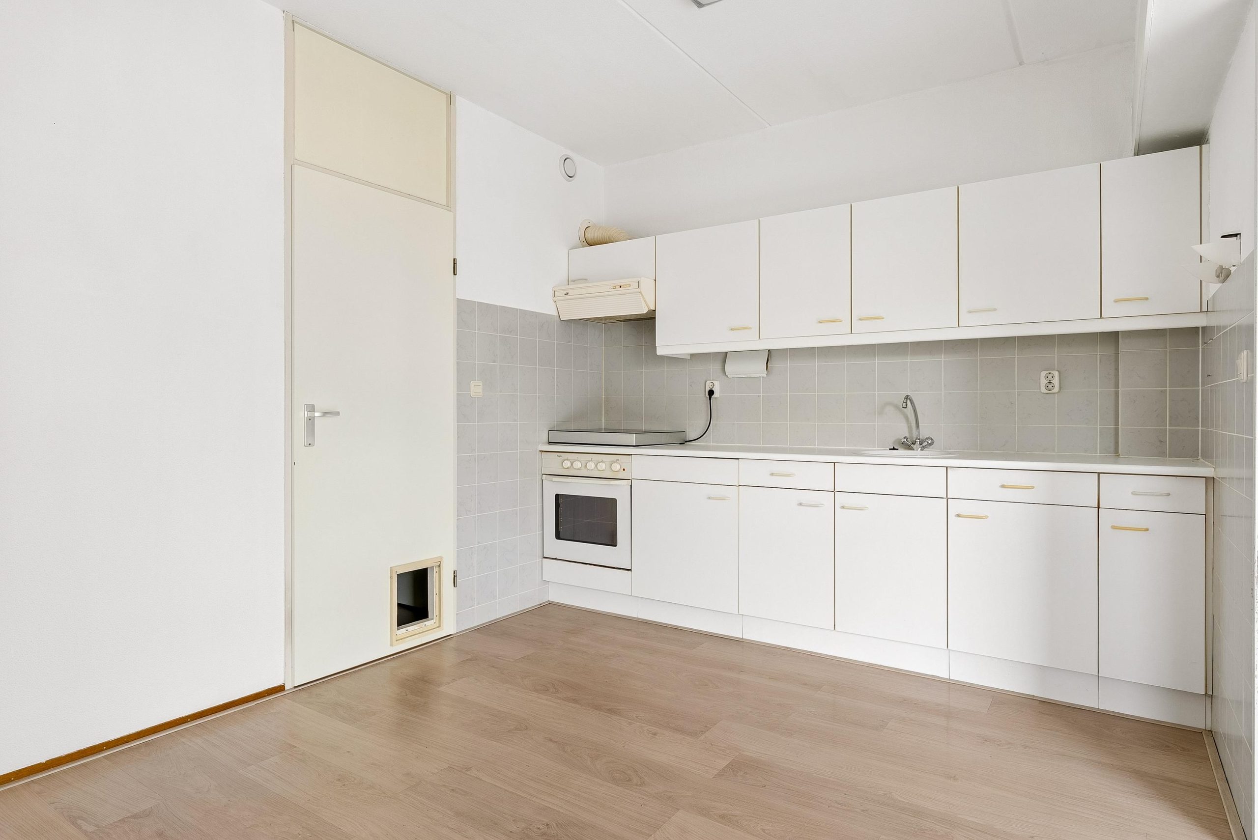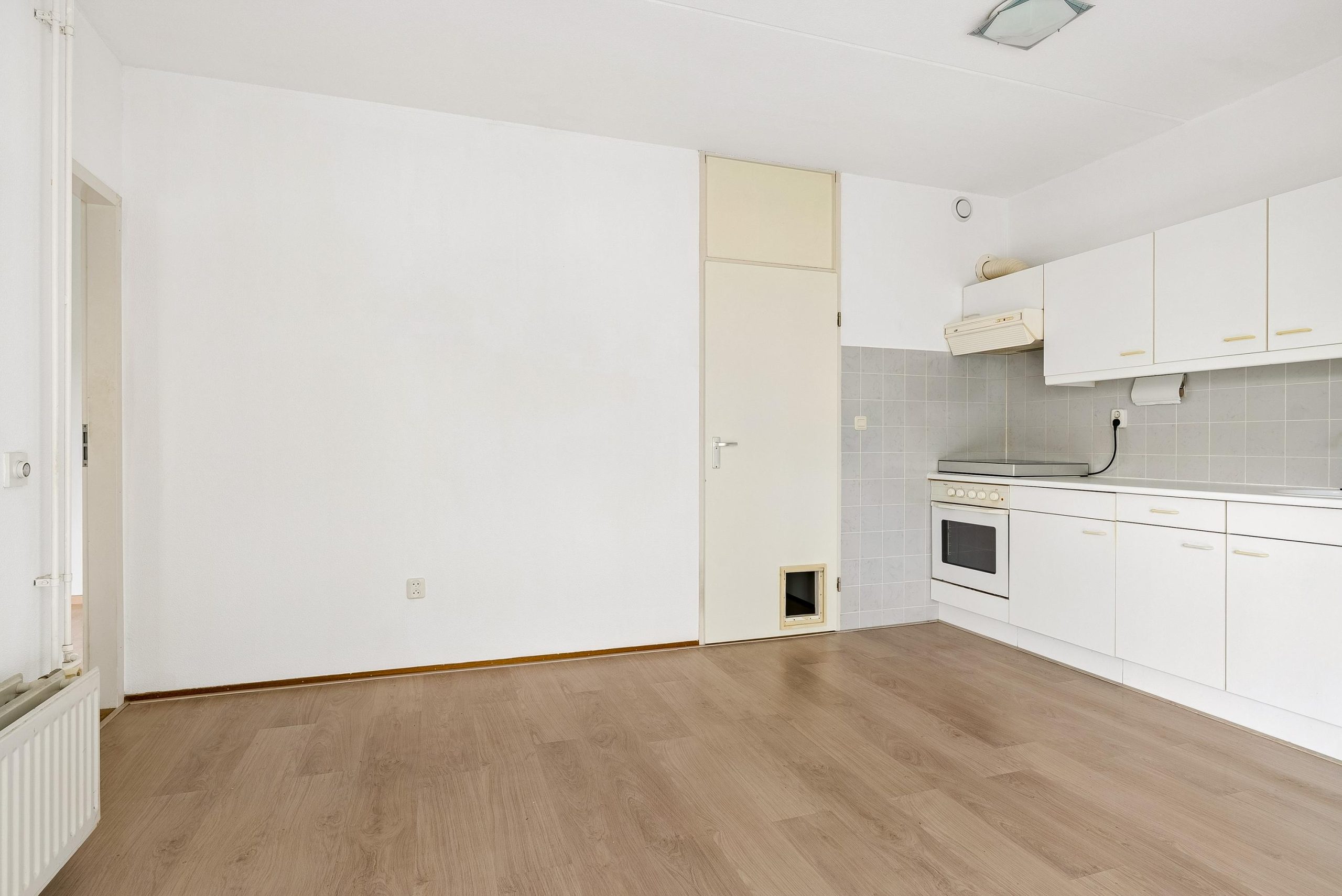 De hal leid je verder naar de ruime woonkamer met open keuken. Dankzij de grote raampartijen en het hoge plafond voelt deze ruimte licht en ruim aan. Vanuit de woonkamer heb je eveneens toegang tot de tuin. De eenvoudige keuken is voorzien van voldoende kastruimte, een oven, afzuigkap en 4-pits kookplaat.