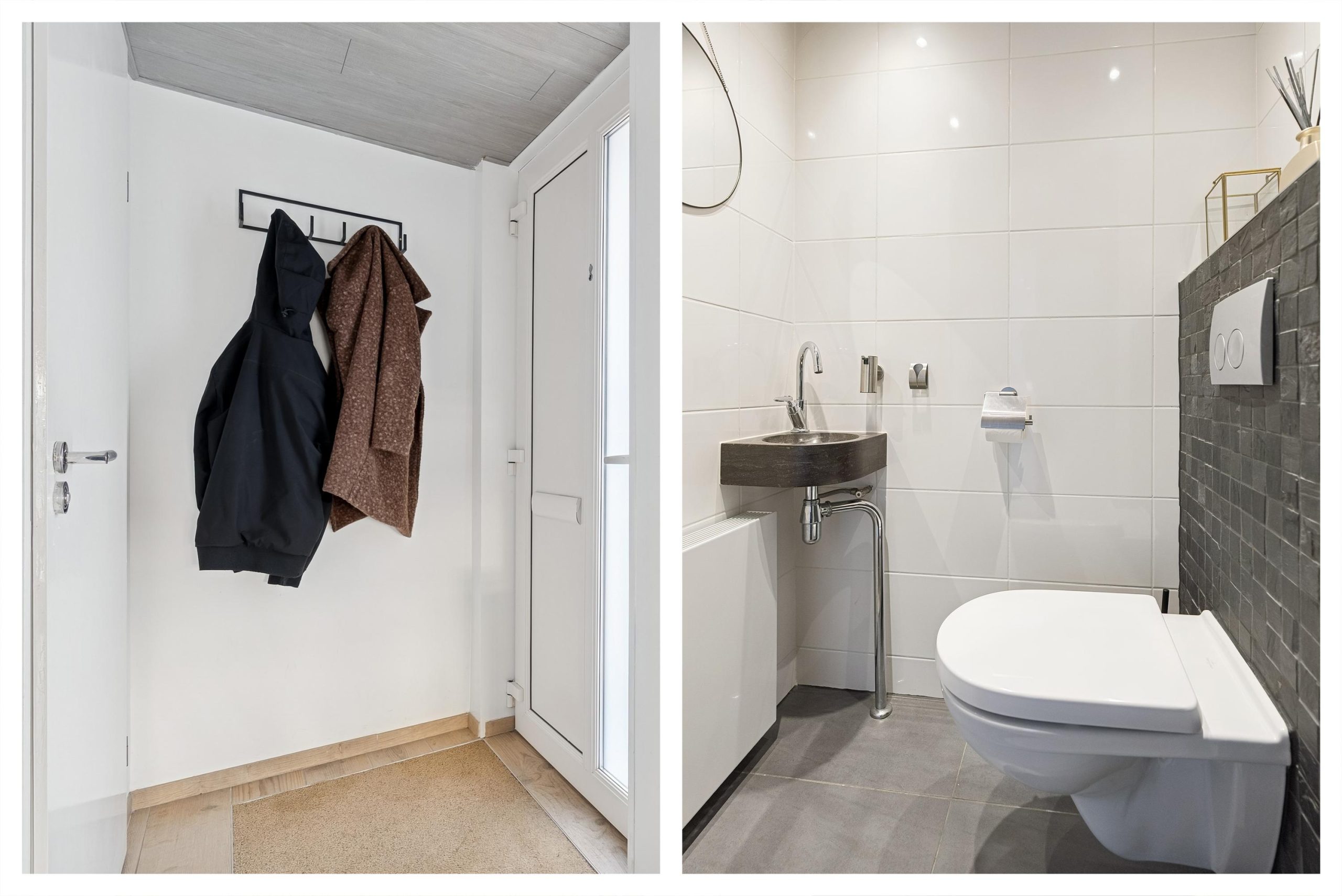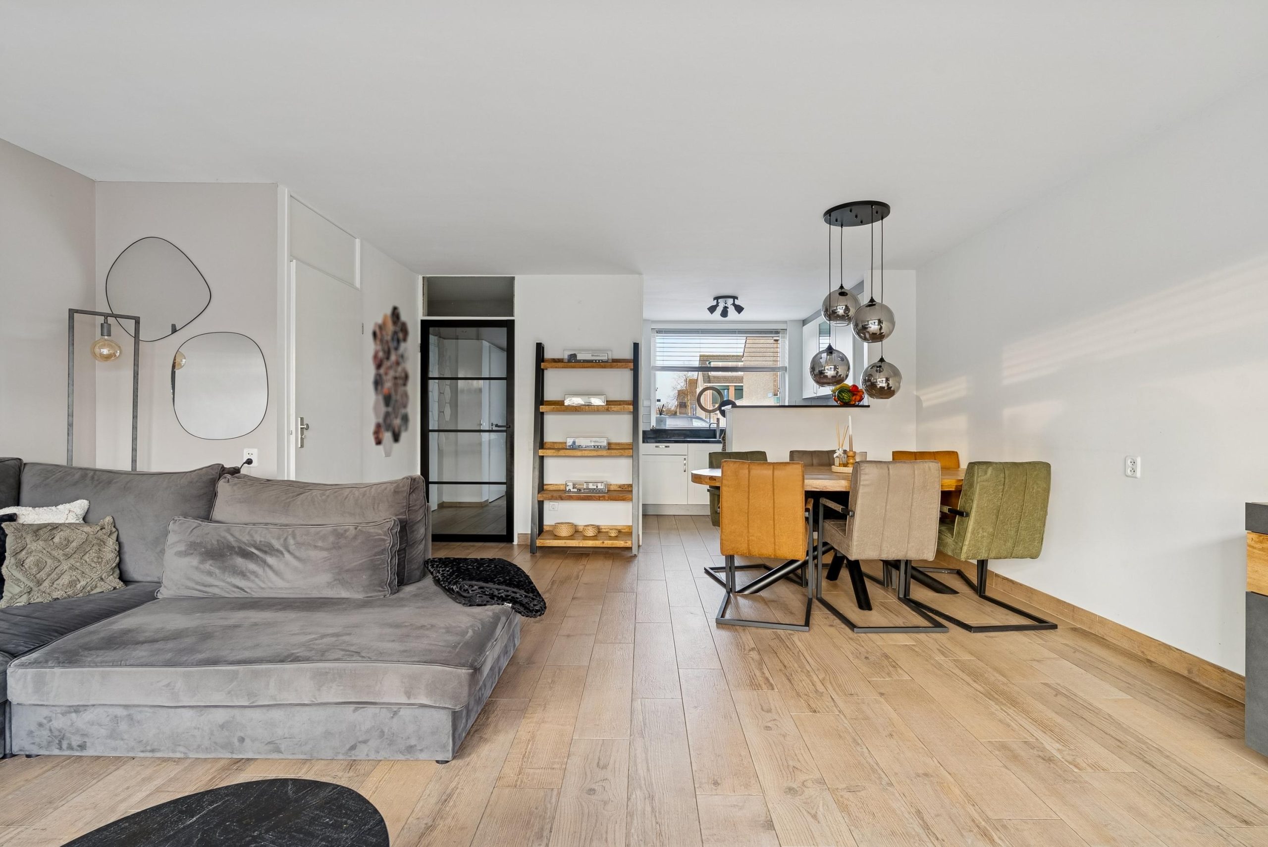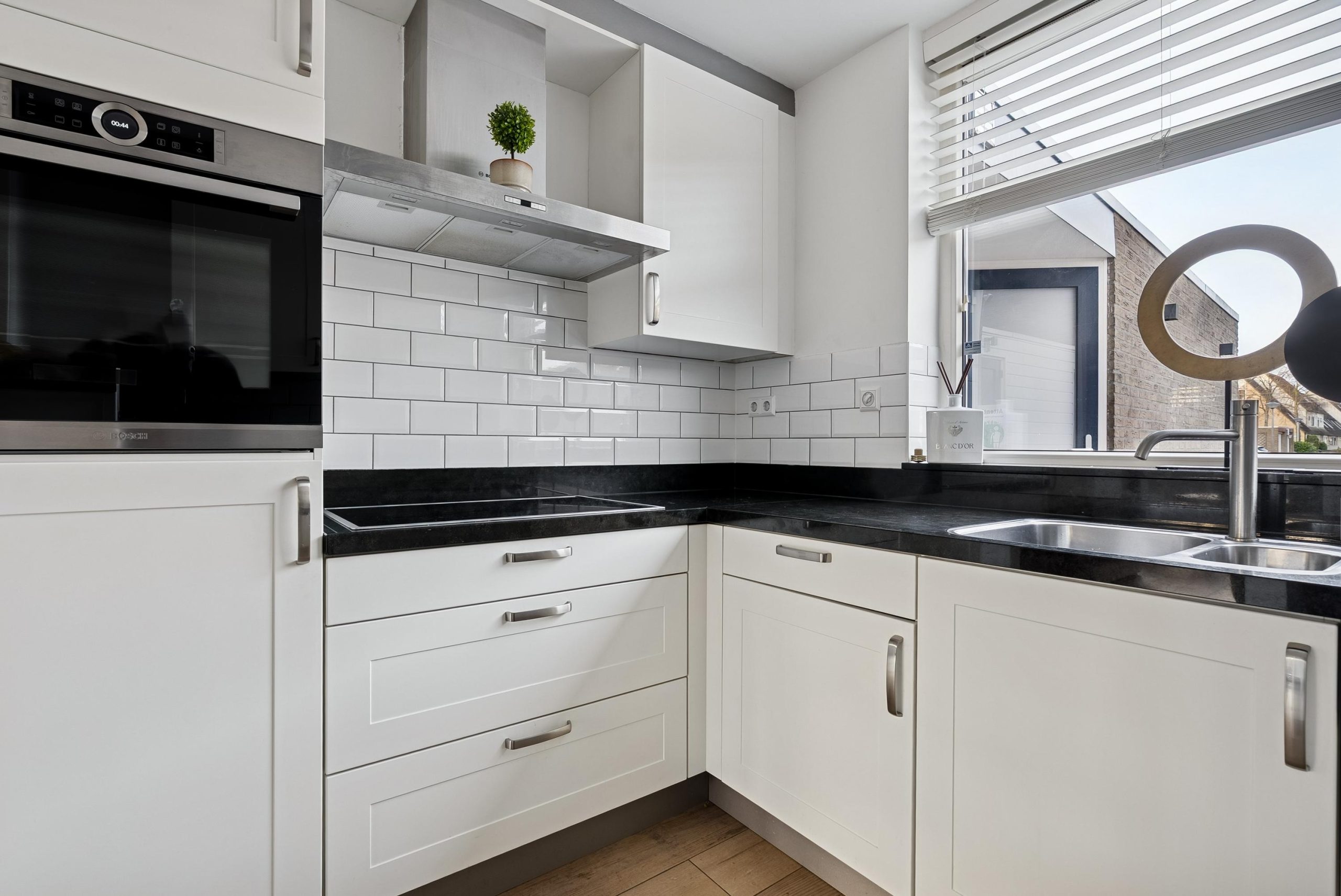 Via de entree van de woning kom je in de ruime hal met voldoende plek voor jassen en schoenen. Je vind hier ook het separate toilet. De royale woonkamer met open keuken is heerlijk licht dankzij de brede schuifpui aan de tuinzijde. De keuken aan de voorzijde is uitgevoerd in een moderne witte kleurstelling en opgesteld in een praktische U-vorm. Deze is voorzien van diverse inbouwapparatuur zoals een inductiekookplaat, afzuigkap, vaatwasser, koelkast en vriezer. Ook is er voldoende opbergruimte.