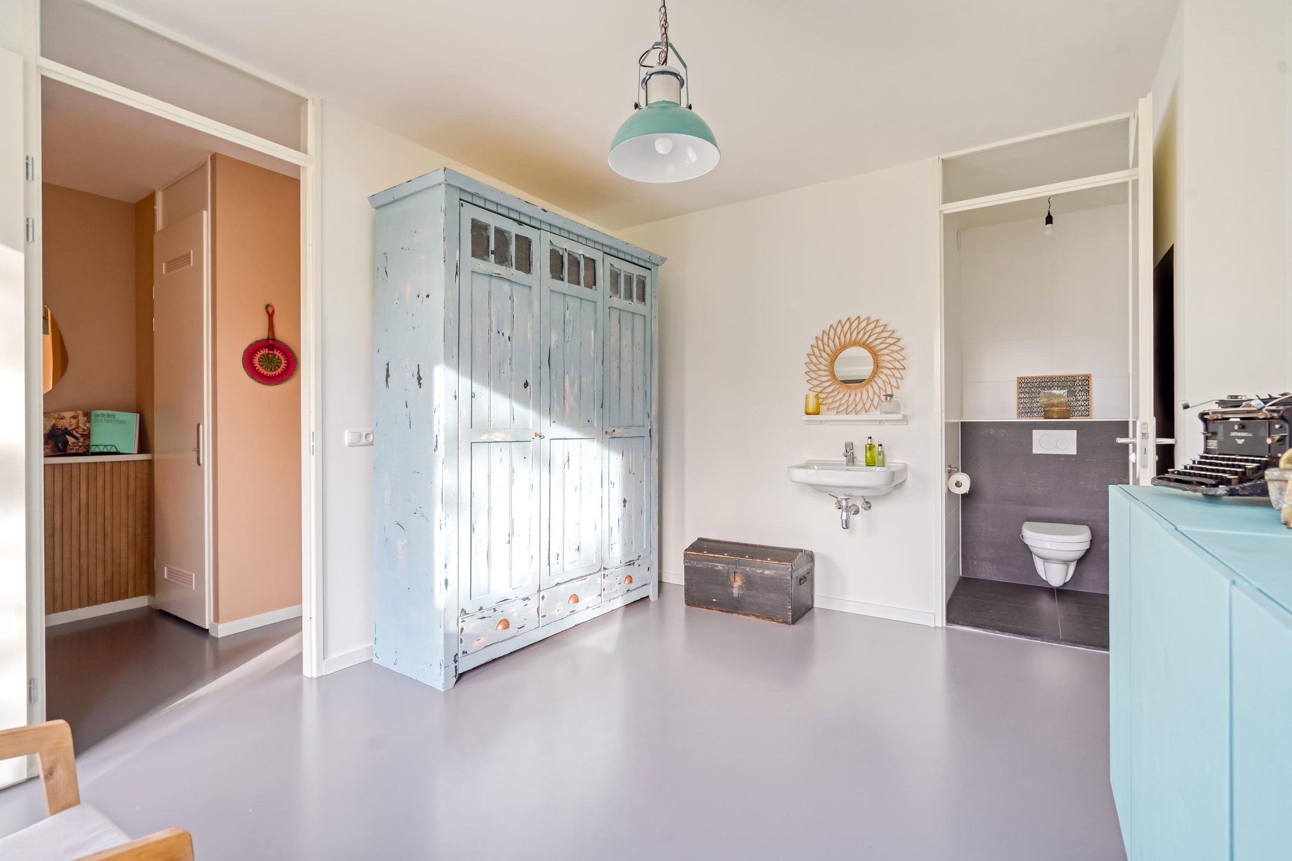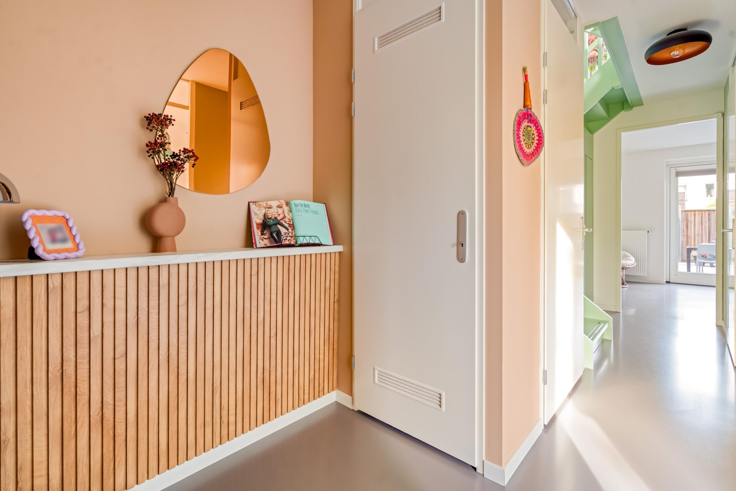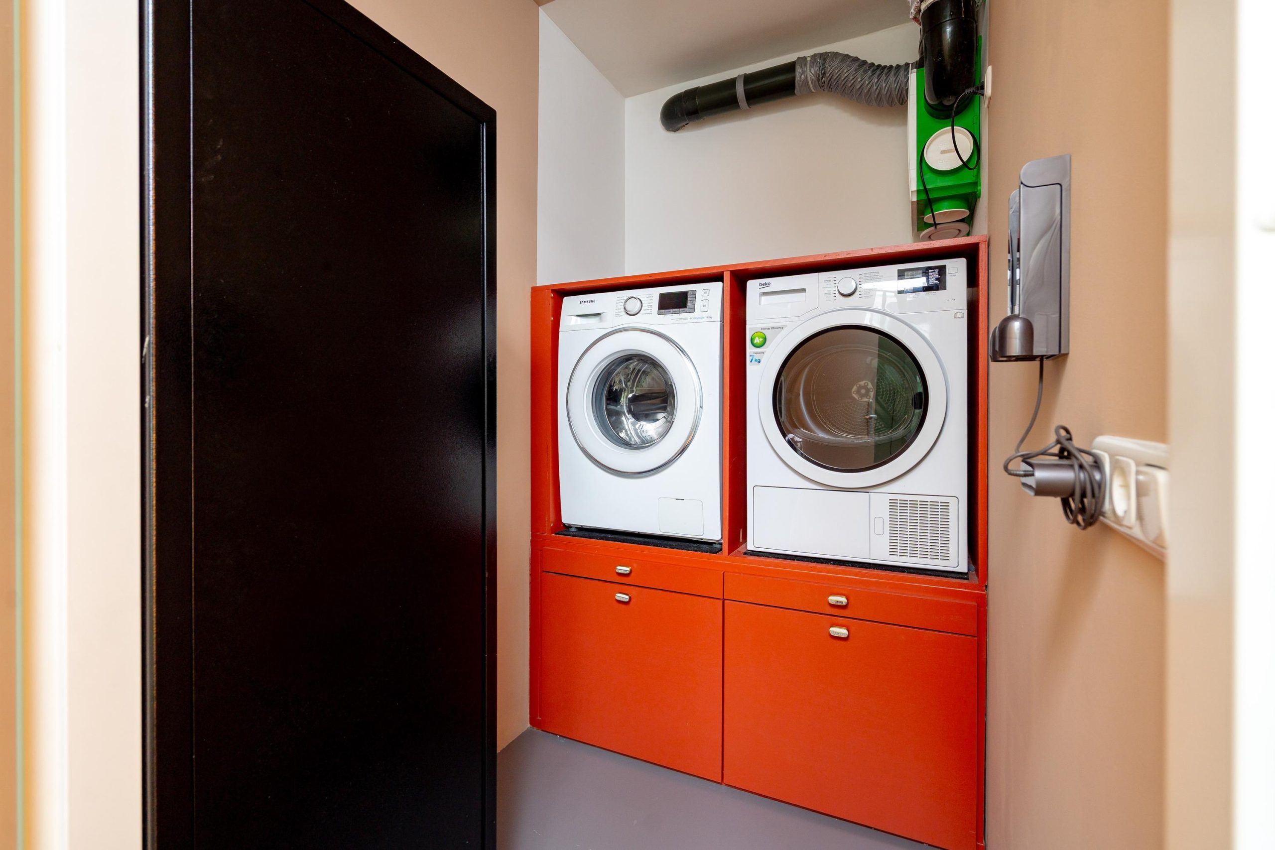 In de gang tref je de meest handige trapkast die je maar kan wensen. Deze is op maat gemaakt en praktisch ingedeeld als garderobe en schoenenkast in één. Alles is keurig weggewerkt en er is zeer efficient met de ruimte omgegaan. In de gang tref je tevens de wasruimte aan met plek voor de wasmachine en droger, hier blijft de op maat gemaakte wasmachine ombouw achter. De ombouw is zo gemaakt dat de wasmachine en droger op ooghoogte worden geplaatst. Daarnaast is de ruimte groot genoeg om nog het een en ander in op te bergen.