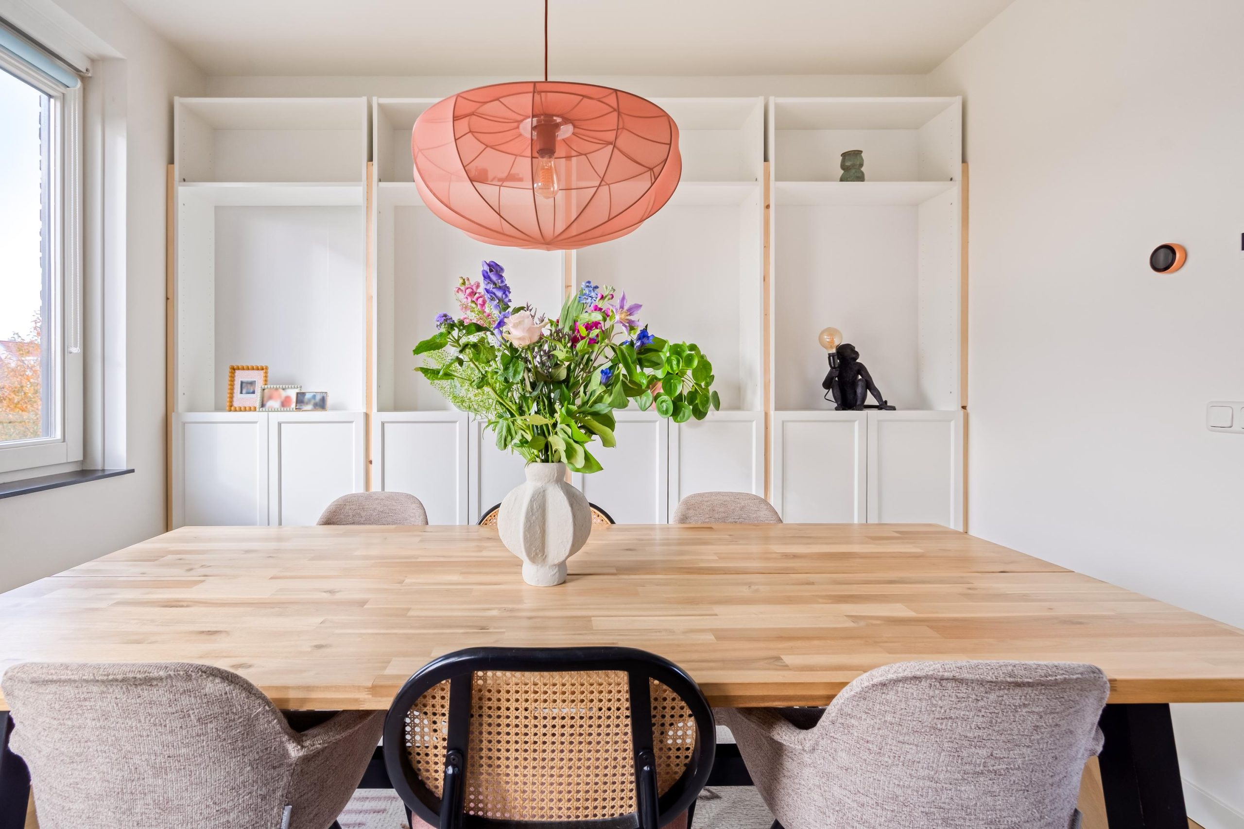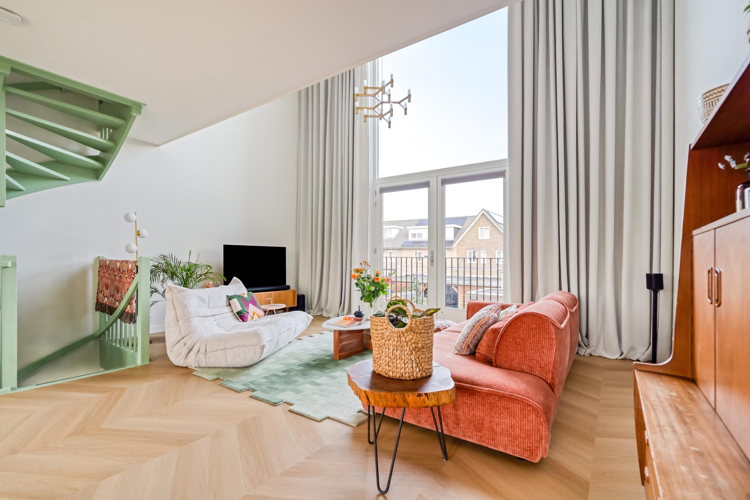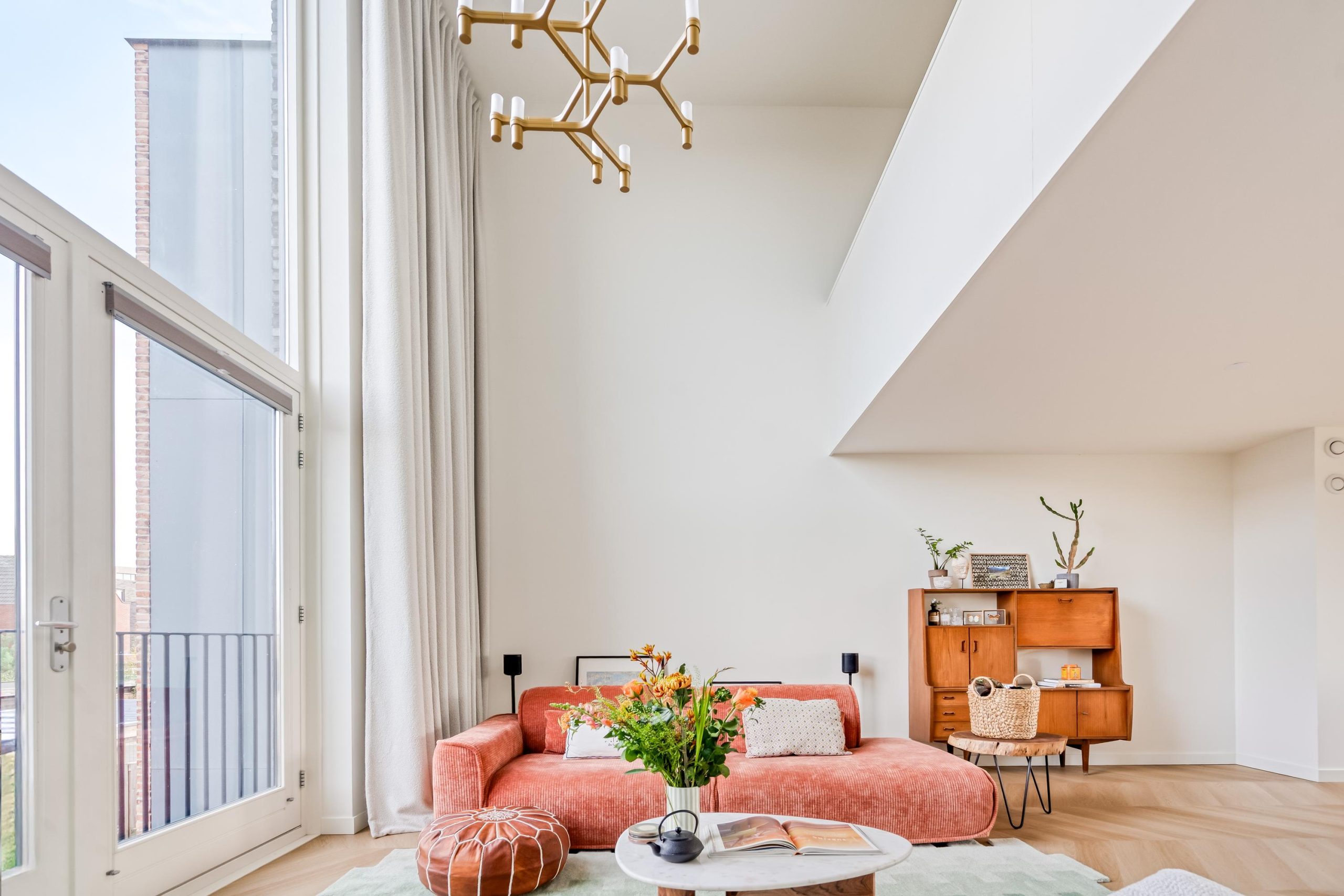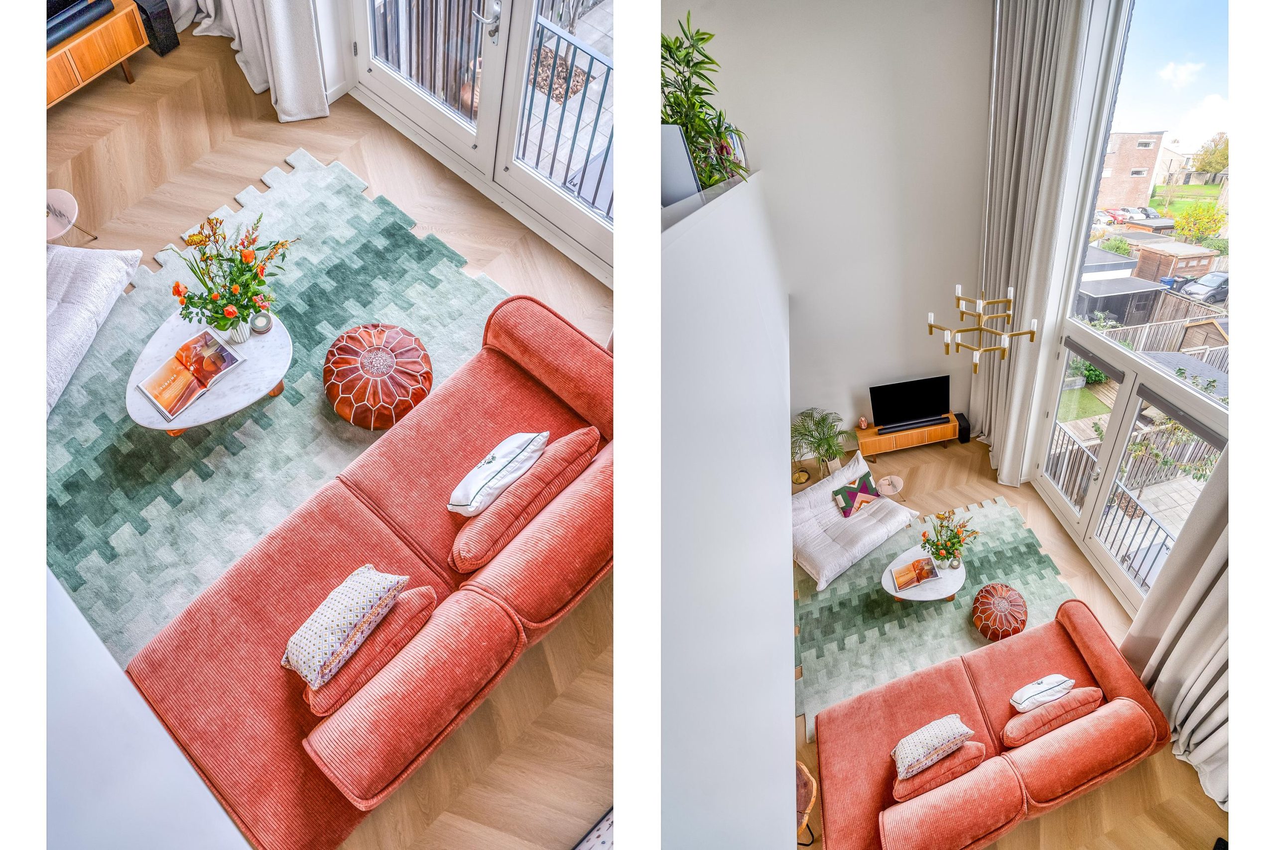 Dit is de verdieping waar geleefd en gekookt wordt. Waar je met elkaar lekker in de avond tv kijkt, met familie en vrienden gezellig borrelt en de mooiste maaltijden op tafel tovert. Direct valt de vide met de metershoge ramen op. In de ochtend sla je de openslaande deuren open en geniet je met je koffie en ontbijtje van de opgaande zon. Ook op de warme zomerdagen zijn de openslaande deuren ideaal. En om het nog comfortabeler te maken hebben de huidige bewoners gekozen voor prachtige (gloednieuwe!) gordijnen die op afstand te bedienen zijn, wel zo handig!