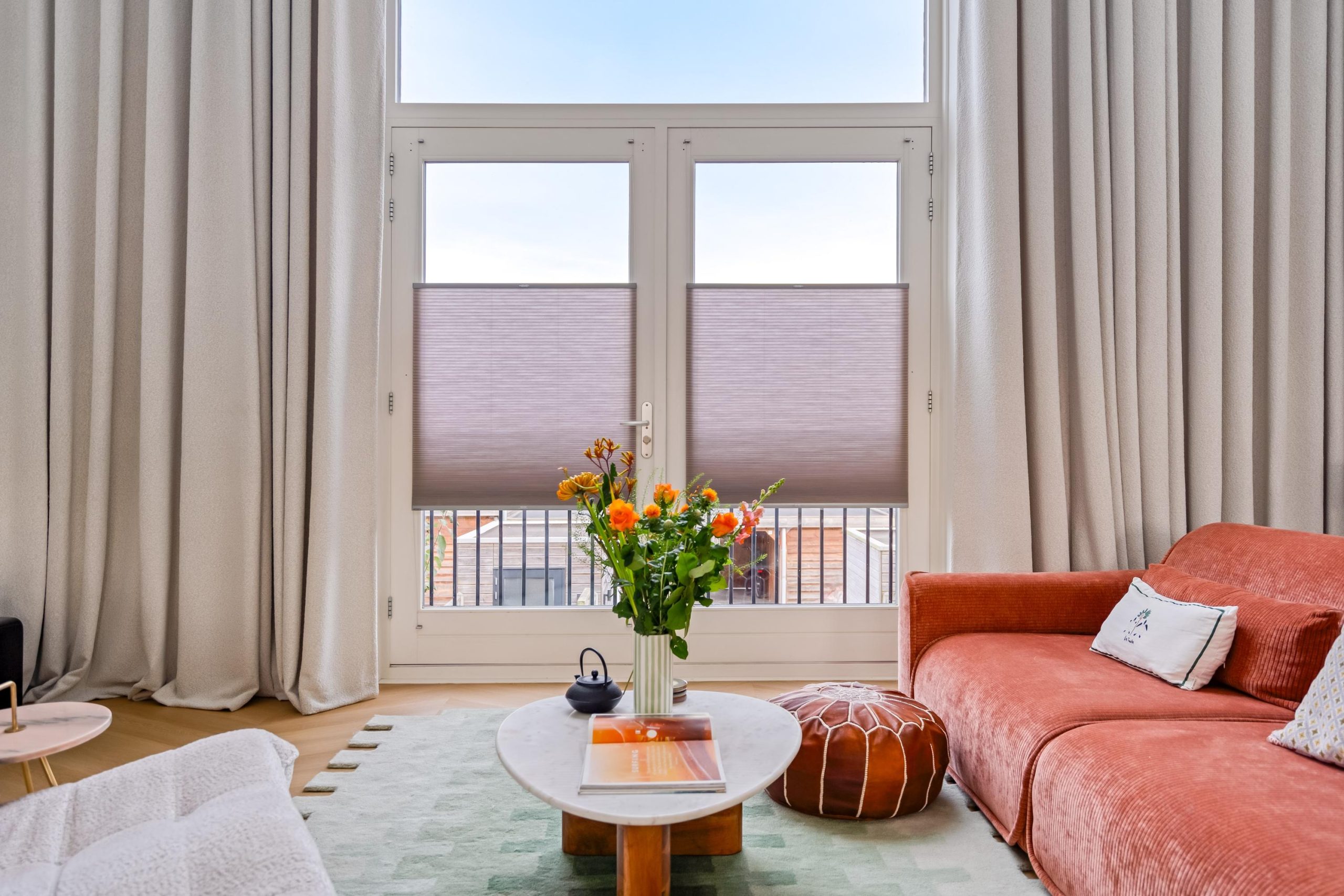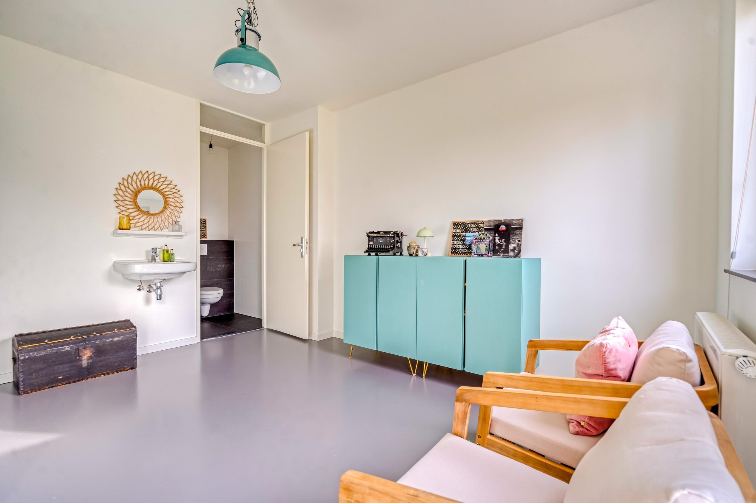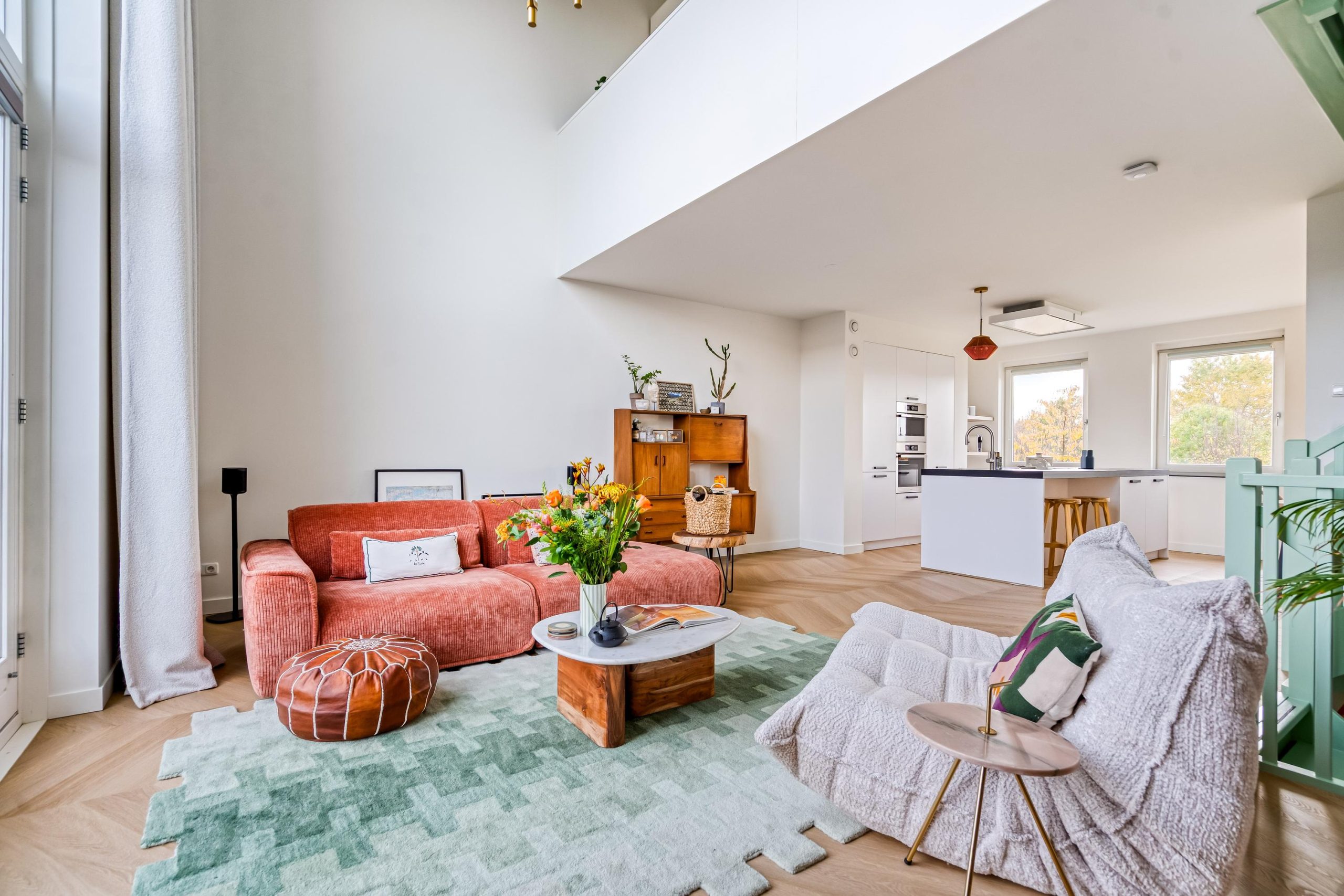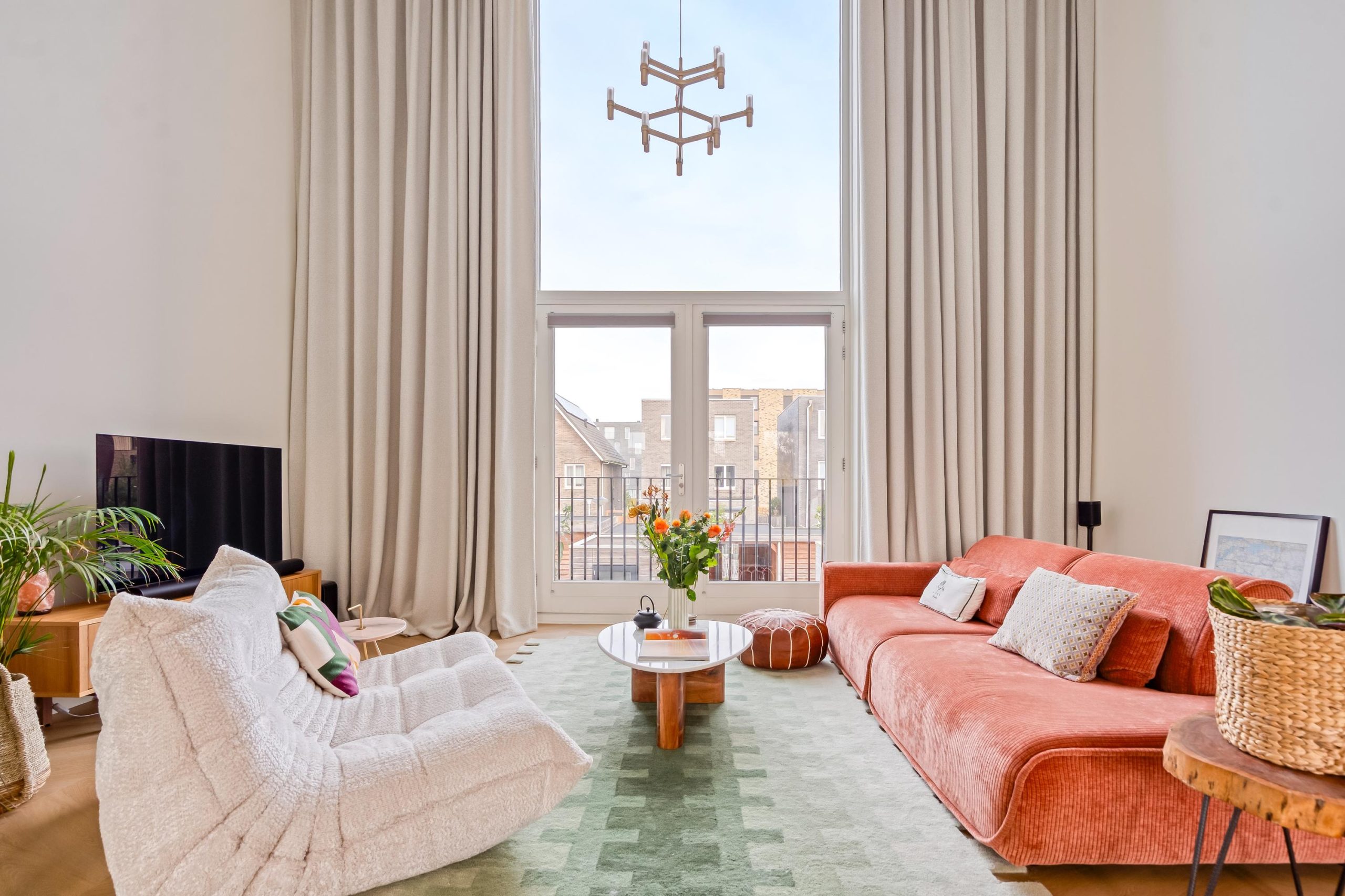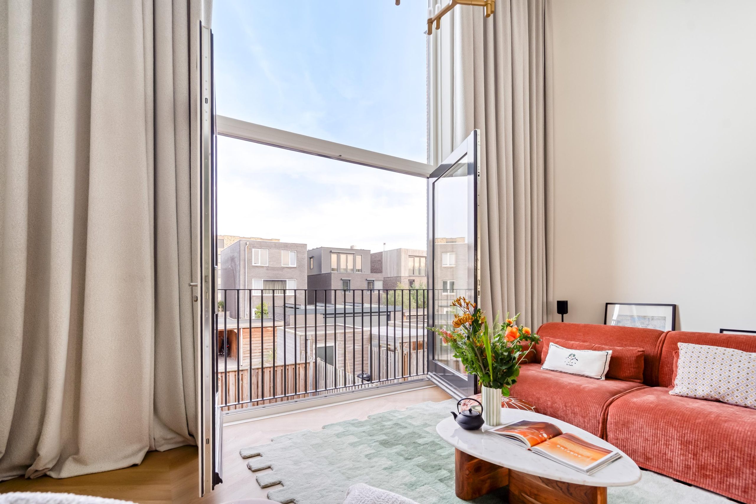 Dit is de verdieping waar geleefd en gekookt wordt. Waar je met elkaar lekker in de avond tv kijkt, met familie en vrienden gezellig borrelt en de mooiste maaltijden op tafel tovert. Direct valt de vide met de metershoge ramen op. In de ochtend sla je de openslaande deuren open en geniet je met je koffie en ontbijtje van de opgaande zon. Ook op de warme zomerdagen zijn de openslaande deuren ideaal. En om het nog comfortabeler te maken hebben de huidige bewoners gekozen voor prachtige (gloednieuwe!) gordijnen die op afstand te bedienen zijn, wel zo handig!