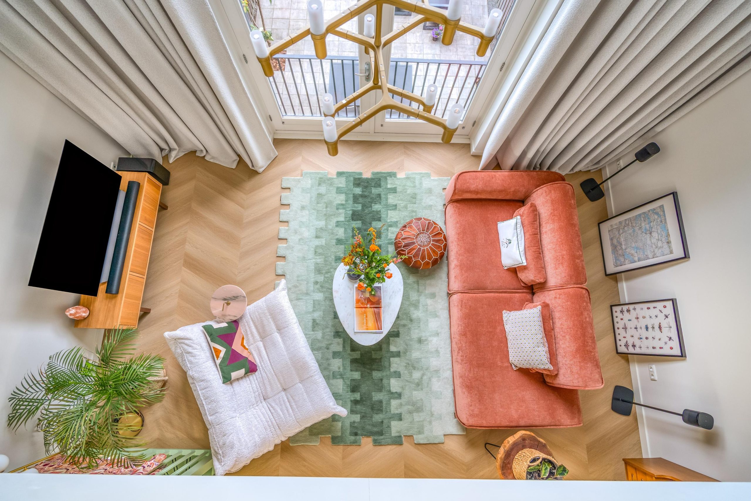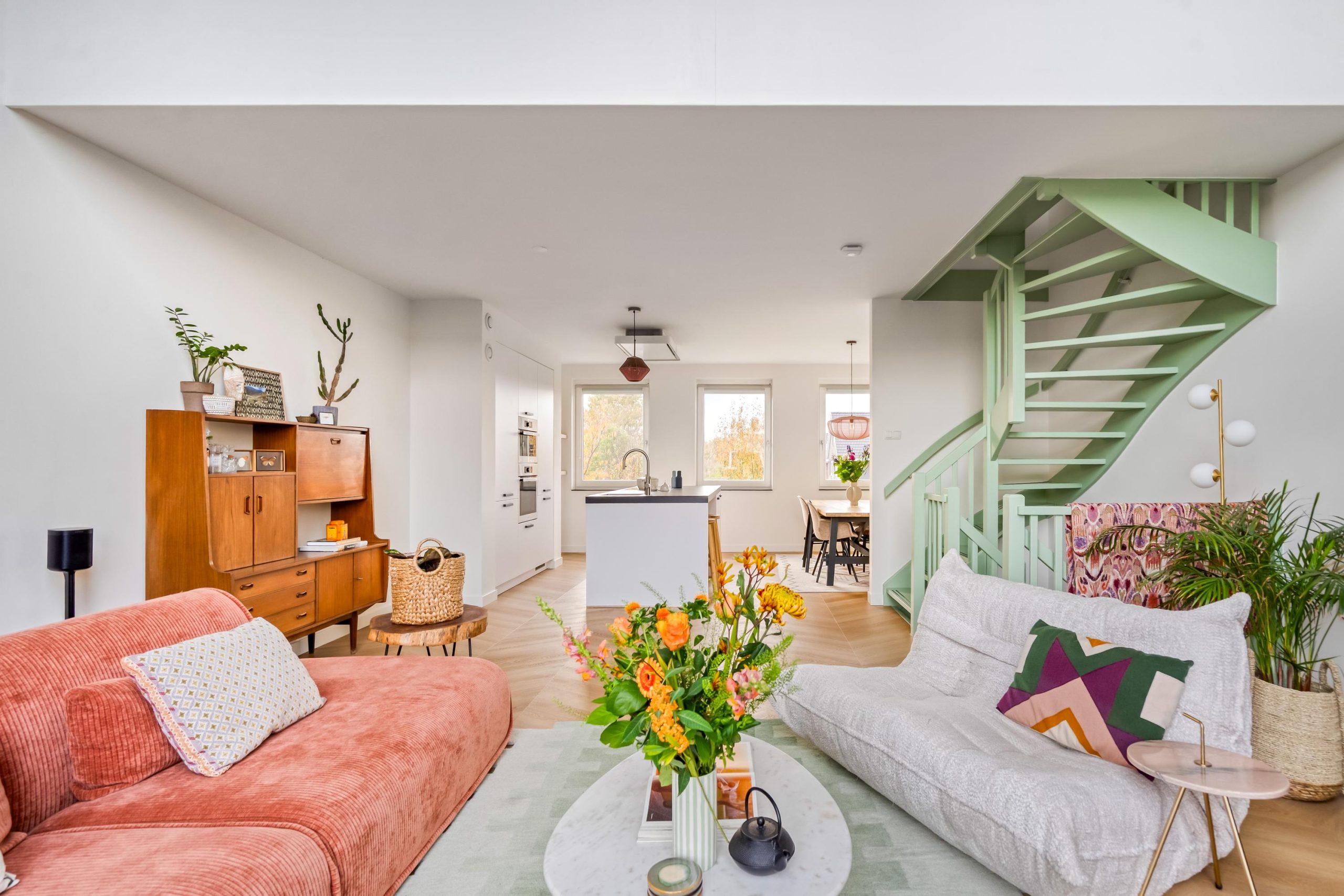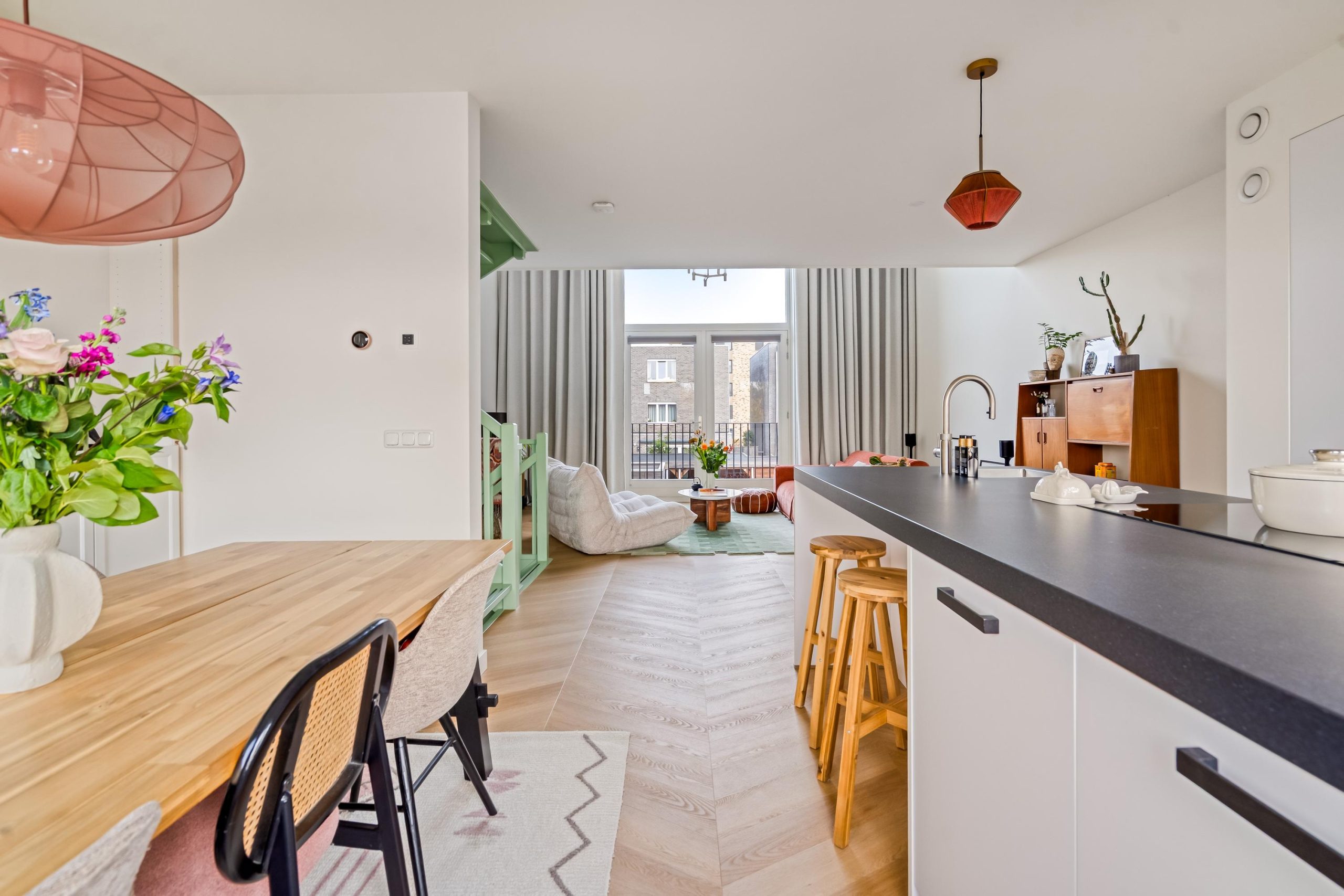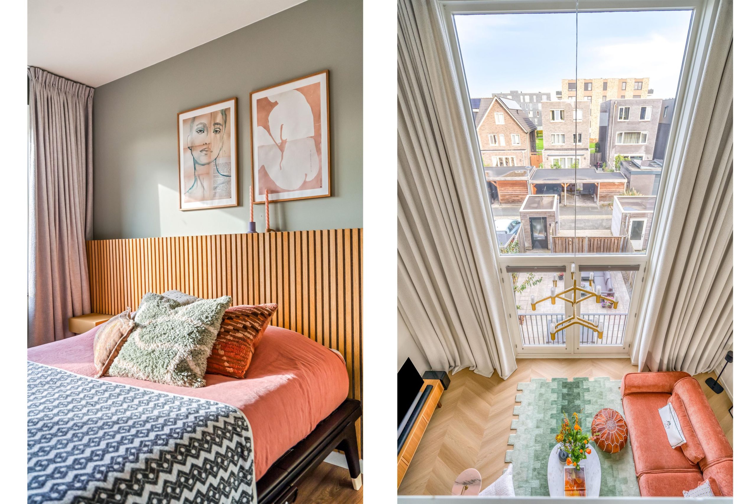 Dit is de verdieping waar geleefd en gekookt wordt. Waar je met elkaar lekker in de avond tv kijkt, met familie en vrienden gezellig borrelt en de mooiste maaltijden op tafel tovert. Direct valt de vide met de metershoge ramen op. In de ochtend sla je de openslaande deuren open en geniet je met je koffie en ontbijtje van de opgaande zon. Ook op de warme zomerdagen zijn de openslaande deuren ideaal. En om het nog comfortabeler te maken hebben de huidige bewoners gekozen voor prachtige (gloednieuwe!) gordijnen die op afstand te bedienen zijn, wel zo handig!