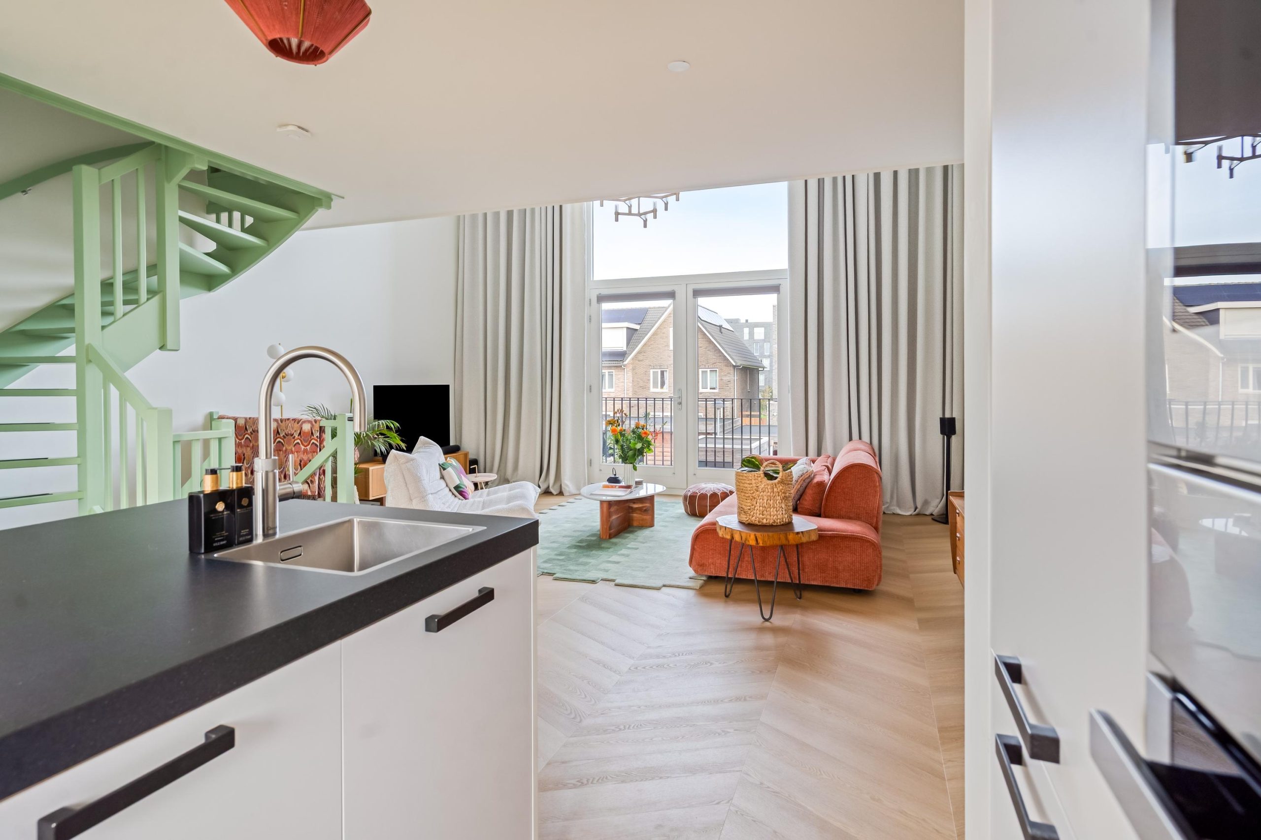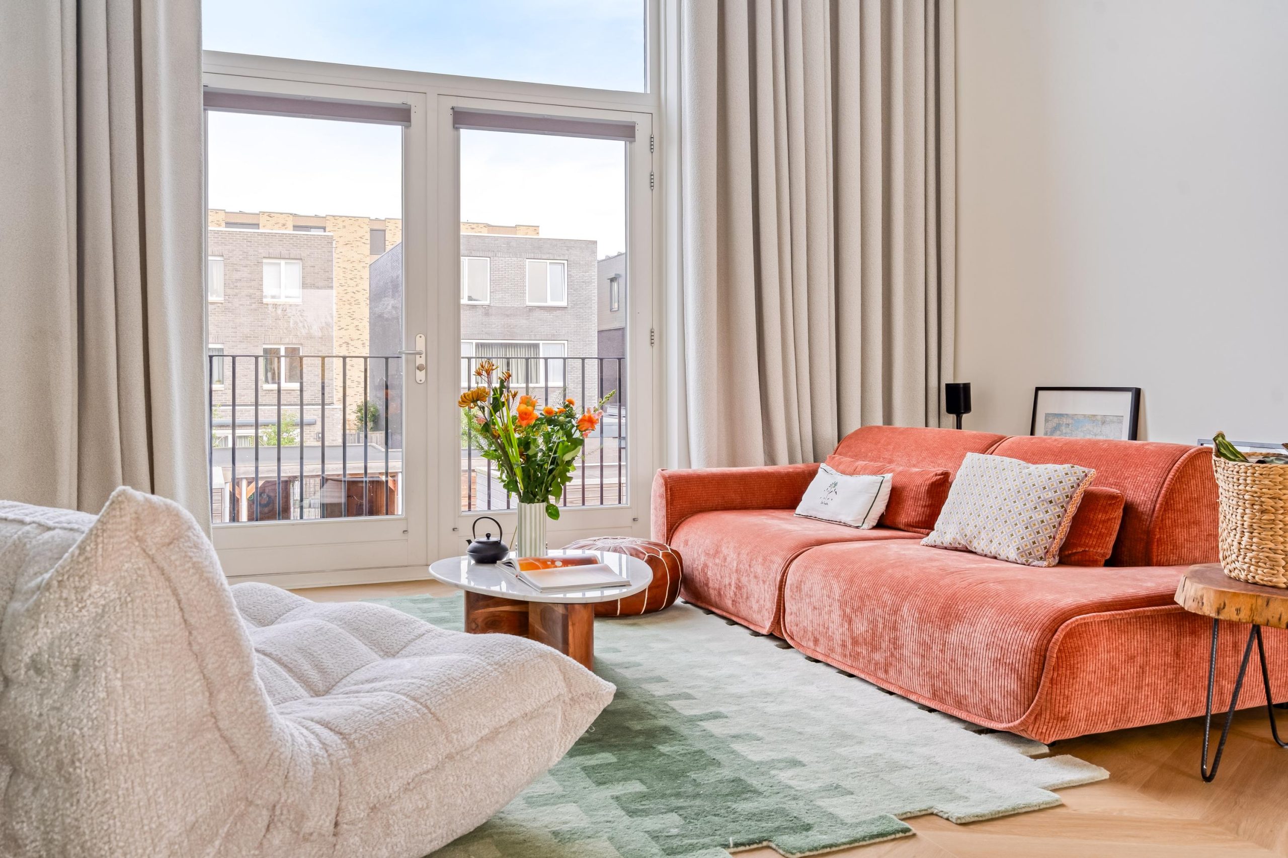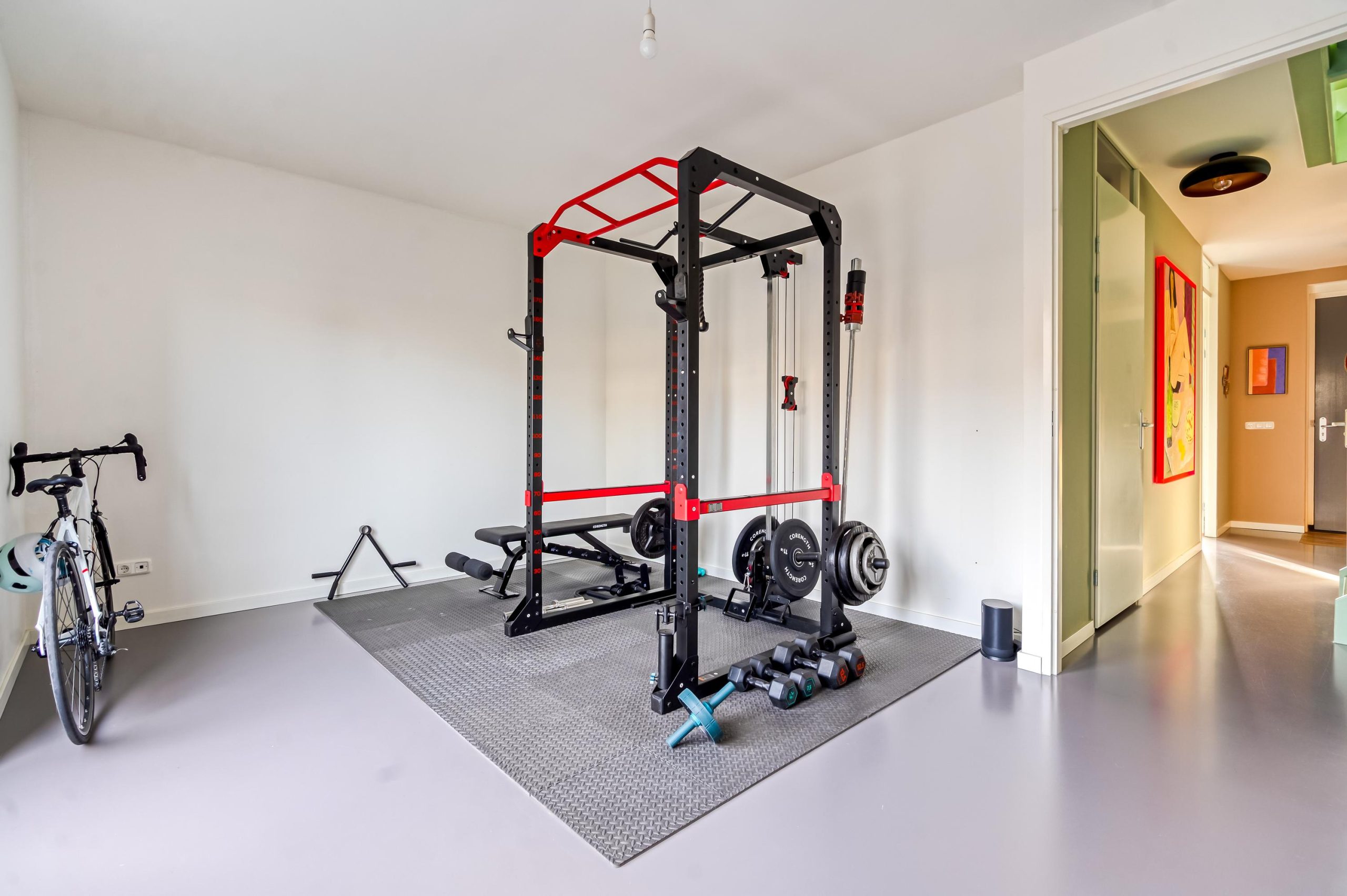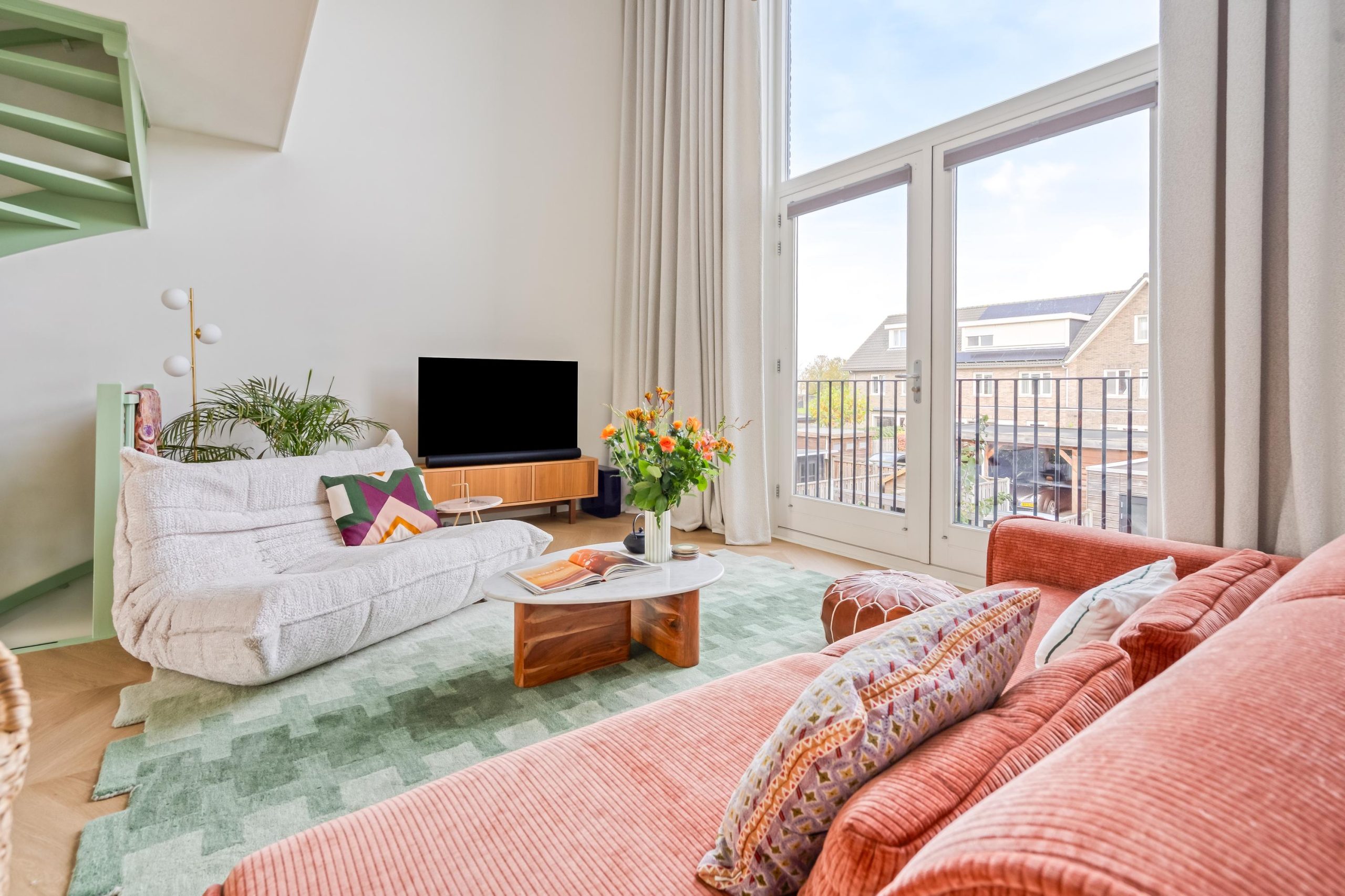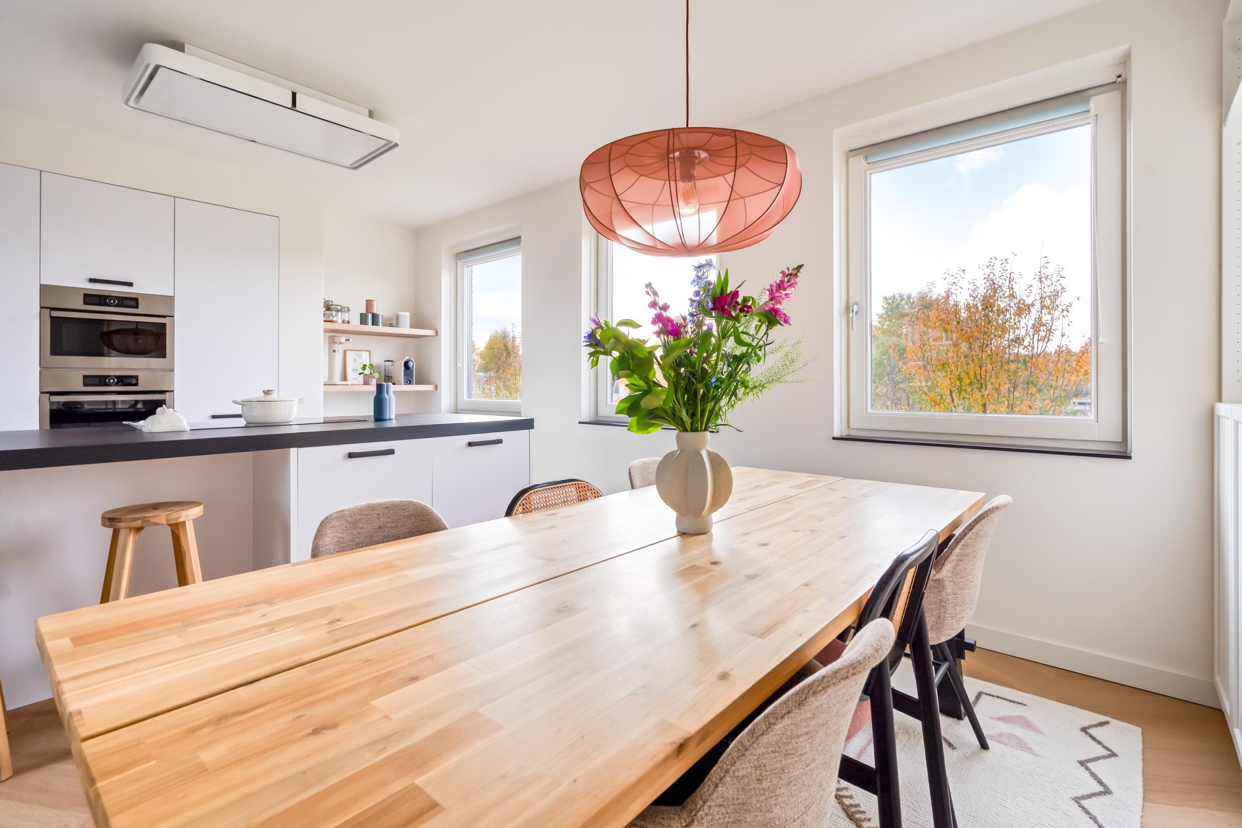Dit is de verdieping waar geleefd en gekookt wordt. Waar je met elkaar lekker in de avond tv kijkt, met familie en vrienden gezellig borrelt en de mooiste maaltijden op tafel tovert. Direct valt de vide met de metershoge ramen op. In de ochtend sla je de openslaande deuren open en geniet je met je koffie en ontbijtje van de opgaande zon. Ook op de warme zomerdagen zijn de openslaande deuren ideaal. En om het nog comfortabeler te maken hebben de huidige bewoners gekozen voor prachtige (gloednieuwe!) gordijnen die op afstand te bedienen zijn, wel zo handig!