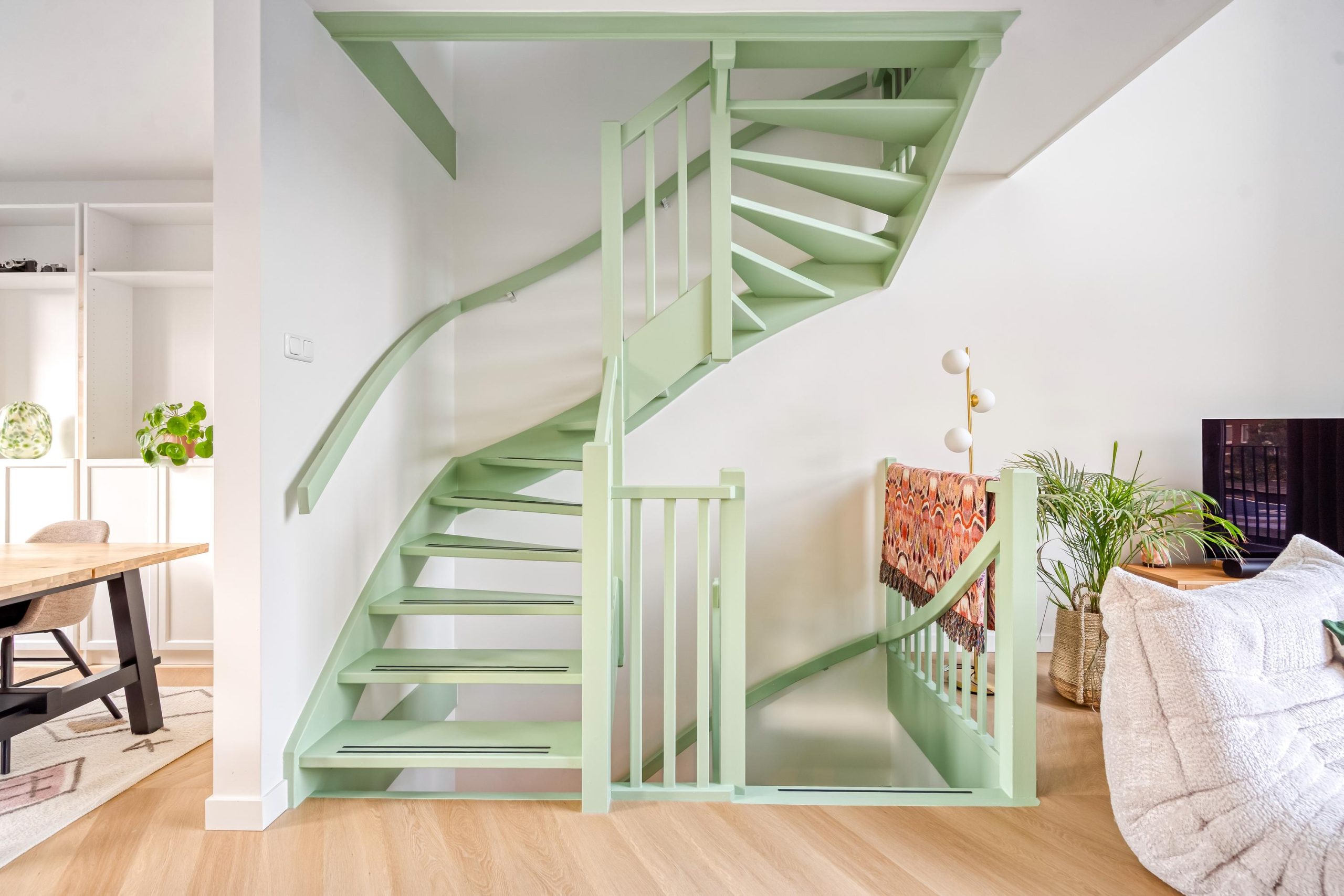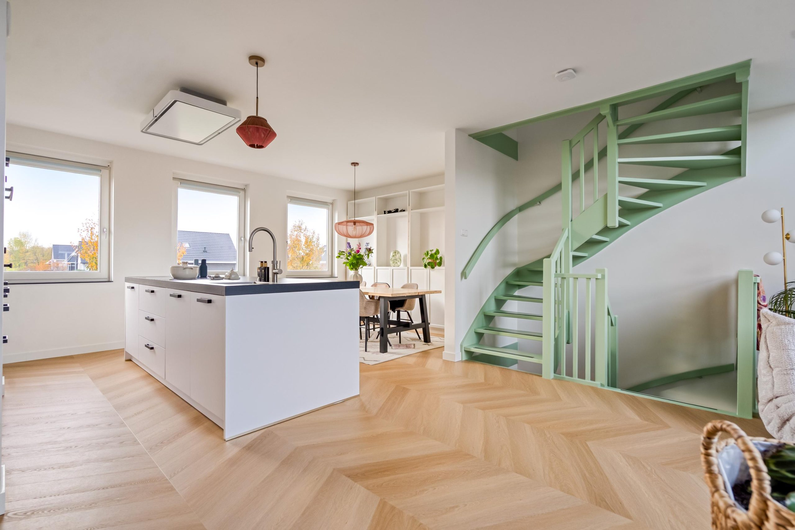 De PVC vloer is in 2024 vernieuwd en gelegd in de populaire Hongaarse punt en afgewerkt met hoge witte plinten. De gehele verdieping is voorzien van vloerverwarming.