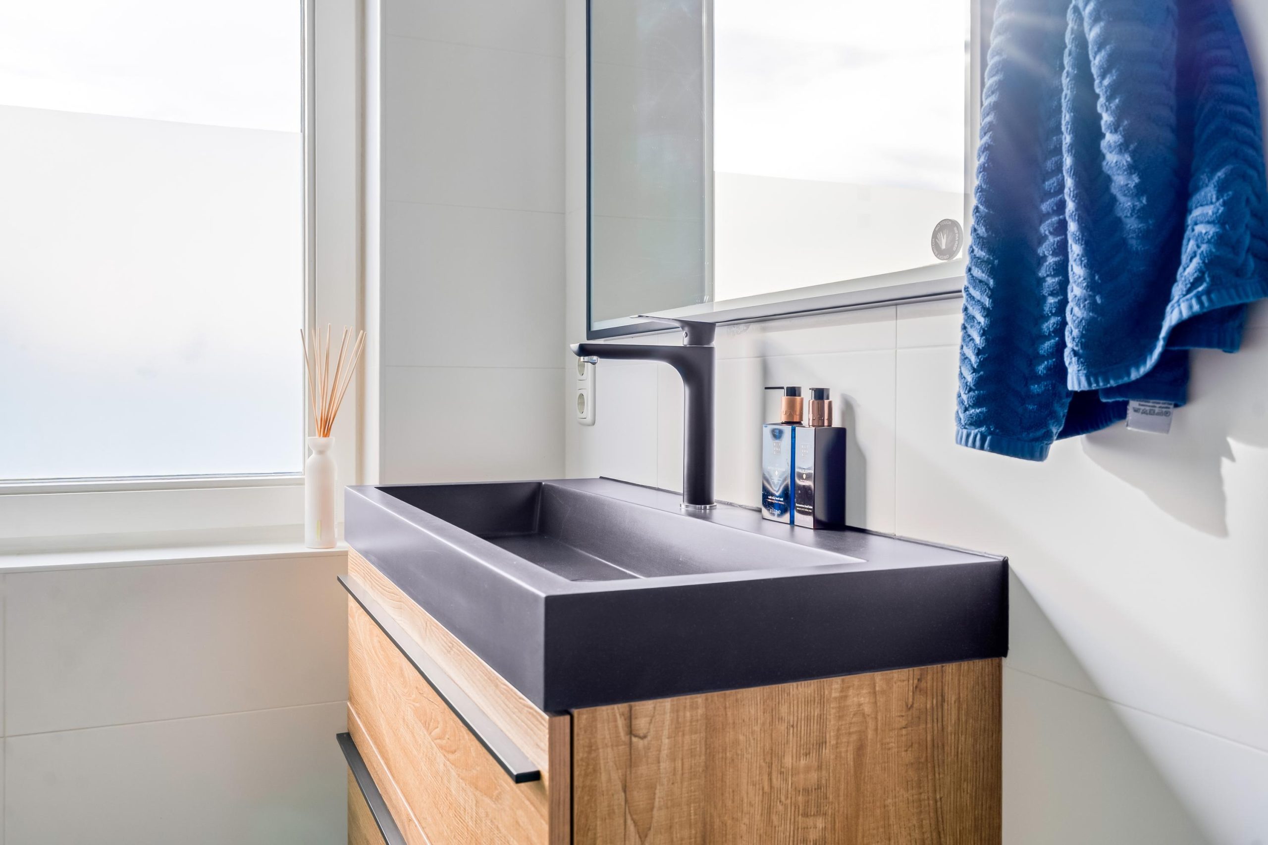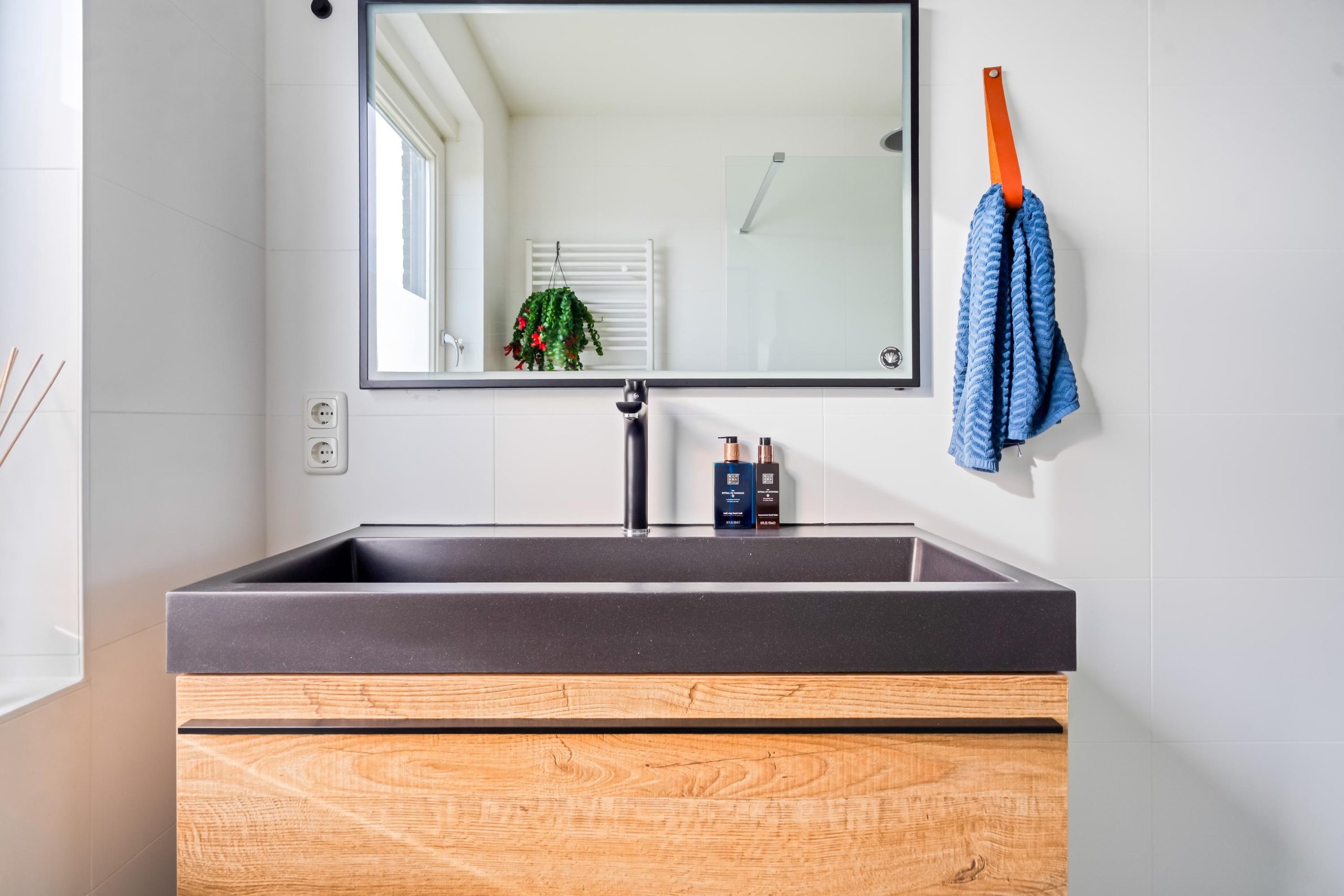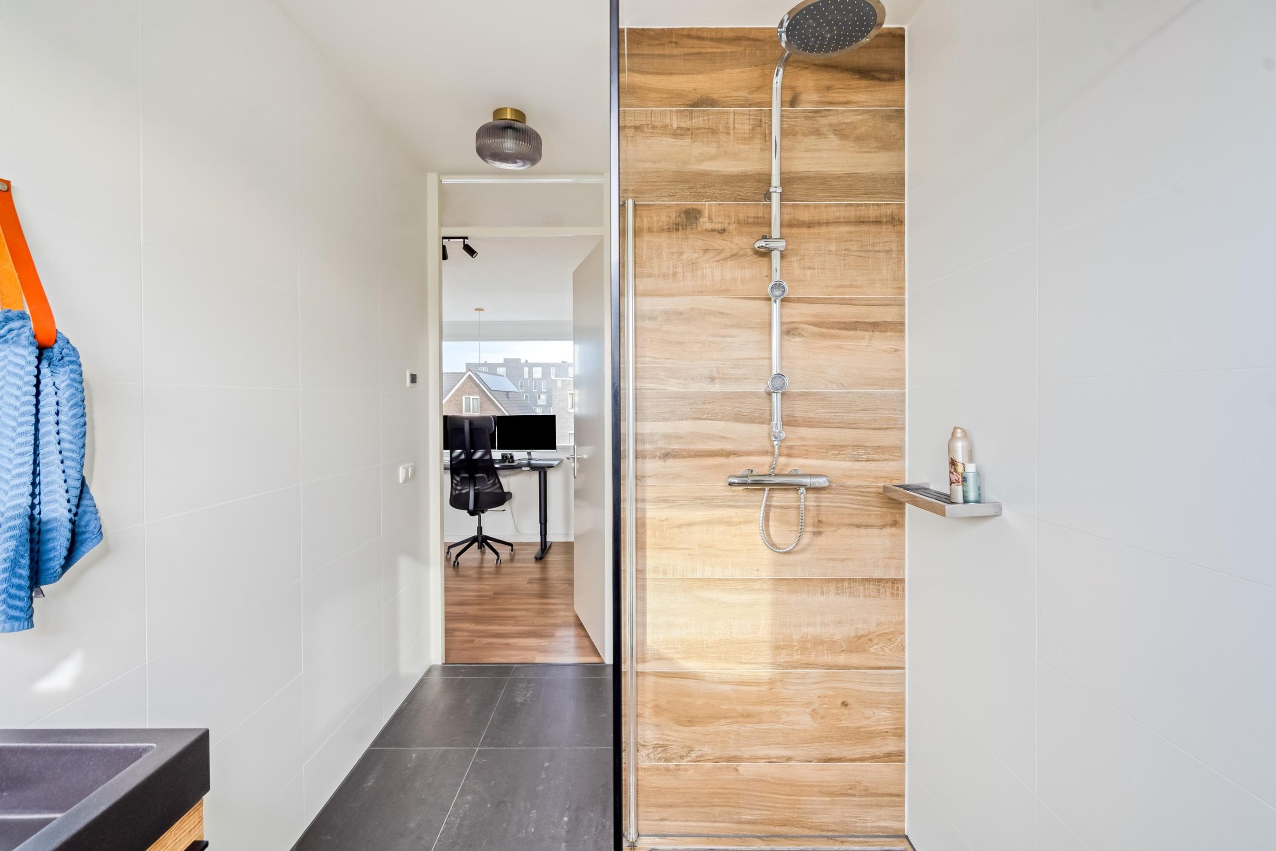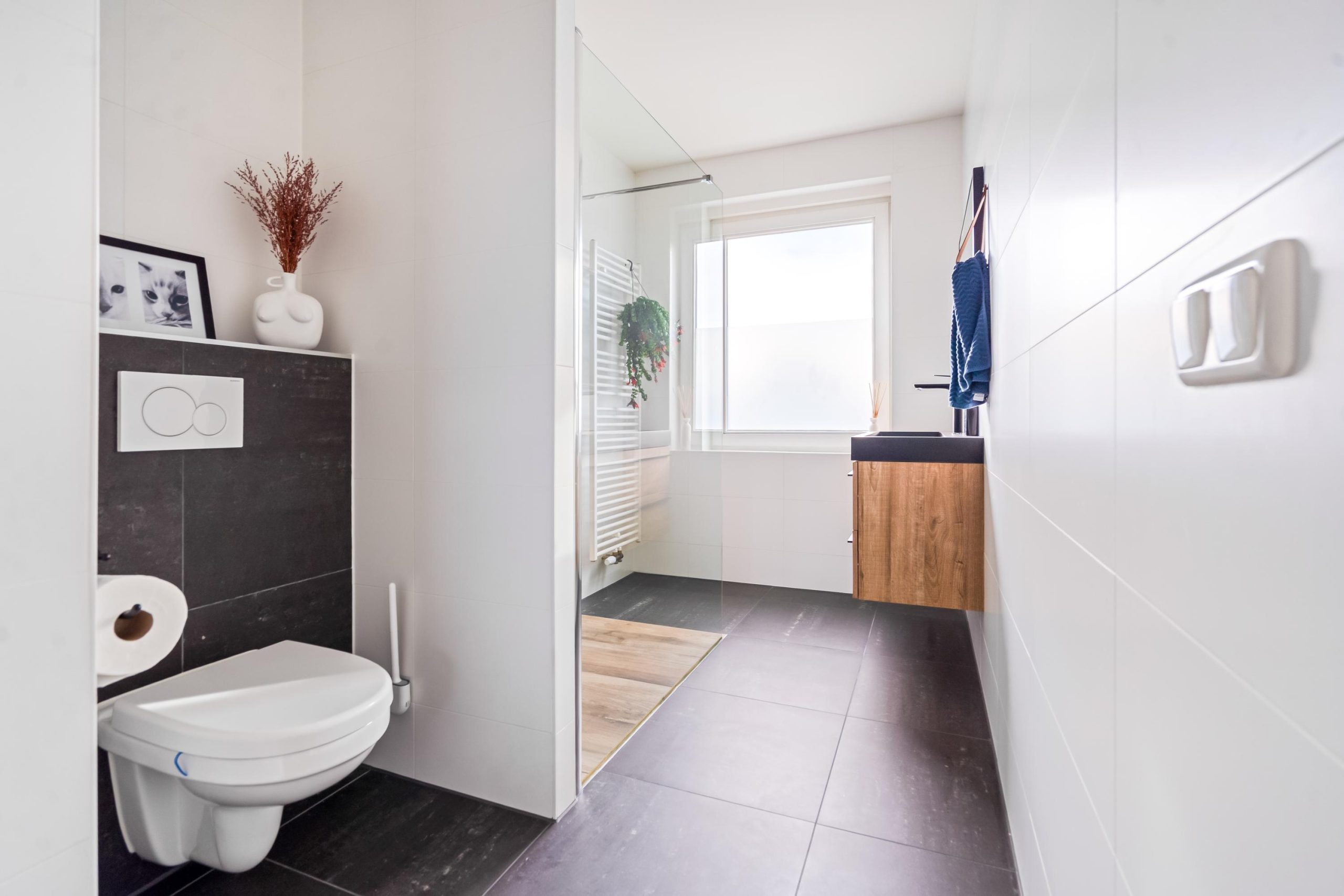 De badkamer is voorzien van wastafel met meubel, inloopdouche, toilet en handdoekradiator. Zowel de vloer als de wanden zijn keurig betegeld.