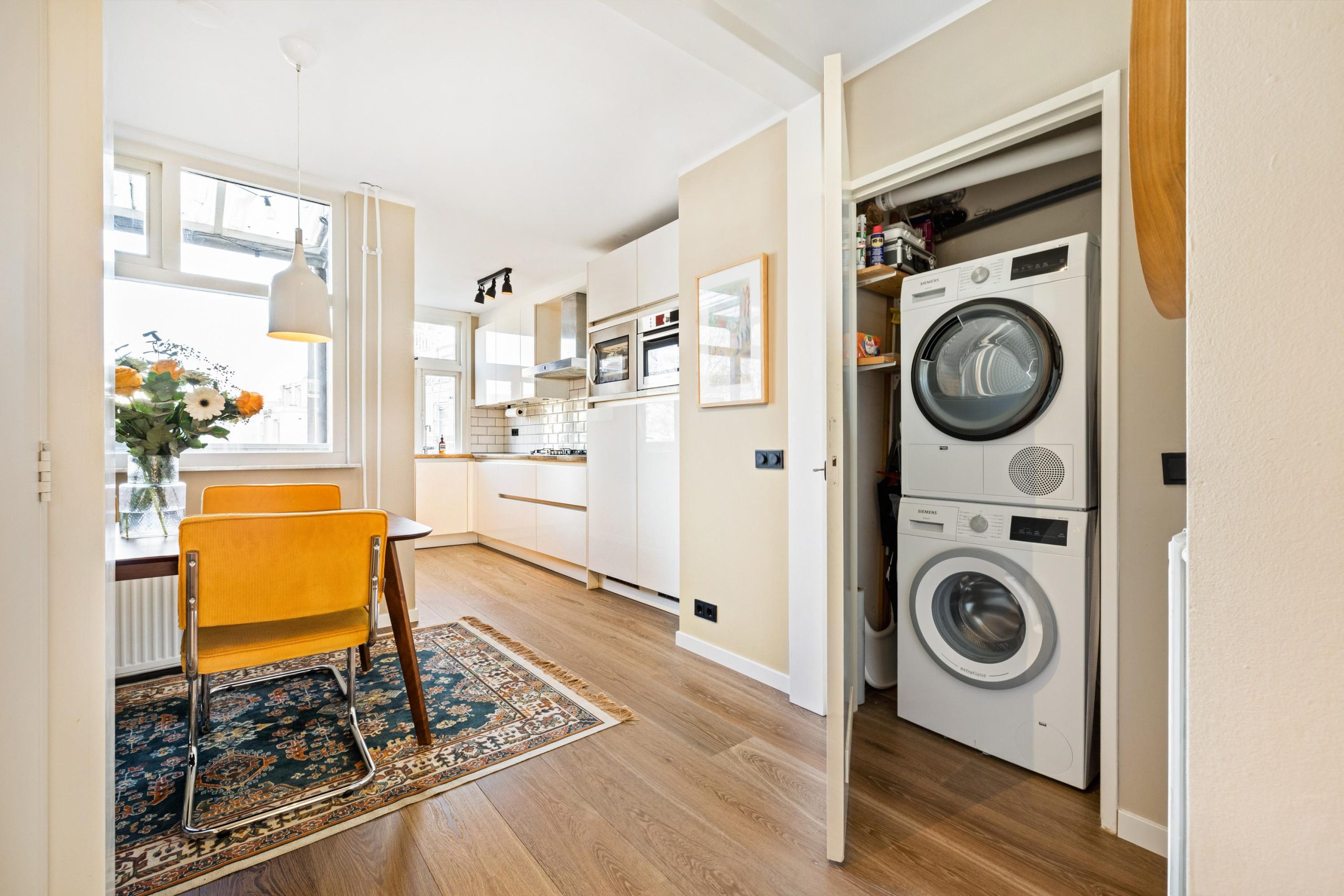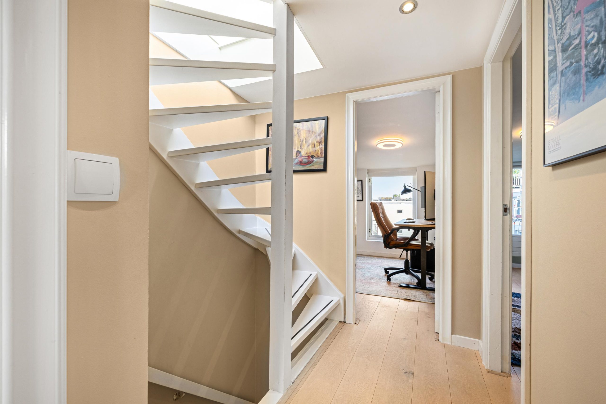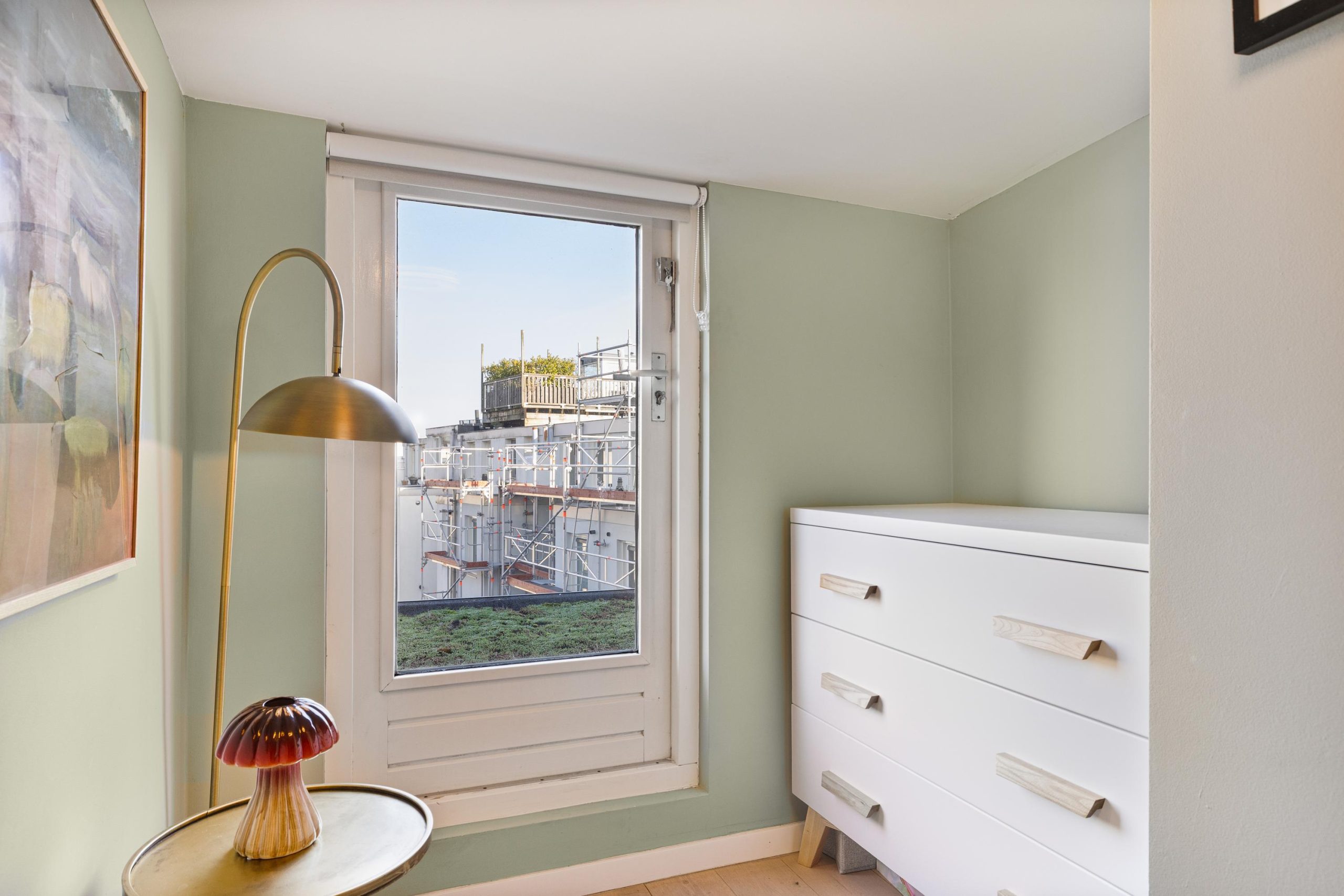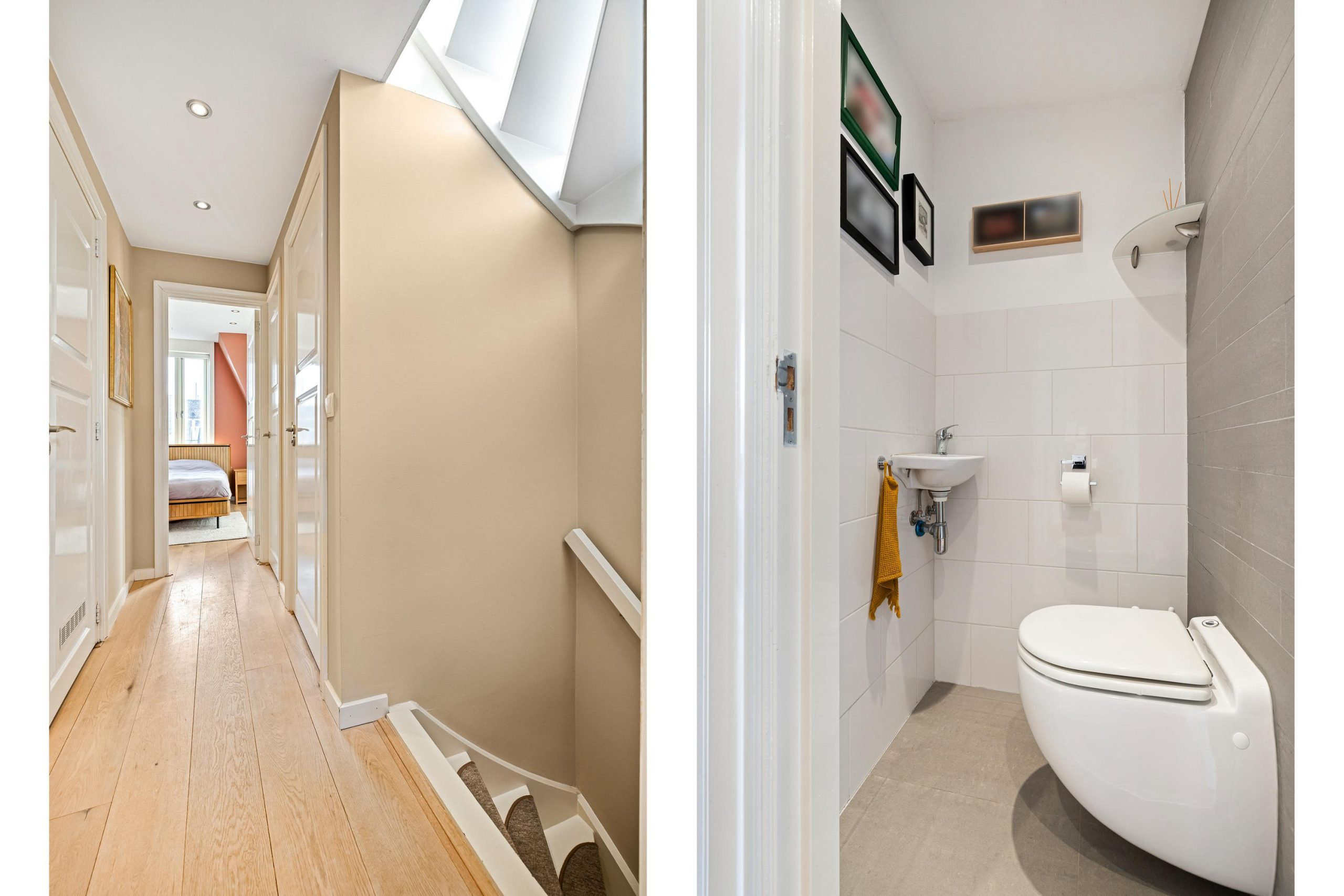 Located on own ground (no groundlease), in the heart of the popular Staatsliedenbuurt, this beautiful double upper-floor apartment is spread over the top two floors. The property has three bedrooms, a balcony, and a generous roof terrace of 30 m².