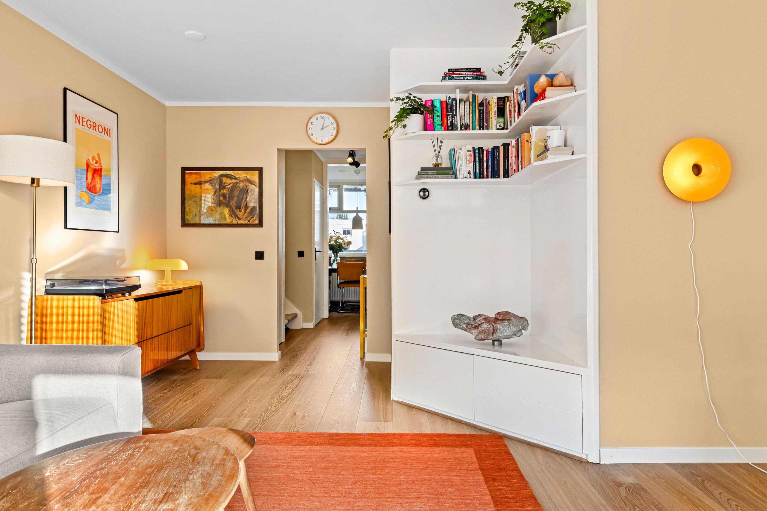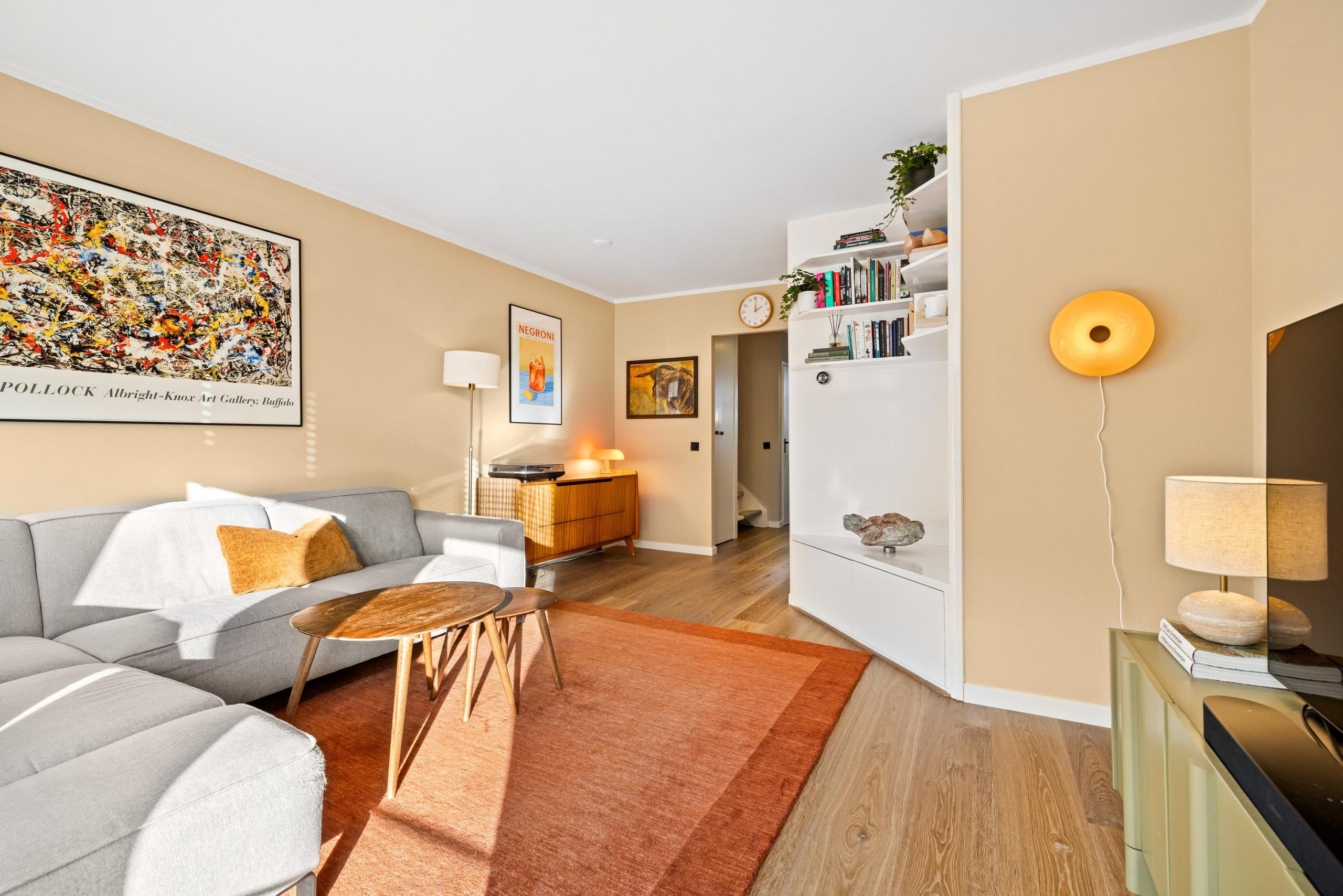 This is where the entrance to the apartment is located. The spacious living room at the front of the apartment is wonderfully bright thanks to three large windows. At the back is the open-plan kitchen/diner with space for a dining table. The modern kitchen (2013) is arranged in a practical corner layout and is equipped with a 5-burner gas hob, dishwasher, refrigerator (2021), freezer, combination oven, extractor hood, and a wine cooler. From the kitchen, you step directly onto the balcony, offering a view over the gardens.
