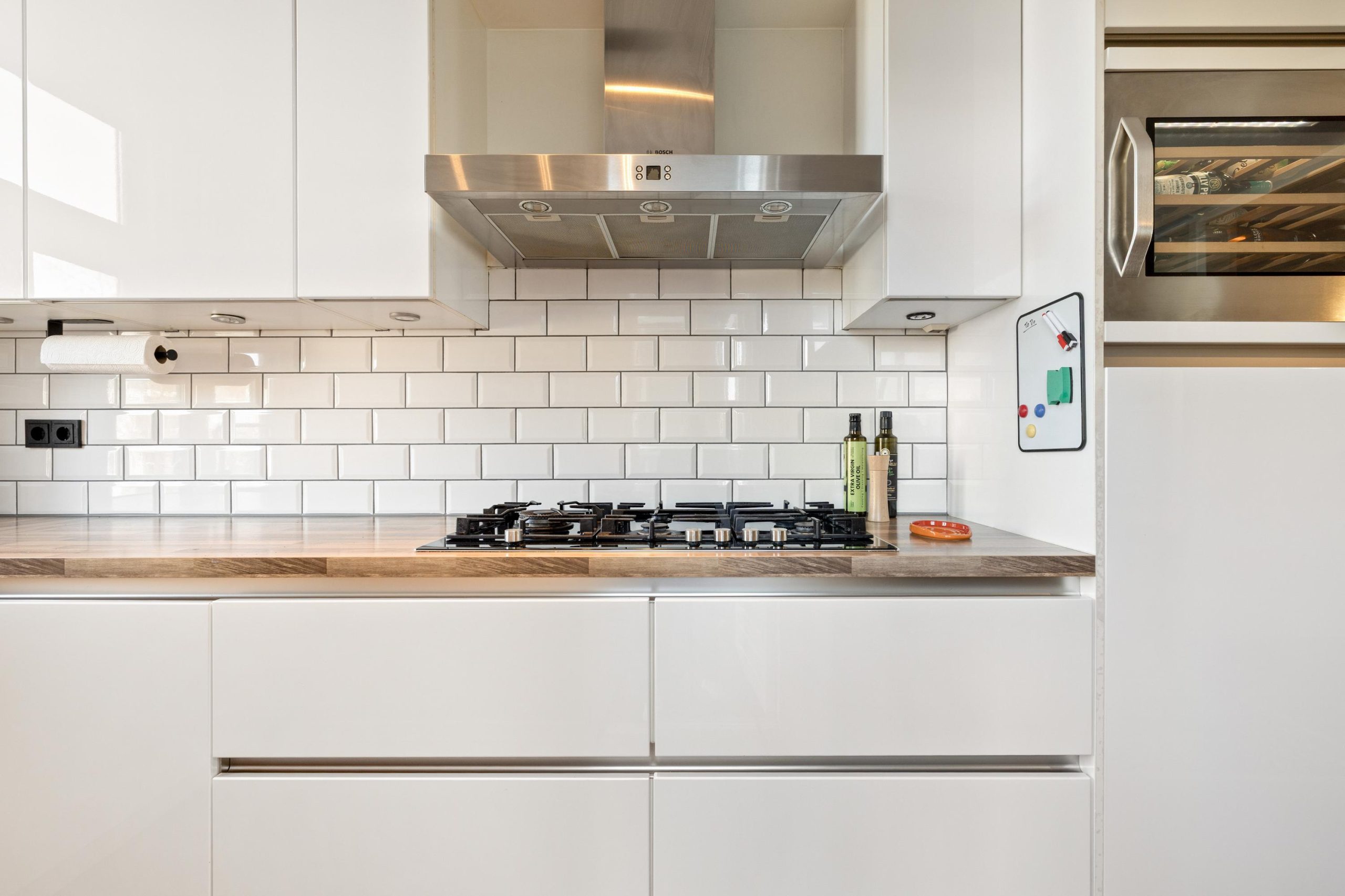 Hier is de entree naar het appartement. De ruime woonkamer welke is gelegen aan de voorzijde van het appartement is heerlijk licht dankzij drie grote ramen. Aan de achterzijde bevindt zich de woonkeuken met voldoende plek voor de eettafel. De moderne keuken (2013) is uitgevoerd in een praktische hoekopstelling en voorzien van een 5-pits gasfornuis, vaatwasser, koelkast (2021), vriezer, combioven, afzuigkap en een wijnkoeler. Vanuit de keuken stap je zo het balkon op, met vrij uitzicht over de binnentuinen.