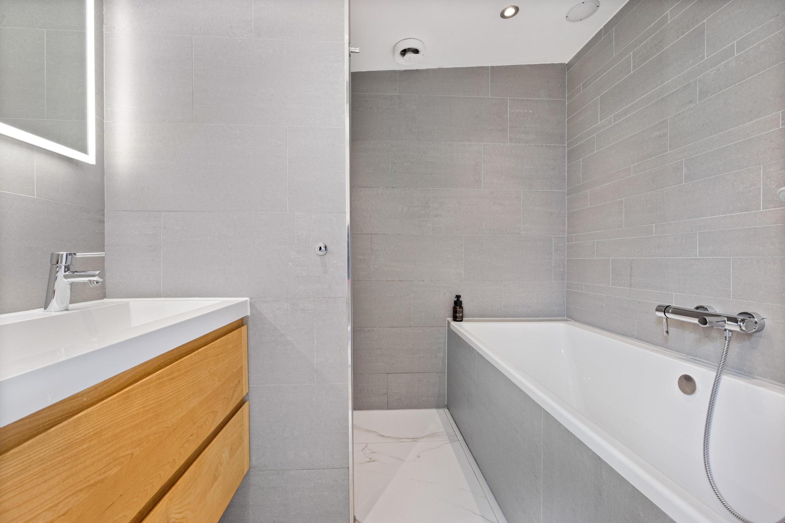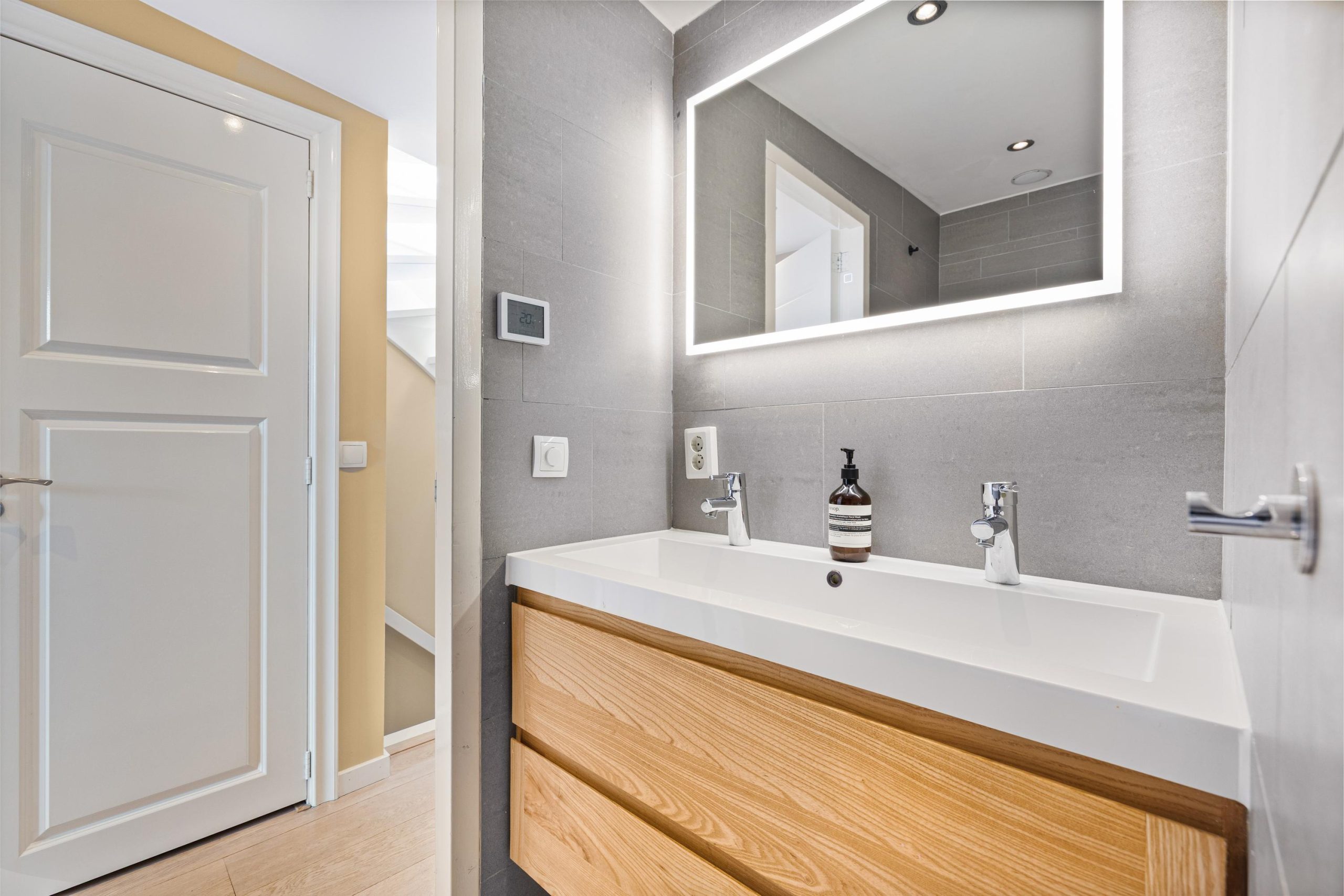 De moderne badkamer is netjes betegeld en voorzien van ruime inloopdouche, ligbad, dubbele wastafel met meubel en vloerverwarming. Het plafond is keurig strak gestuct en voorzien van sfeervolle inbouwspots. Tegenover de badkamer bevindt zich een tweede toilet met sanibroyeur en fontein. Via een vaste trap bereik je de eyecatcher van de woning; het dakterras!