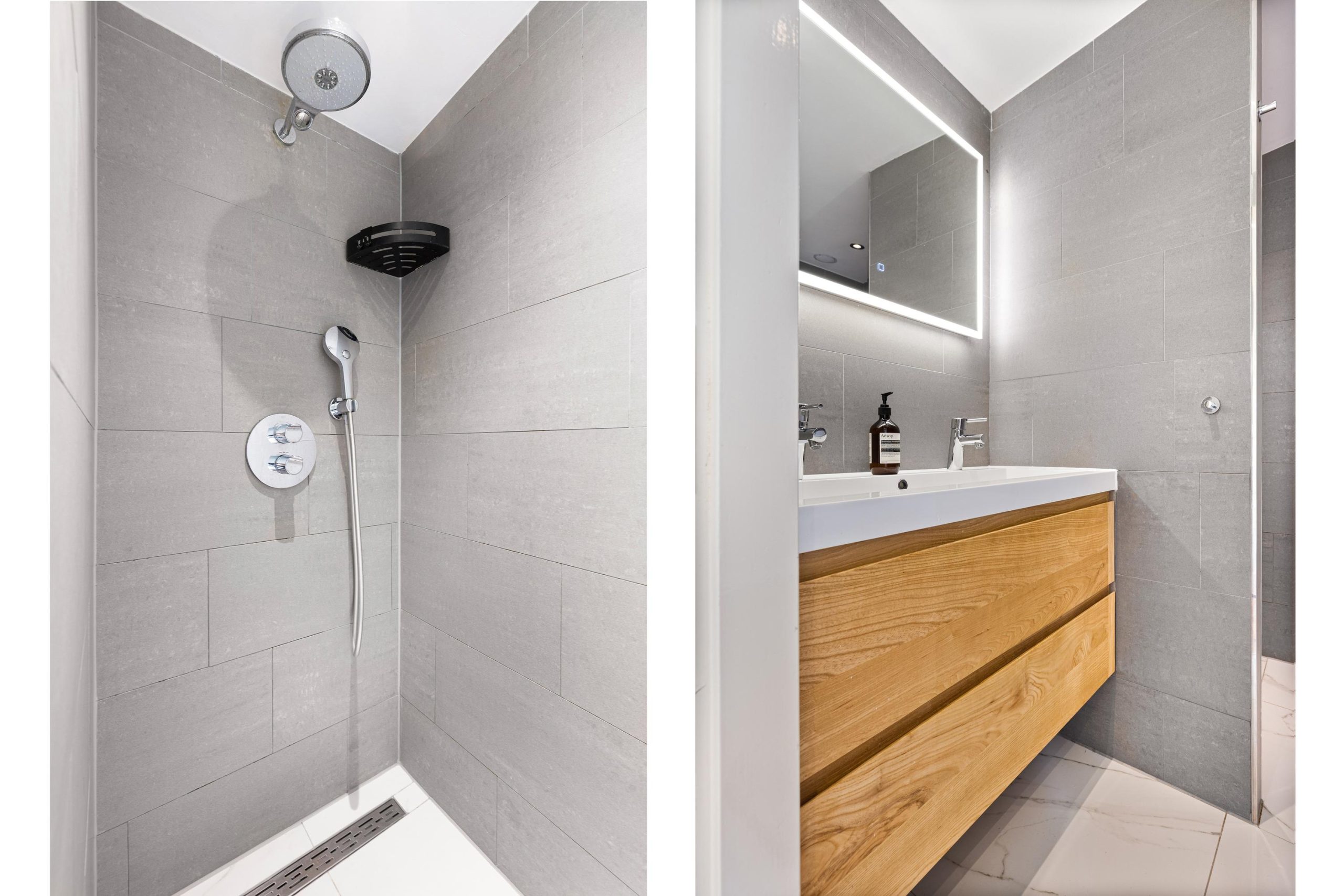 The modern bathroom is neatly tiled and fitted with a spacious walk-in shower, bathtub, double washbasin, and underfloor heating. The ceiling is smoothly plastered and fitted with atmospheric dimable spotlights. Opposite the bathroom is a second toilet with sanibroyeur. A fixed staircase leads to the eye-catcher of the property: the roof terrace!