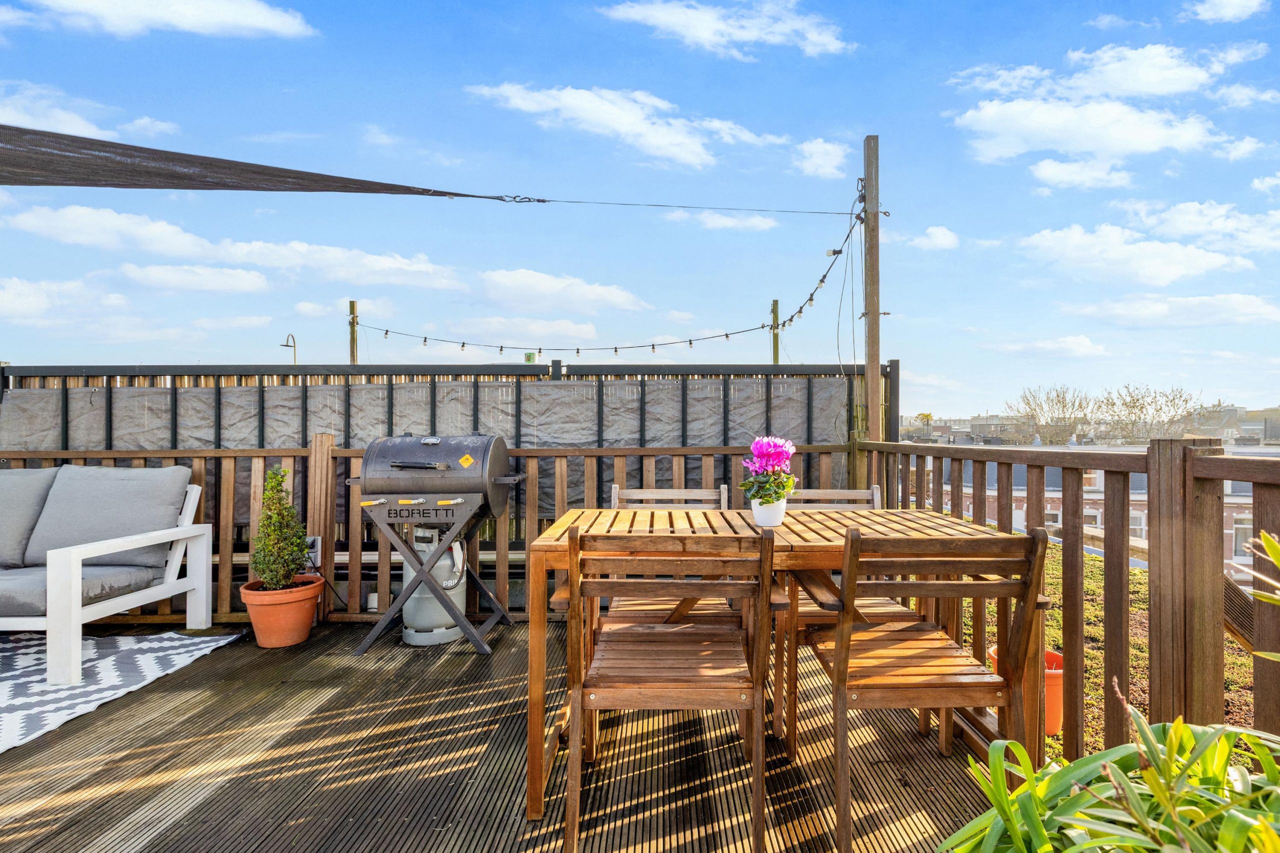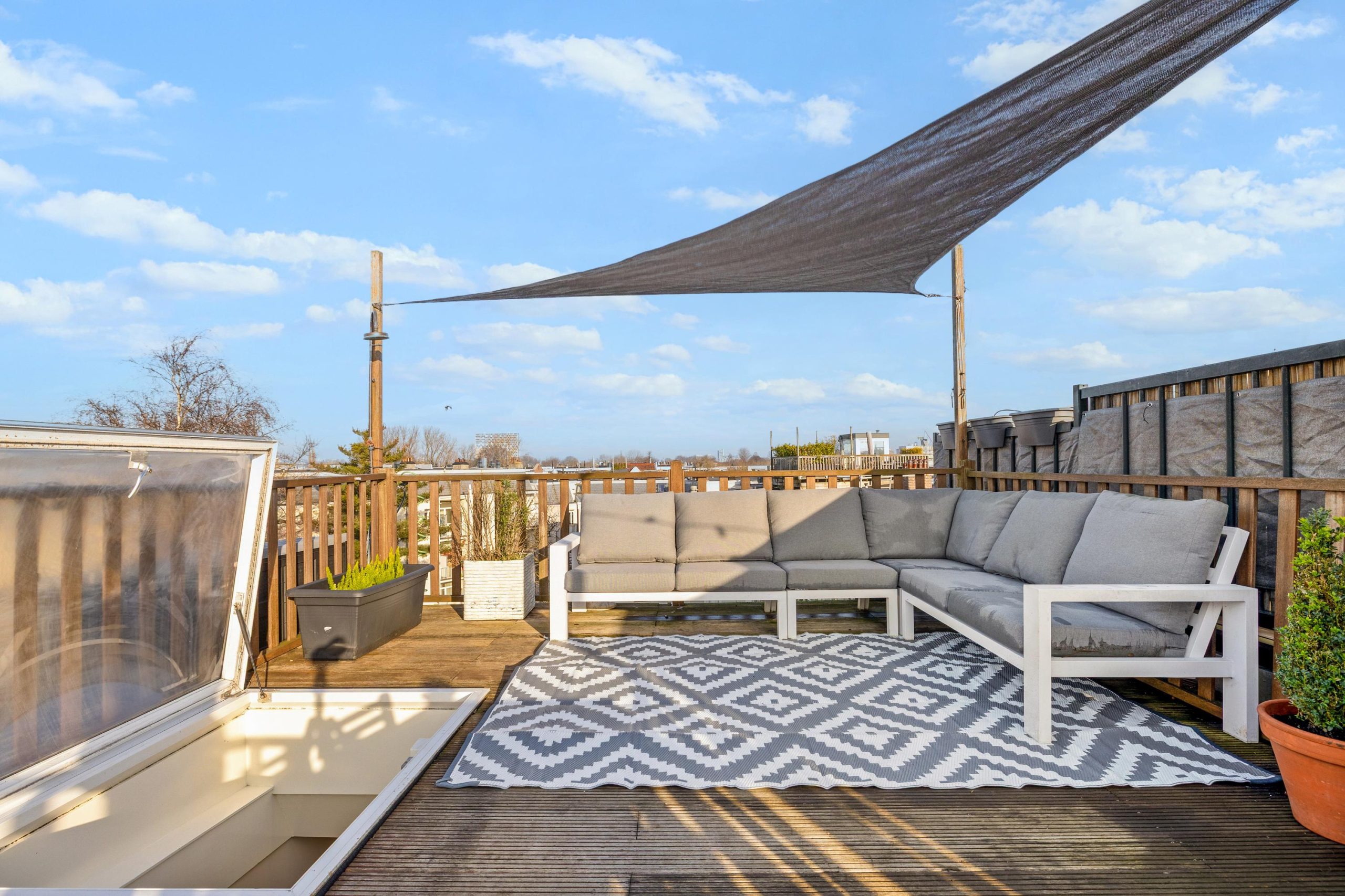 Dit fantastische dakterras heeft een oppervlakte van ca. 30m² met vrij uitzicht over de stad. Hier geniet je de hele dag van zon, rust en privacy. Het dakterras is voorzien van elektriciteit, een warm- en koudwaterdouche en een stevige constructie voor schaduwdoeken – de perfecte plek voor lange zomeravonden met familie en vrienden met een hapje en een drankje.